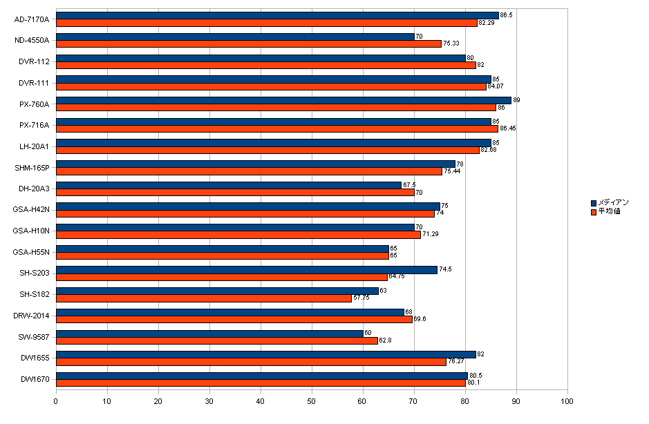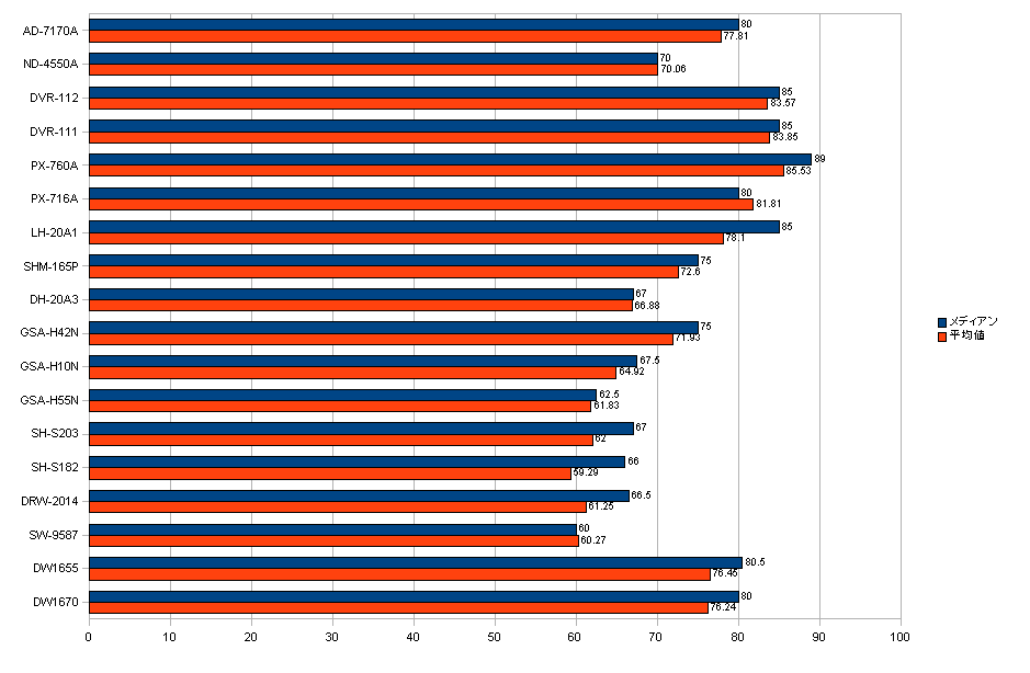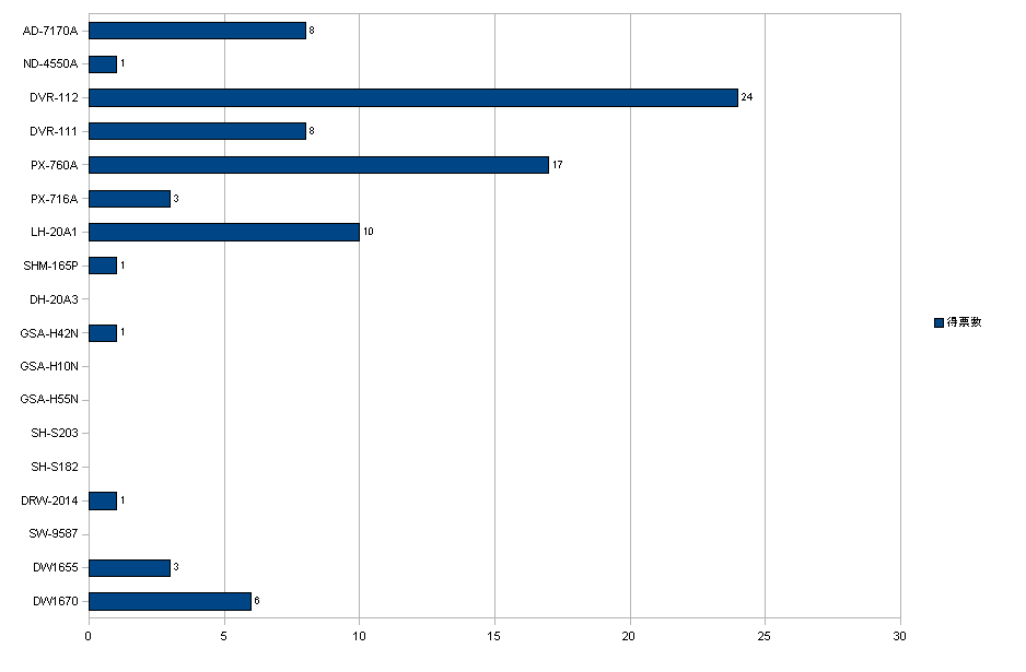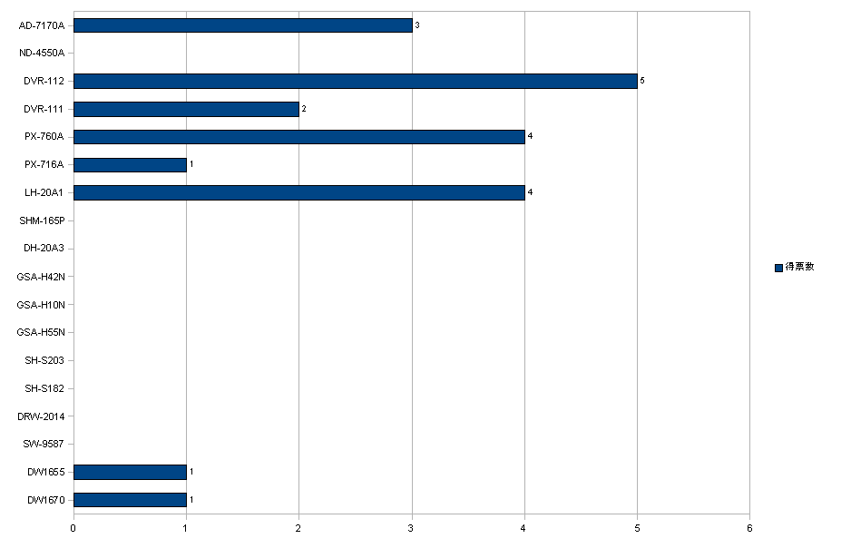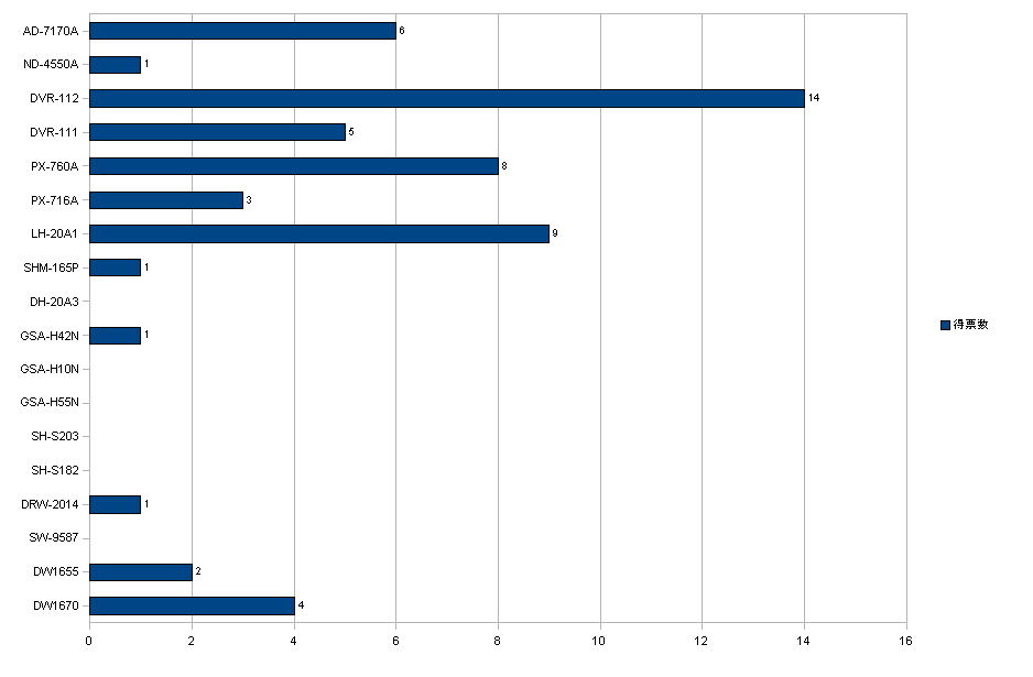 11/16 AM0:50までの投票総数は21通です。 とりあえず得票数、及び評価値の平均値とメディアンをグラフ化してみました。 今回はCDのリコール問題が相当な悪印象だったのか、今のところDVR-112の独走状態って事は起こってませんね。 コメントにもやはりCDが糞だとかリコール分マイナスだとかそういうのが多かったです。