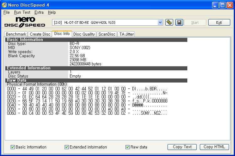 ---------------------------------------------------------------------------- Unique Disc Identifier : [BD-R-SL:SONY-NS2-002] ---------------------------------------------------------------------------- Disc Type : [BD-R SL : Class 0 - Version 1] Manufacturer Name : [Manufacturer Not Found In Database] Manufacturer ID : [SONY] Media Type ID : [NS2] Product Revision : [002] Stamper Date : [Not Present On Disc] Layer Info : [1 Layer (L0) : 25.03 GB (23.31 GiB) Per Layer] Blank Disc Capacity : [12,219,392 Sectors = 25.03 GB (23.31 GiB)] Recording Speeds : [1x , 2x , 4x] ---------------------------------------------------------------------------- [ DVD Identifier V5.0.1 - http://DVD.Identifier.CDfreaks.com ] ----------------------------------------------------------------------------