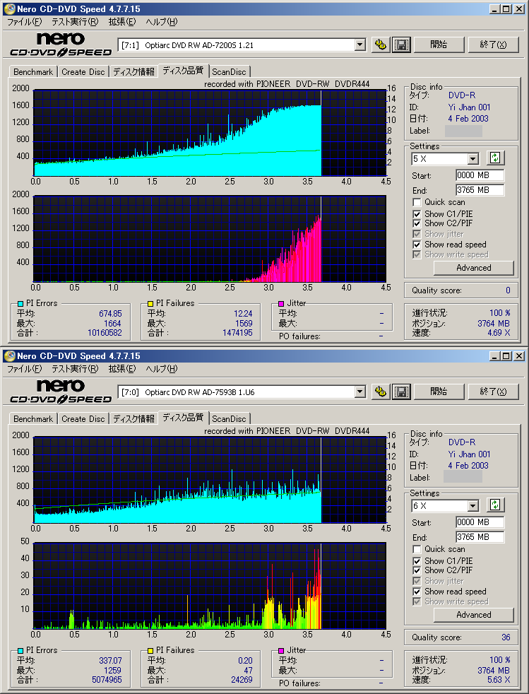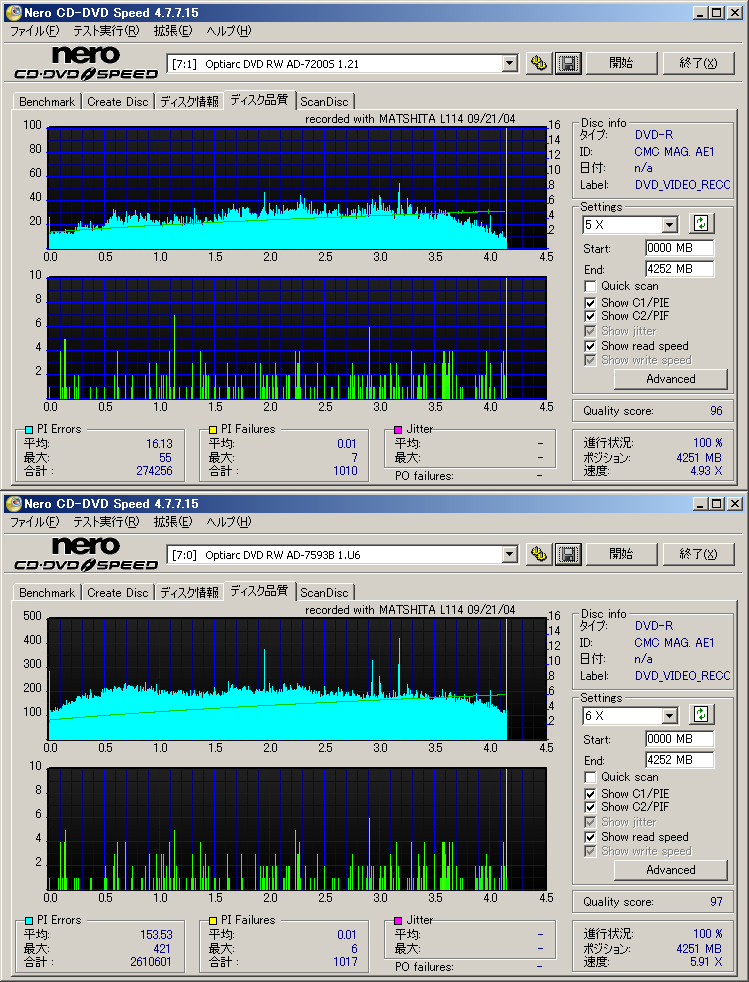 ここでは、AD-7200S がスリムタイプの AD-7593B に 比べ PIE が小さくなっていますが、どちらもエラー訂正 で読むことができました。