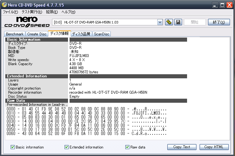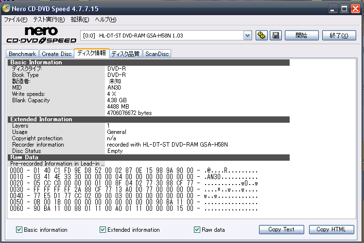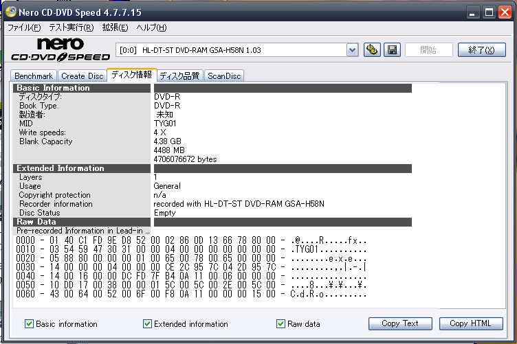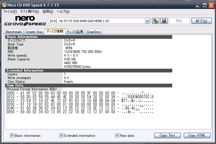 メーカ製デスクトップパソコンを4年前くらいに買ったときにおまけでついてきた オリジナルグッズ3点セットのバザールでござーるレーベルの8倍速DVD-R 中身はなんの変哲のないTYG02でした Nero CD-DVD Speed: Disc Info Basic Information ディスクタイプ: : DVD-R Book Type : DVD-R 製造者: : 未知 MID : TYG02 Write speeds: : 4 X - 6 X - 8 X Blank Capacity : 4.38 GB : 4489 MB : 4707321856 bytes Extended Information Layers : 1 Usage : General Copyright protection : n/a Recorder information Disc Status : Empty Raw Data Pre-recorded Information in Lead-in (0Eh) 0000 - 01 40 C1 FD 9E D8 52 00 02 87 0D 10 66 78 80 00 - .@....R.....fx.. 0010 - 03 54 59 47 30 32 00 00 04 00 00 00 00 00 00 00 - .TYG02.......... 0020 - 05 AA A2 22 22 20 02 00 F0 FF FF FF A8 C1 19 00 - ...""........... 0030 - AC 0A 12 00 6D 8E 1A 77 04 00 00 00 A4 0A 12 00 - ....m..w........ 0040 - D8 99 D0 77 00 80 00 00 C4 0A 12 00 8D 3F 1A 77 - ...w.........?.w 0050 - 00 80 00 00 58 02 71 0E FC FF FF FF 00 00 00 00 - ....X.q......... 0060 - 01 00 00 00 A8 C1 19 00 F8 0A 12 00 00 00 16 00 - ................