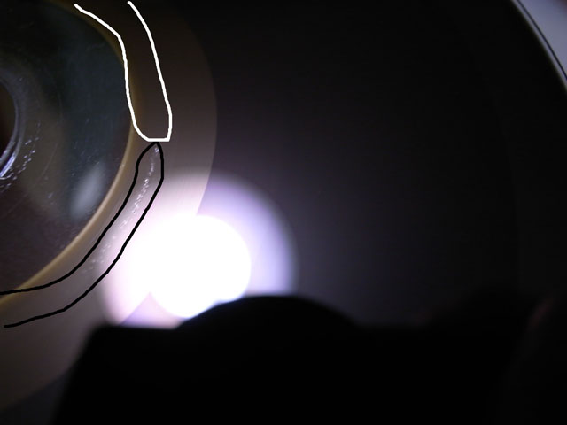 しかしこの跡も途中で切れいて、白い線で囲った部分はこの跡がありませんでした。この跡がなかった部分は3枚目の写真のようにケースの穴が開いている部分と一致しました。