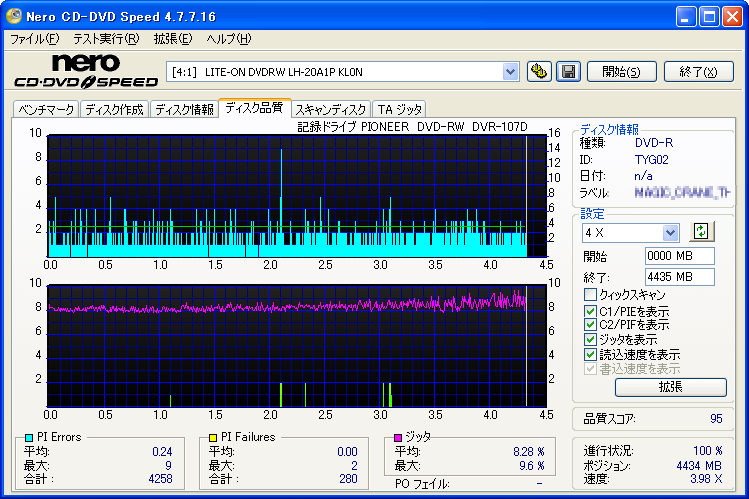 【メディア名】 太陽誘電×8 TYG02 【焼きドライブ】 DVR-A07 【焼き速度】 ×6 【焼きソフト】 imgburn 2.4.4.0 【計測ドライブ】 LH-20A1P 【計測ソフト】 Nero CD-DVD Speed 4.7.7.16