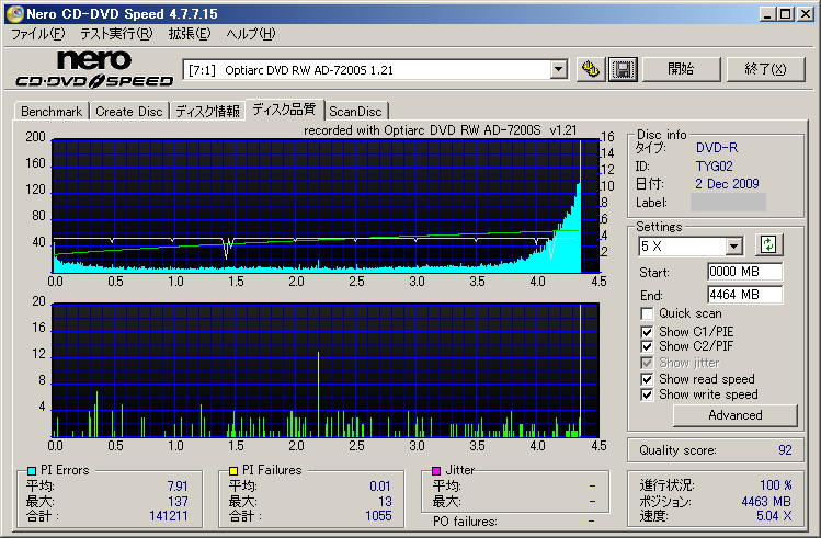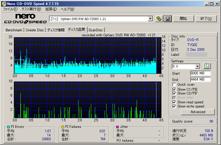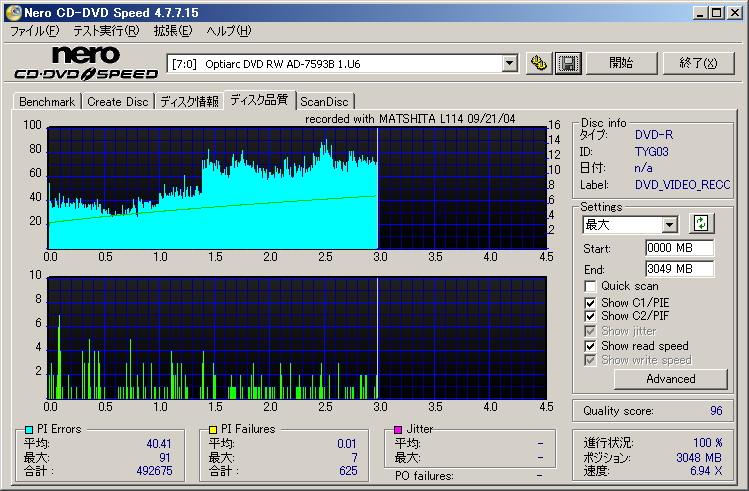 ...が、TYG02 も先週買ったものは悲惨でした。 そもそも8倍速で焼けず、すべて減速してしまいますし、 エラーも添付画像のように不自然なものが半数近く。 DVD-R記録面を見てもほとんどわからないのですが、 1枚だけ、直径 2mm ほどの丸い色素の変色が 見られました。