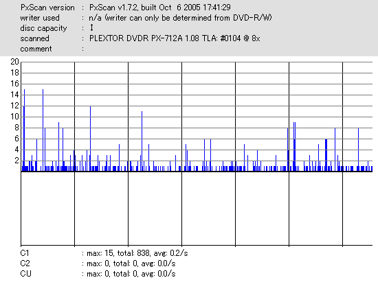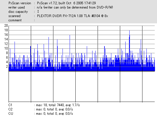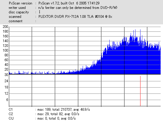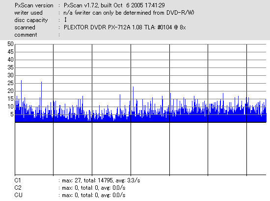 音楽用を謳うわけでもなし、ただデータ用としてmasterとなる品質を追求した太陽誘電のCD-Rメディアだけあって、 さすがにエラー値では他のメディアの群を抜いてます。 DW1655計測、PX-712SA計測共にC1エラーがTotalで1000切り・・・・・・恐るべき結果です。 |