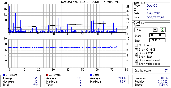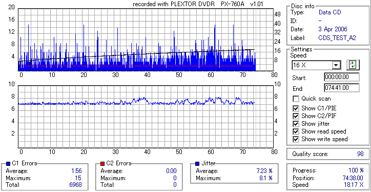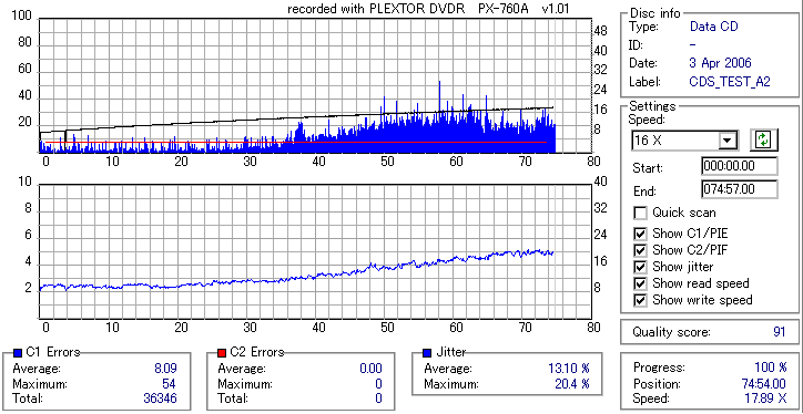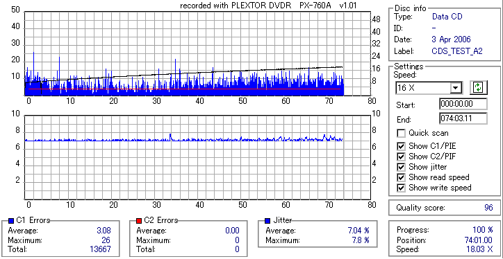 TDKのTHEORYといえばCD-Rの中では特に高級メディアとして定評のあるものだったのですが、 PX-760Aとの相性が良くなかったのか、それとも単にハズレだったのか、 4倍焼きにも拘らず外周でC1エラーが増大しC2まで吐いてしまうという海外粗悪メディアと変わらん結果になってしまいました。 Jitterも外周部で増大してるので、正直音質以前の話だと思います。 GREEN TUNE vs THEORYなんて表題を掲げておいて誠に残念ですが、これは比較対照外ってことで。 |