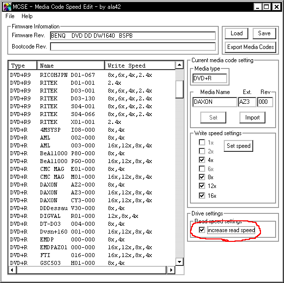 ファームウェアとしては12倍速記録のアルゴリズムもしっかり記録されており、ツールを使用して制限を行うことで初めて利用可能になります。
