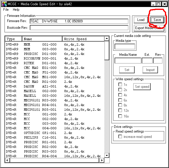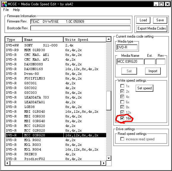 下の例では、TEAC DV-W516Eの16xチェックをはずすことで、一部16倍速メディアの記録速度を12xに制限することができます。