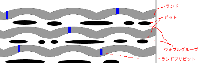 このウォブルとランド部に一定の規則で刻まれたランドプリピットによってデータのアドレッシングを行います。
