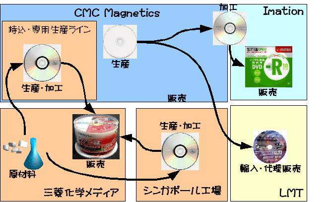 三菱化学メディアは早くから海外拠点(シンガポール)での生産という地位を確立し、現在では台湾CMC Magnetics社や台湾Prodisc社等の工場へ