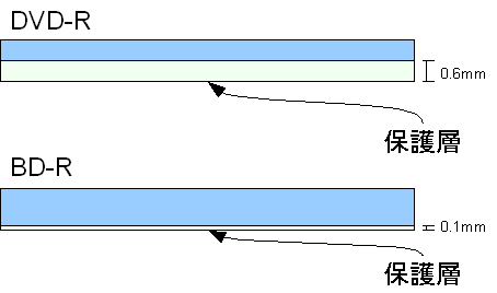 DVD-Rは記録面に対する保護層が0.6mm厚であるのに対し、BD-Rはわずか0.1mmの厚さしか存在しません。