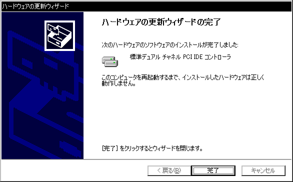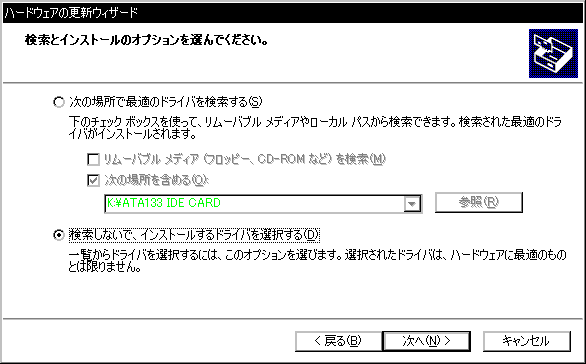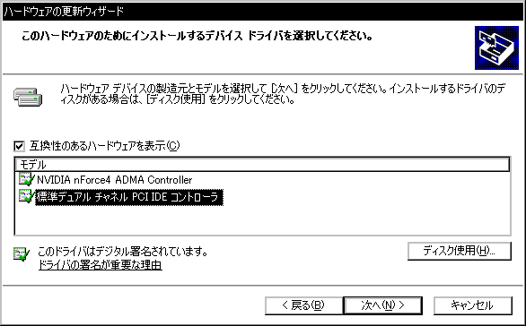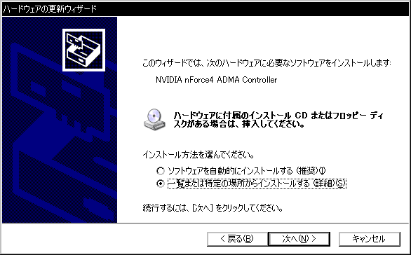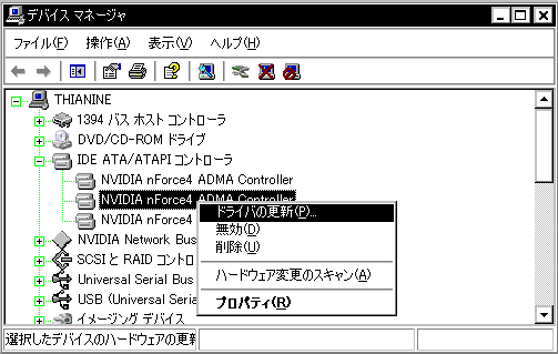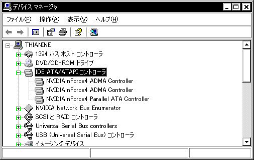 nForce系マザーは下図のように、ADMA ControllerというものでSATAを管理しています。 これは見やすくて管理が大変便利なんですが、光学ドライブを接続した際には時に書き込みが正常に行えないことがあります。 ![]() プロパティを開くとこんな感じです。SATAにはスレーブは存在しないので、常にNo Deviceと表示されます。 ![]() こういう場合、IDEチャネルの認識にnForceのドライバを用いず、Windows標準のドライバを使用するとうまくいくことがあります。 1. デバイスマネージャから対象のSATAコントローラを右クリックし、ドライバの更新を選択します。 ![]() すると、ハードウェアの更新ウィザードが開始されます。WindowsXPのSP2以降ではWindows Updateへの接続を確認されますが、 時間もかかって面倒ですから今は接続する必要はありません。飛ばして次に行きましょう。 ![]() 通常はここでドライバCDなどを入れて自動的に検索してもらうところですが、ここは手動でインストールを行います。 ![]() ドライバの検索も行わず、既存のドライバから選択します。 ![]() 現在使用しているnForce ADMA Controllerの他に、 Windows標準のデュアルチャネルPCI IDEコントローラが表示されますので今回はそちらを選択してやります。 ![]() しばらくインストールを行った後、インストール完了の画面が表示されます。後はPCを再起動すればOKです。 ![]() 管理は面倒になりますが、SATAに光モノを繋いだときの正常稼働率は標準のドライバの方が高いようです。 ただ、IDEもSATAも山のようについてるnForce4なんかでこれをやると・・・・・・ ![]() こんなことになってわけのわからない状態になってしまいますのでその点には注意。 |