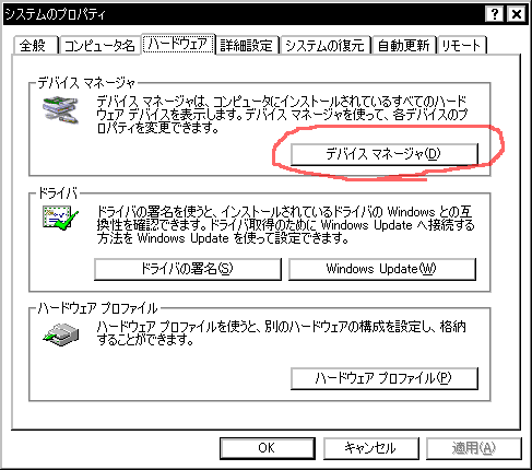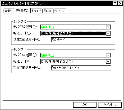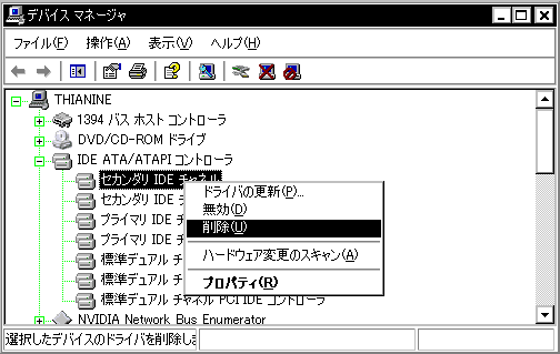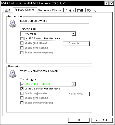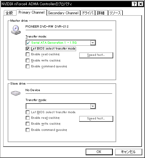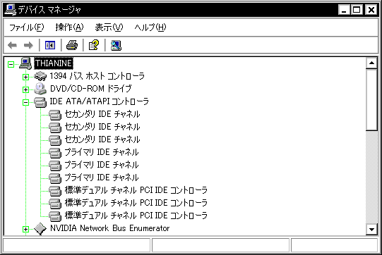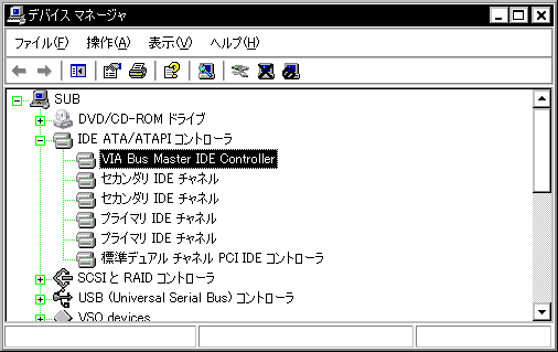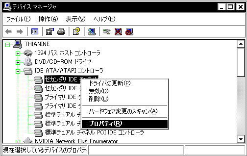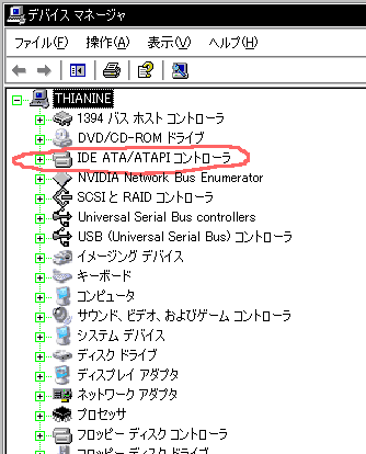 PIO病って何? PIO病とは、Windowsが何らかの原因でデバイスをPIOモードで認識してしまい元に戻らなくなっている状態です。 ATA/ATAPI機器では転送モードが2種類存在します。一つはDMAと呼ばれるモードで、データの転送をCPUを介さず行う方法です。 そしてもう一つがPIOと呼ばれるモードで、CPUがデータ転送の管理をするため効率が悪く、速度が出ない上処理も重くなります。 PIOモードの利点はDMAに比べ処理が単純で安定していることであり、普段DMAで動いている機器に何か問題が起きた際に 代替措置としてOSがPIOモードで機器を動作させてしまうことがあり、そのまま戻らなくなってしまっているのがPIO病です。 PIOモードで動いている機器は転送速度が遅く、転送処理にCPUを食ってしまうため、 ・記録速度やデータの転送速度が異常に遅い ・ファイルの転送中システムがやたらと重くなる こういった症状が発生している場合、PIO病を疑うべきかもしれません。 治すにはどうしたらいい? この症状はそもそもWindowsのATA/ATAPIデバイスドライバがPIOモードで固定してしまったまま離さないため起こるものなので、 マザーボード側の制御プログラムからはちゃんとDMAモードで認識されている場合がほとんどです。 OS側のドライバをなんとかしてやれば解決するので、一旦ドライバ側にデバイスを再認識させてやる必要があります。 症状が発生しているIDEチャネルを削除して再認識させることで解決できます。 1. デスクトップ左下の「スタート」から『コントロールパネル』を開きます。 ![]() 2. 『パフォーマンスとメンテナンス』→『システム』を開きます。クラシック表示にしている人は直接『システム』を開けばOKです。 ![]() ![]() 3. 『ハードウェア』のタブから『デバイスマネージャ』を開きます。ここまでの説明がデバイスマネージャの開き方です。 デバイスマネージャはハード系のトラブルの際には覗くことの多い所です。開き方はしっかり覚えておきましょう。 ![]() ![]() 4. デバイスマネージャを開いたら、「IDE ATA/ATAPIコントローラ」という項目がありますので、 その左側の+マークをクリックして展開表示します。 ![]() おかしくなってると思われる機器が接続されているIDEチャネルを右クリックして、プロパティを開きます。 ![]() ※(注) IDEチャネルが一つじゃない場合・・・・・・ 最近のマザーボードはSATAが標準搭載されているものが多く、SATAが標準のIDEコントローラとして認識されていると 下図のようにプライマリとセカンダリのIDEチャネルがそれぞれ2つずつ存在するというややこしい事態が発生します。 下図の例では、VIA Bus Master IDE Controllerというやつがそれぞれ上側のプライマリ/セカンダリチャネルを生み出しており、 更に「標準デュアルチャネル PCI IDEコントローラ」というやつがそれぞれ下側のチャネルを発生させています。 下図の例では標準〜で発生している方のIDEチャネルがSATAのものなので、普通のIDEに接続した機器に問題が起きてる場合は 上側のIDEチャネルを調べれば良いわけです。ややこしいですね。 ![]() 5. IDEチャネルのプロパティを開き、問題が起きている機器の位置を確認します。 (マスターならデバイス0、スレーブならデバイス1です。マスターとスレーブが何か判らない場合は基礎の基礎の3を読み返してください) 『現在の転送モード』がDMAになっていればそのデバイスは正常に動作していますが、PIOになっていたらPIO病が発生しています。 ![]() 6. 問題の発生しているチャネルを右クリックし、一旦削除します。 ![]() 7. 「操作」のタブからハードウェア変更のスキャンを行い、削除したチャネルを再認識させます。 ![]() あとはシステムを再起動させれば、PIO病は治っているはずです。 基本的にデバイスを再認識させればいいわけですから、IDEチャネルを削除するのにどうしても抵抗があるという方は 「PCの電源を切る」 → 「問題の起きているドライブを一旦はずす」 → 「ドライブをはずしたままPCを起動させて数分放置」 → 「PCの電源を切る」 → 「ドライブを再度接続する」 → 「PCを起動」 という方法でも問題は解決できるはずです。2回再起動するのが嫌な人は 「PCの電源を切る」 → 「問題の起きているドライブと他の位置に接続された別のドライブを付け替える」 → 「PCを起動」 でもいけるはず。 ※(注) IDEチャネルがデバイスマネージャに無いんだけど・・・・・・ nForce系のマザーボードはATAコントローラがチャネルごとではなく一括で管理されているので、IDEチャネルは表示されません。 パラレルATAコントローラのプロパティを開くと…… ![]() このように、プライマリマスターとセカンダリマスターの設定が可能です。 通常、「Let BIOS select transfer mode」という所にチェックを入れればDMAモードで認識されますので設定も楽です。 万一transfer modeがPIOになってたりしたらDMAに戻してやりましょう。 ![]() ![]() |