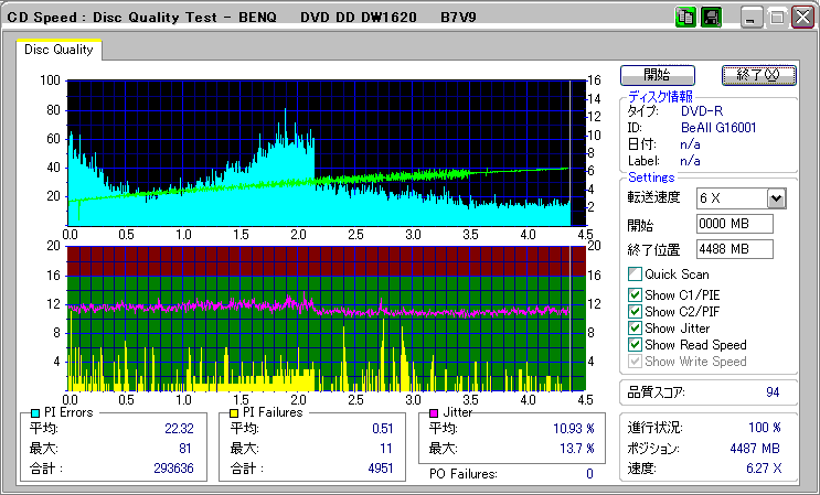 CDSpeed + BenQ DW1620Rの品質テスト(6x CAV PIE/PIF/Jitter/POF)