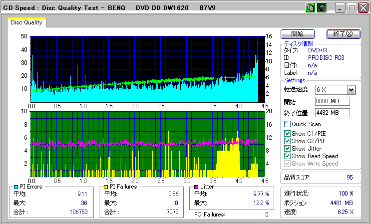 CDSpeed + BenQ DW1620Rの品質テスト(6x CAV PIE/PIF/Jitter/POF)