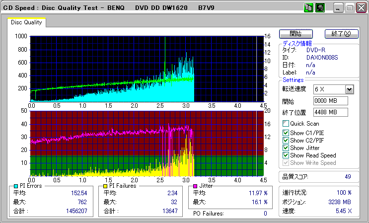 CDSpeed + BenQ DW1620Rの品質テスト(6x CAV PIE/PIF/Jitter/POF)