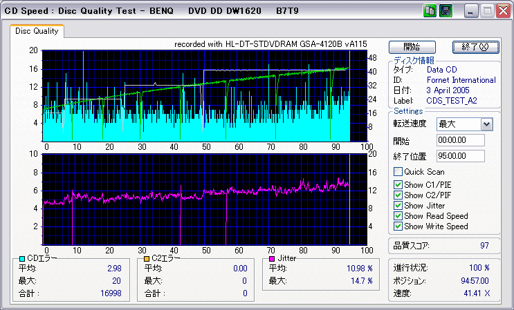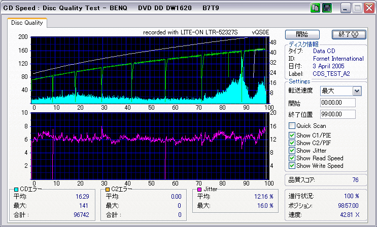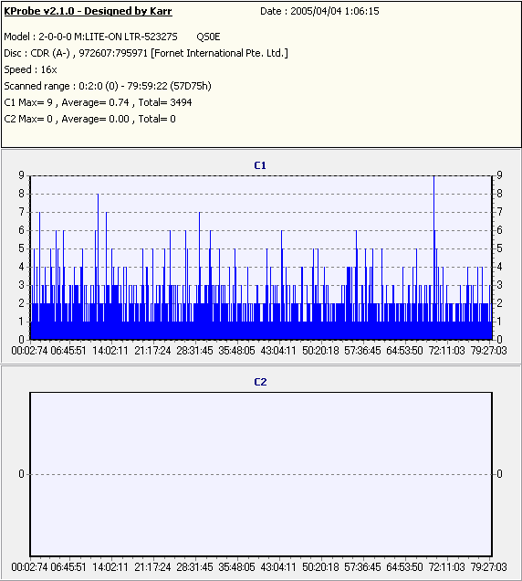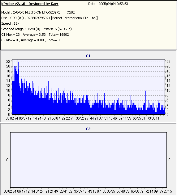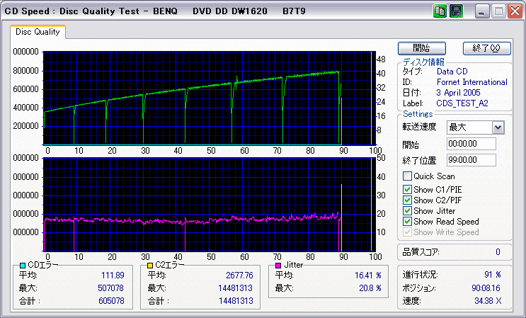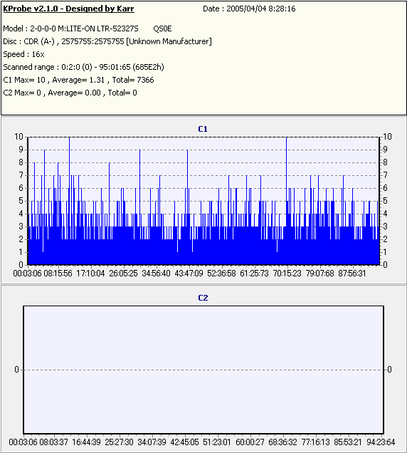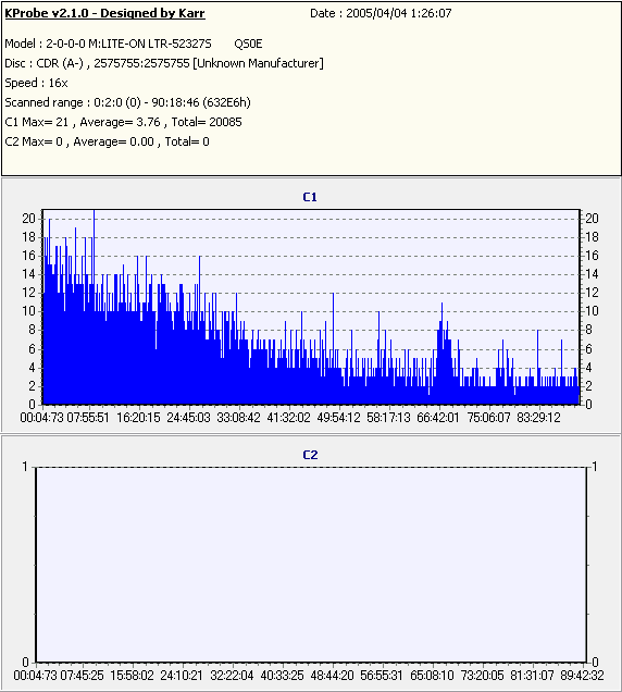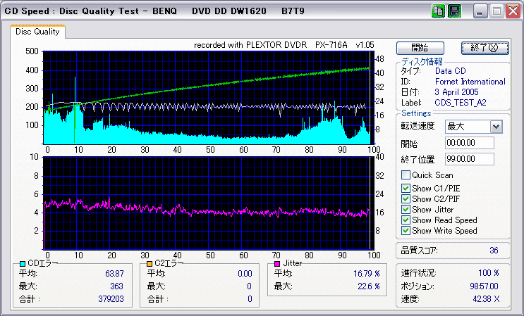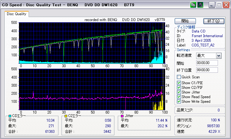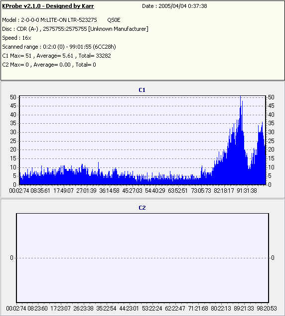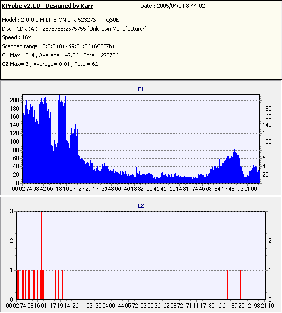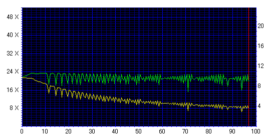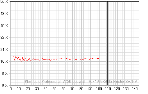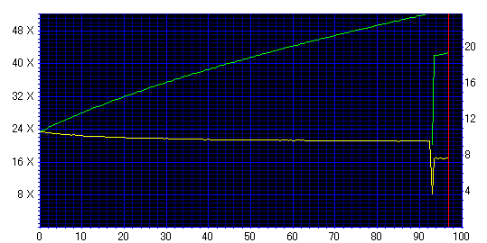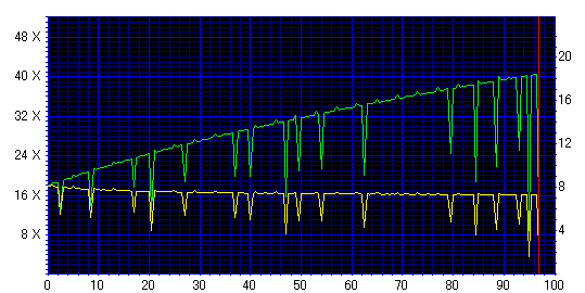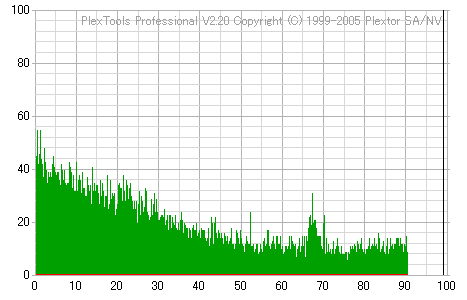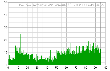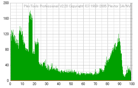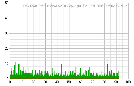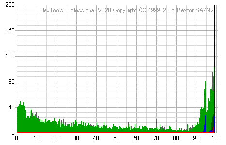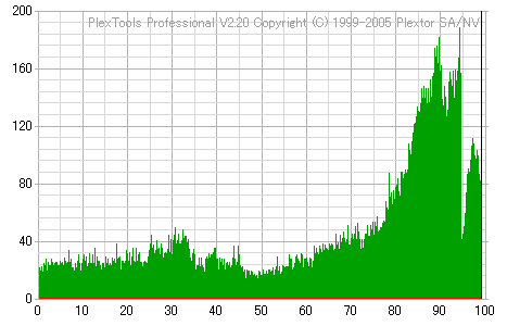 内周でややエラー高し。容量限界まで焼いたためリードアウト書き込み時にエラーで止まってしまい、
