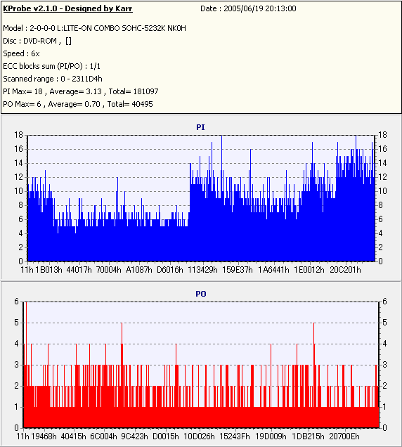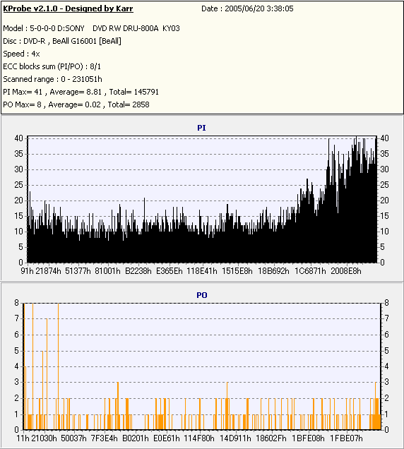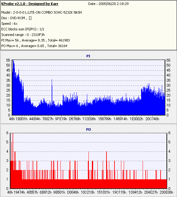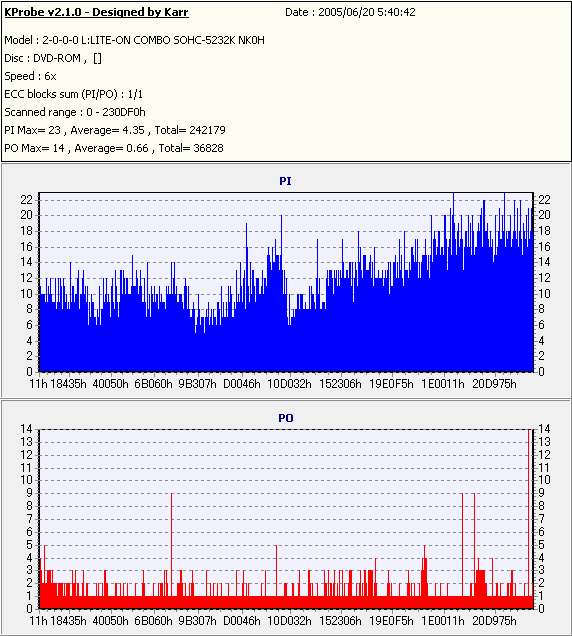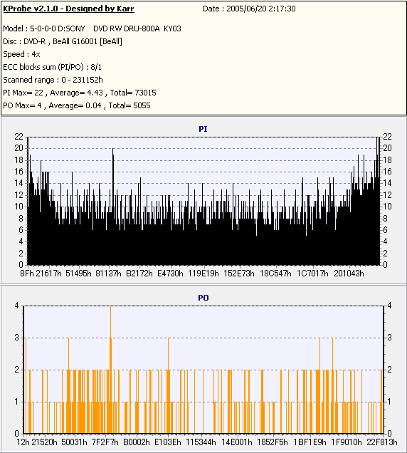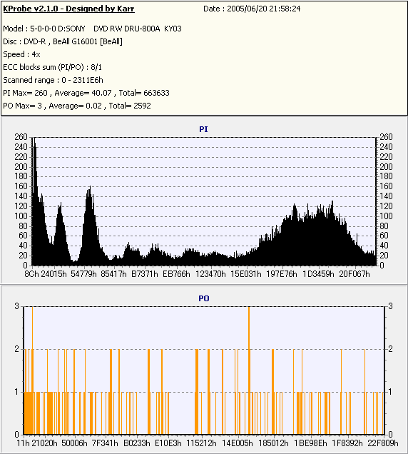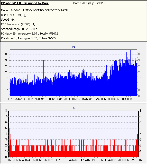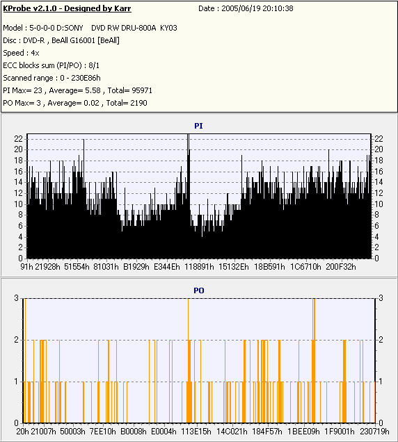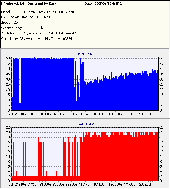 ![]() Kprobe + LITE-ON SOHC-5232Kでの1/1ECC Sum 6x CAV計測 Kprobe + SONY DRU-800Aでの8/1ECC Sum 4x CLV計測 PlexTools Professional + PLEXTOR PX-716AのPI/PO 8ECC Sum Test(速度2 クリックで詳細表示) ![]() PlexTools Professional + PLEXTOR PX-716AのTA Test(クリックで詳細情報を表示) ![]() ![]() ![]() CDSpeed + BenQ DW1620Rの品質テスト(6x CAV PIE/PIF/Jitter/POF) ![]() DVDInfoPro + Pioneer DVR-108のPI/PO Test(PIE/POE) |