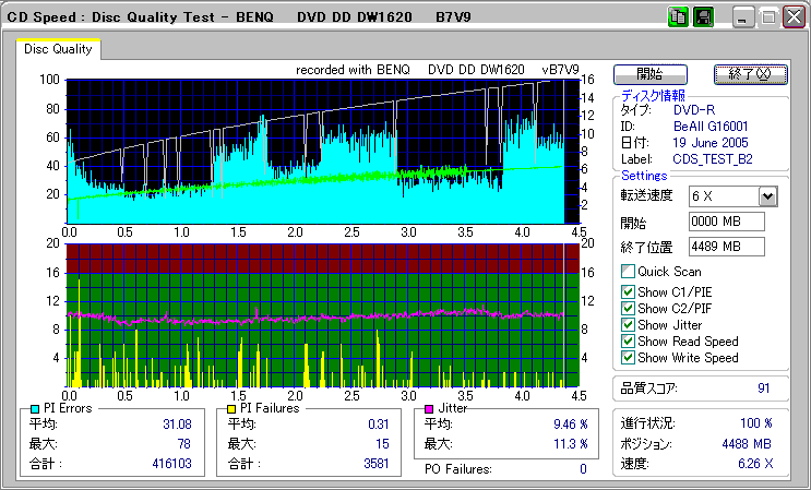 ![]() PlexTools Professional + PLEXTOR PX-716AのTA Test(クリックで詳細情報を表示) ![]() ![]() ![]() CDSpeed + BenQ DW1620Rの品質テスト(6x CAV PIE/PIF/Jitter/POF) マウント不能 DVDInfoPro + Pioneer DVR-108のPI/PO Test(PIE/POE) |
