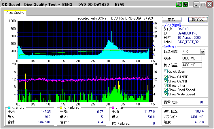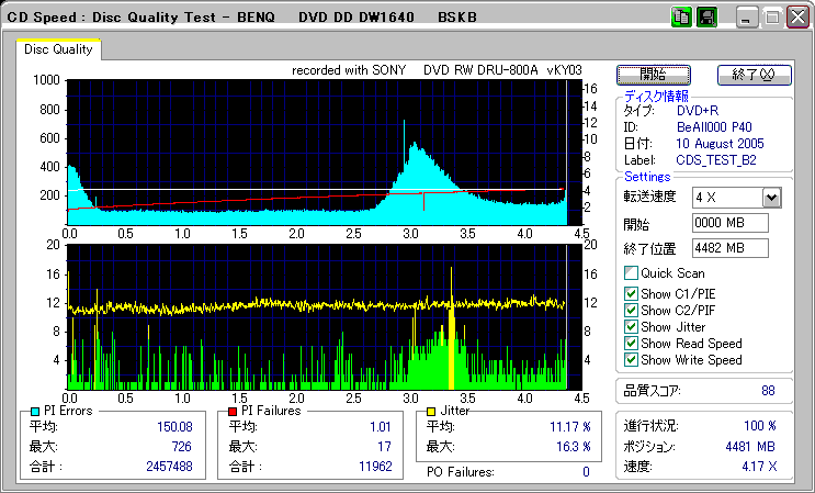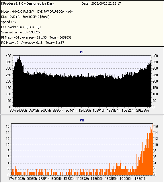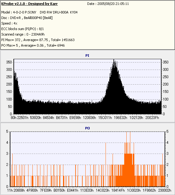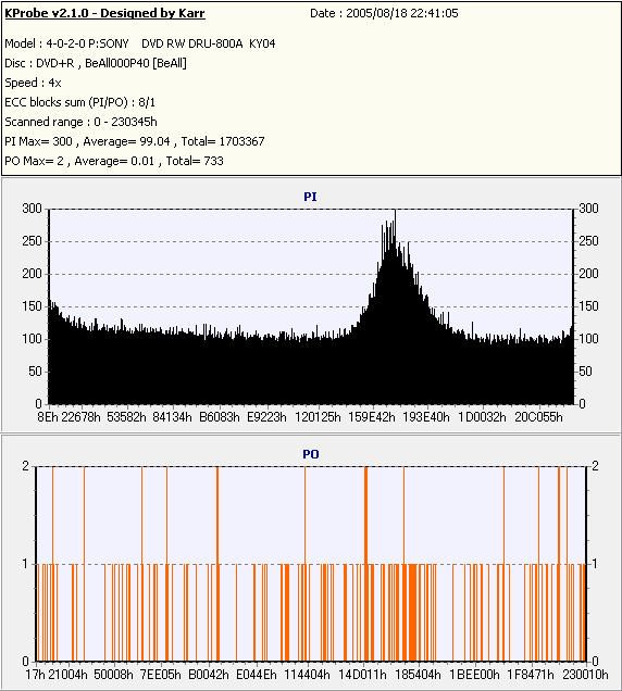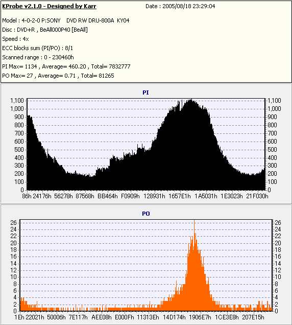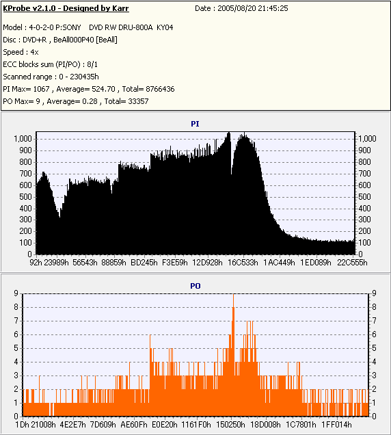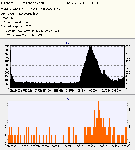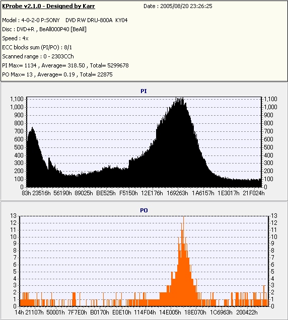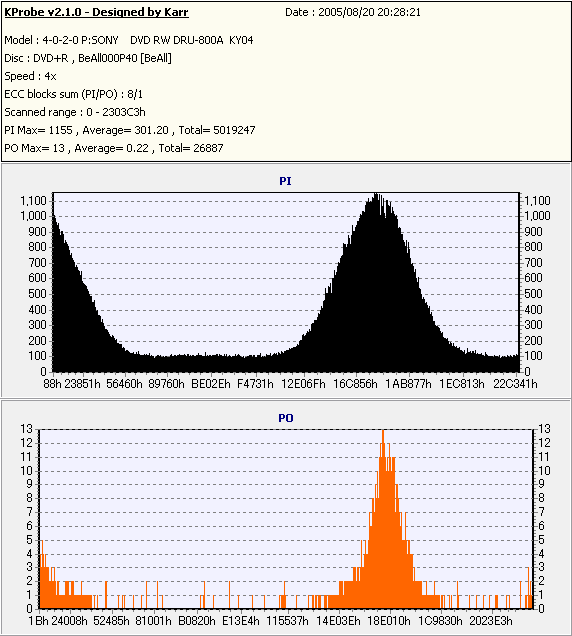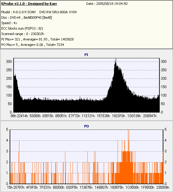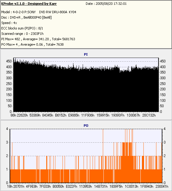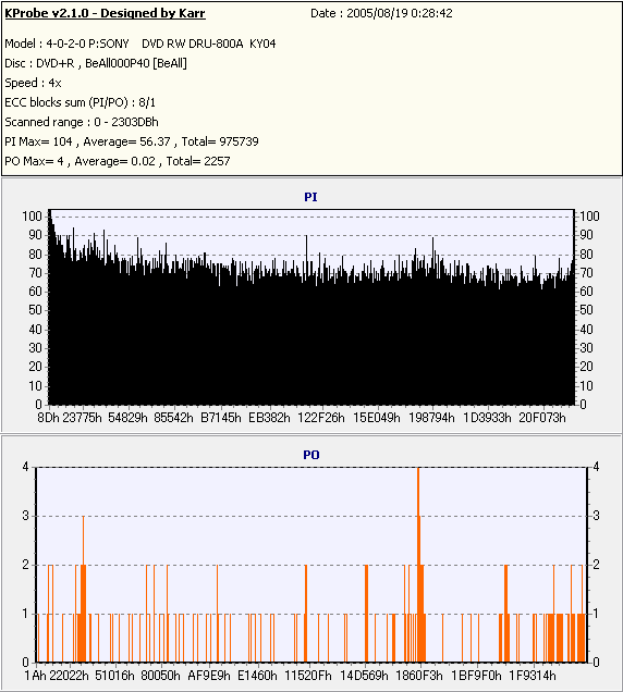 SONY DRU-800A_... Kprobe BLER PIE/PIF (8/1ECC Sum) 4xCLV Scan |