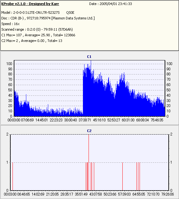 外周へ向かうにつれJitterが上昇しており、C2エラーもちらほらと見られる。