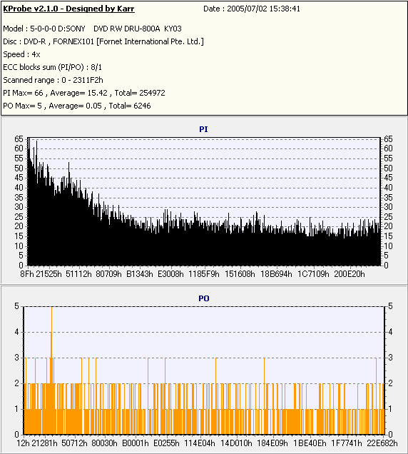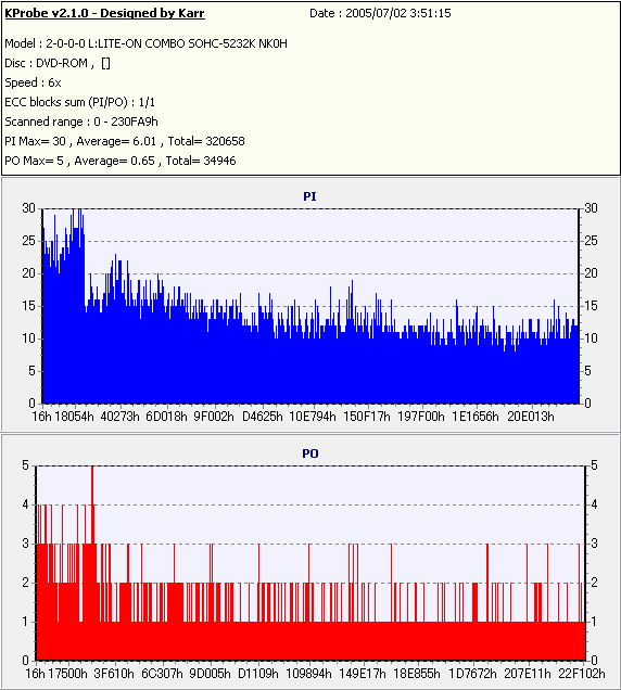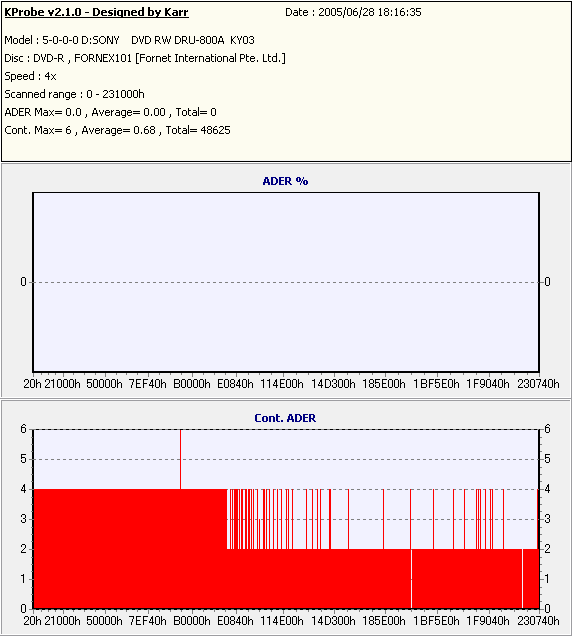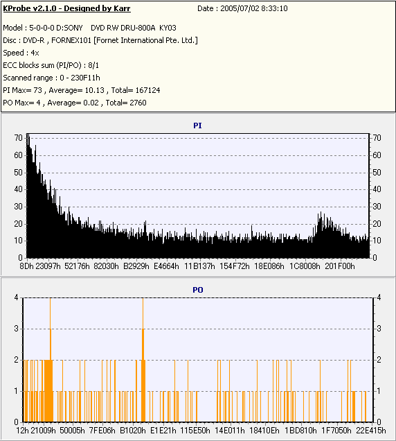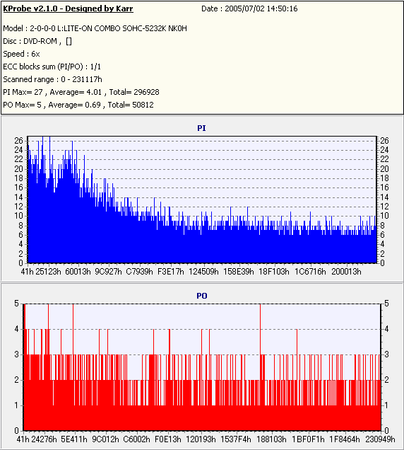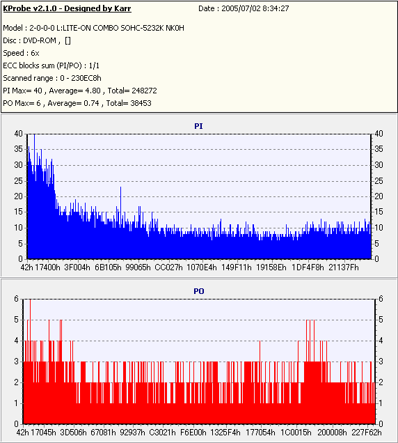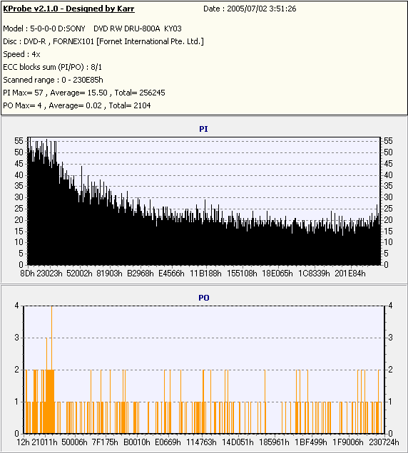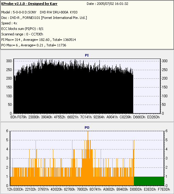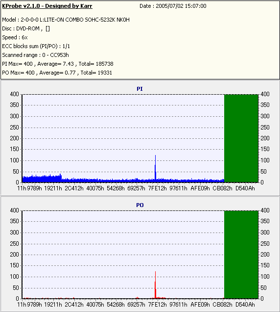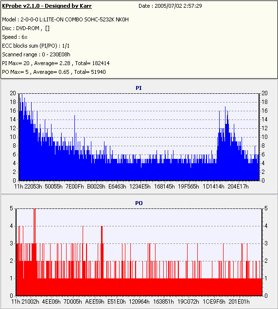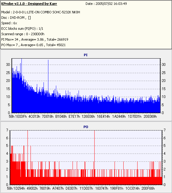 ![]() Kprobe + LITE-ON SOHC-5232Kでの1/1ECC Sum 6x CAV計測 Kprobe + SONY DRU-800Aでの8/1ECC Sum 4x CLV計測 PlexTools Professional + PLEXTOR PX-716AのPI/PO 8ECC Sum Test(速度2 クリックで詳細表示) マウント不能 PlexTools Professional + PLEXTOR PX-716AのTA Test(クリックで詳細情報を表示) マウント不能 CDSpeed + BenQ DW1620Rの品質テスト(6x CAV PIE/PIF/Jitter/POF) マウント不能 DVDInfoPro + Pioneer DVR-108のPI/PO Test(PIE/POE) ![]() |