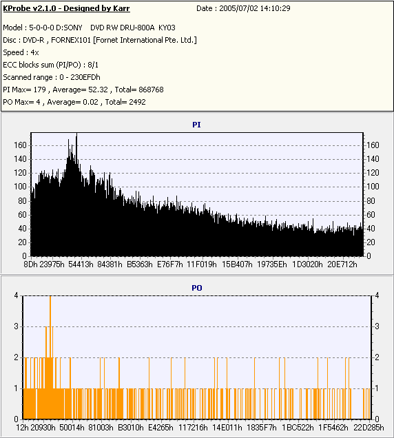 ![]() Kprobe + LITE-ON SOHC-5232Kでの1/1ECC Sum 6x CAV計測 Kprobe + SONY DRU-800Aでの8/1ECC Sum 4x CLV計測 PlexTools Professional + PLEXTOR PX-716AのPI/PO 8ECC Sum Test(速度2 クリックで詳細表示) ![]() PlexTools Professional + PLEXTOR PX-716AのTA Test(クリックで詳細情報を表示) ![]() ![]() ![]() CDSpeed + BenQ DW1620Rの品質テスト(6x CAV PIE/PIF/Jitter/POF) ![]() DVDInfoPro + Pioneer DVR-108のPI/PO Test(PIE/POE) ![]() |