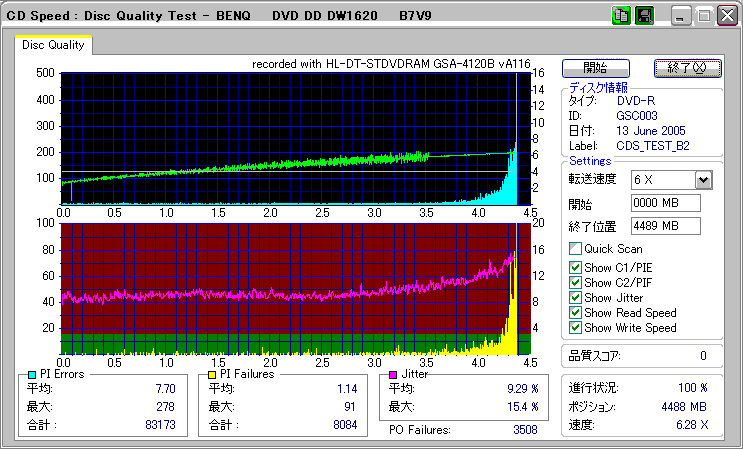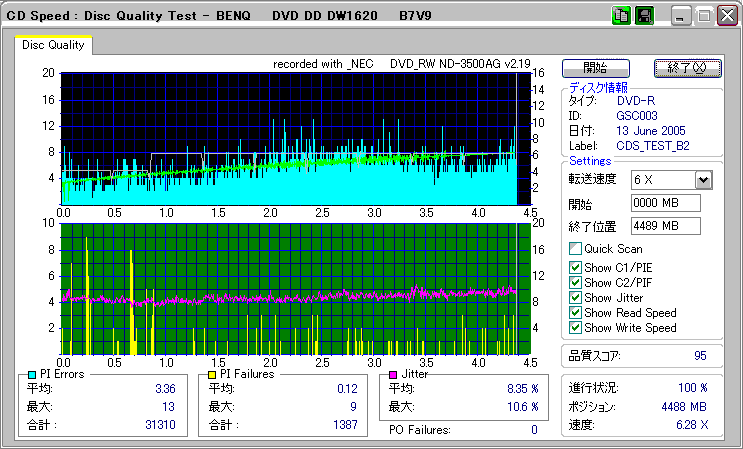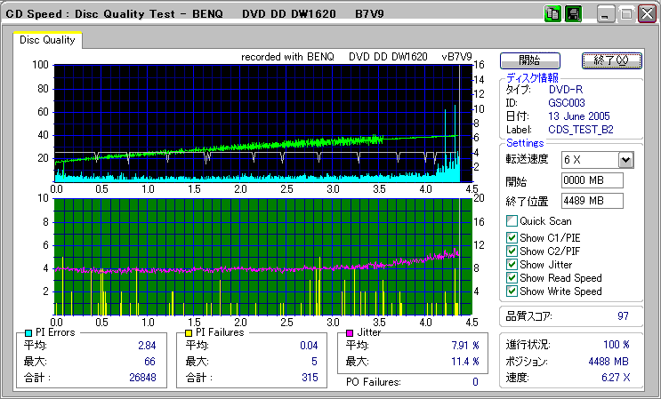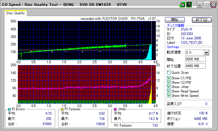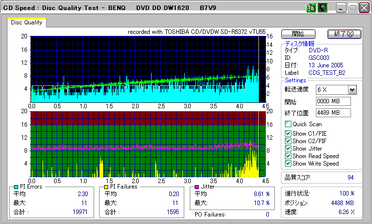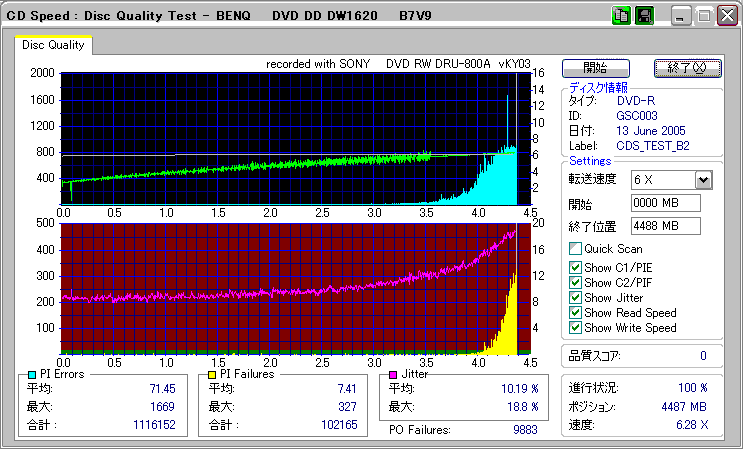 CDSpeed + BenQ DW1620Rの品質テスト(6x CAV PIE/PIF/Jitter/POF)
