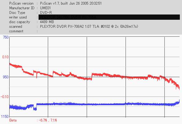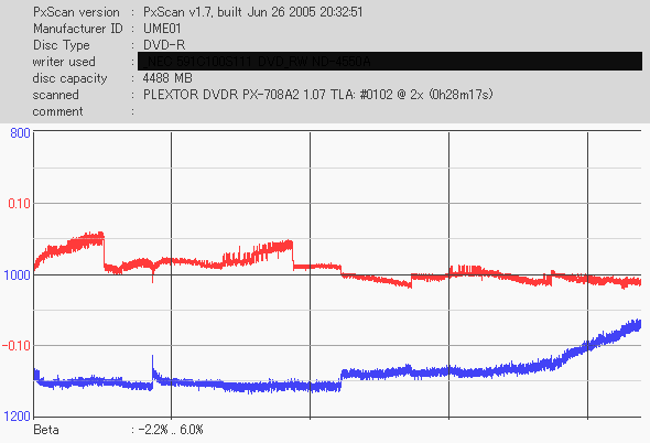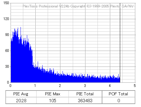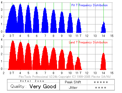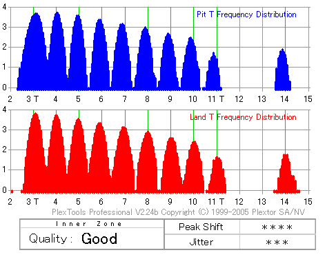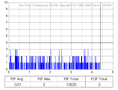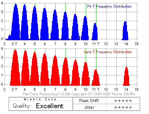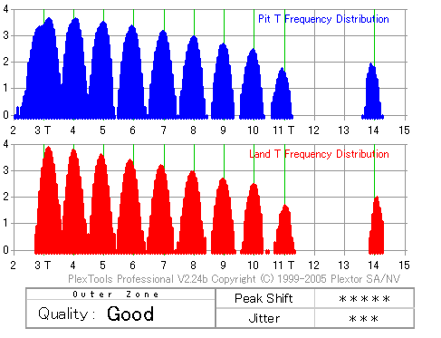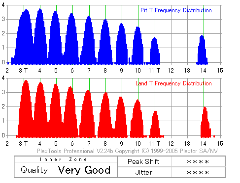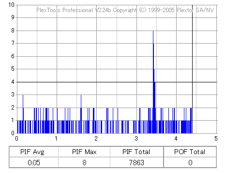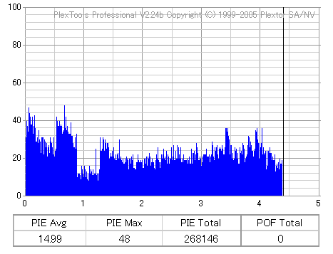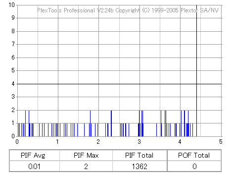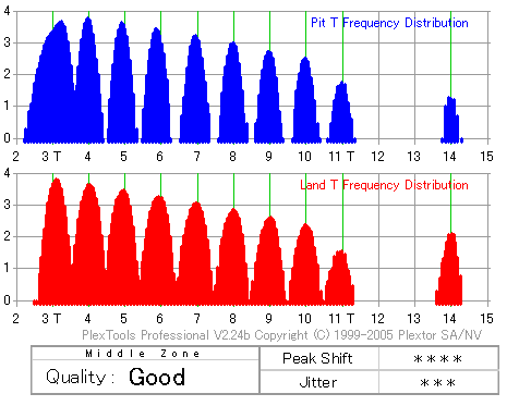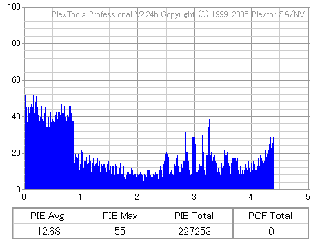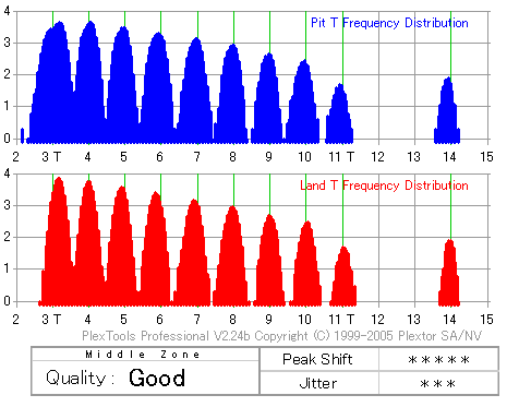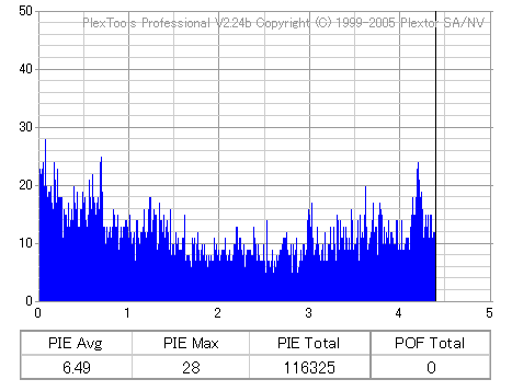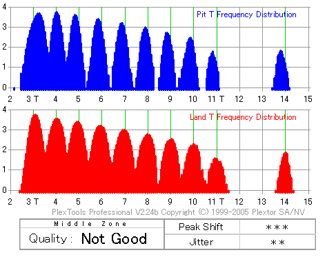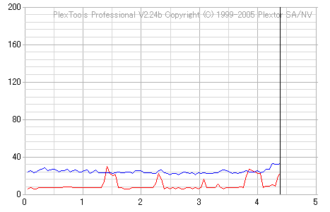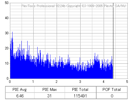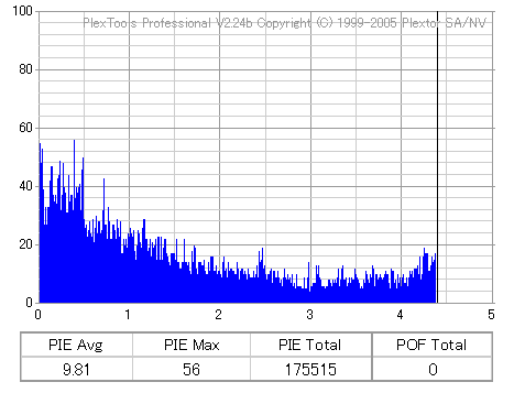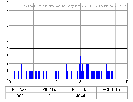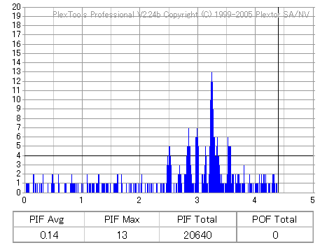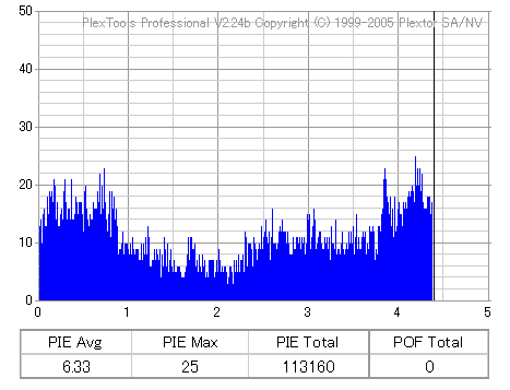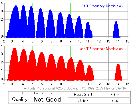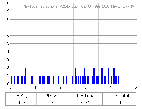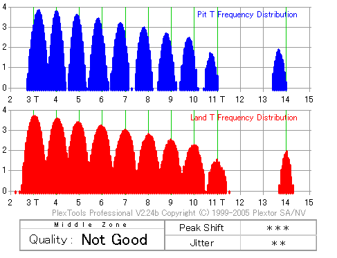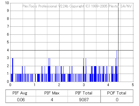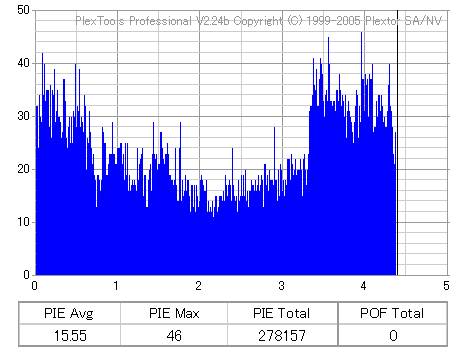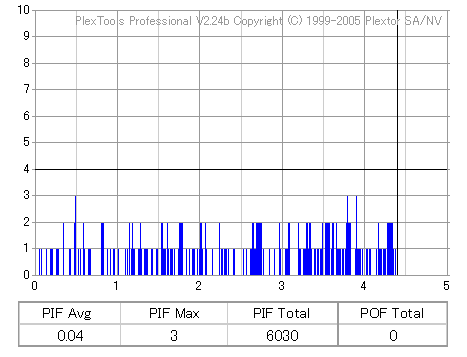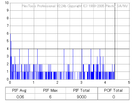 何か変なのでもう一度。すると今度はかなりきれいに焼けました。 多分前のディスクはキズでも付いてたんでしょう。 しかしこういうのがパッケージ内に入ってるってことが事実としてあるわけで、 即ちそれも品質でありこちらは総合評価外とします。 |