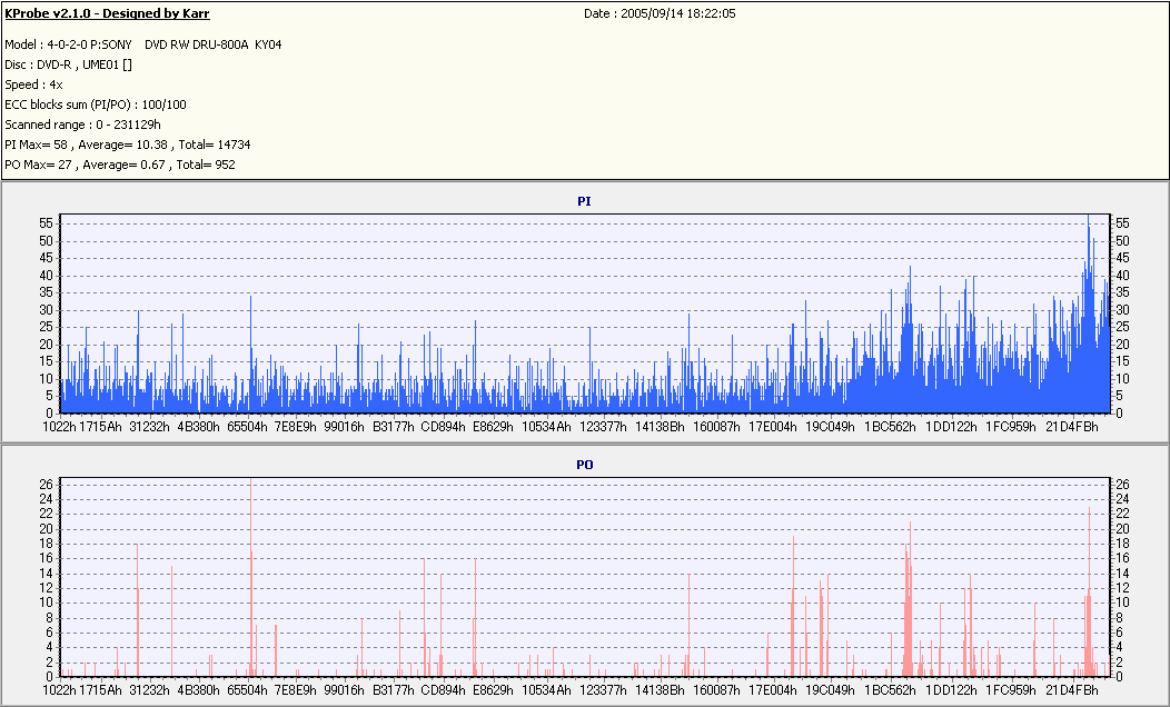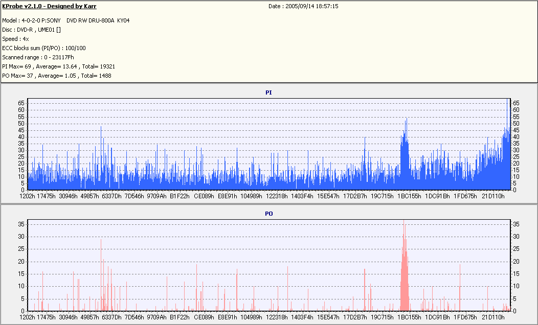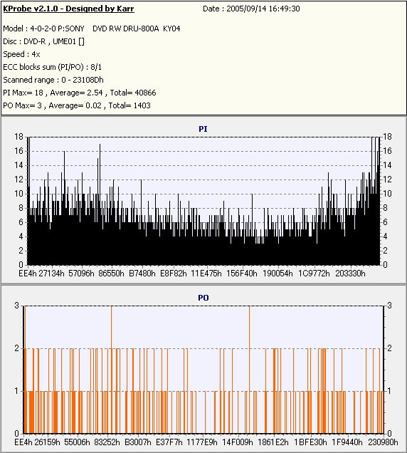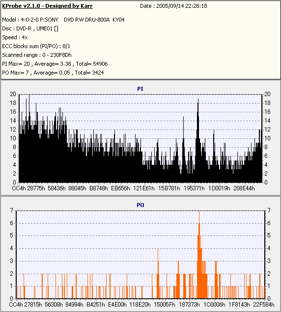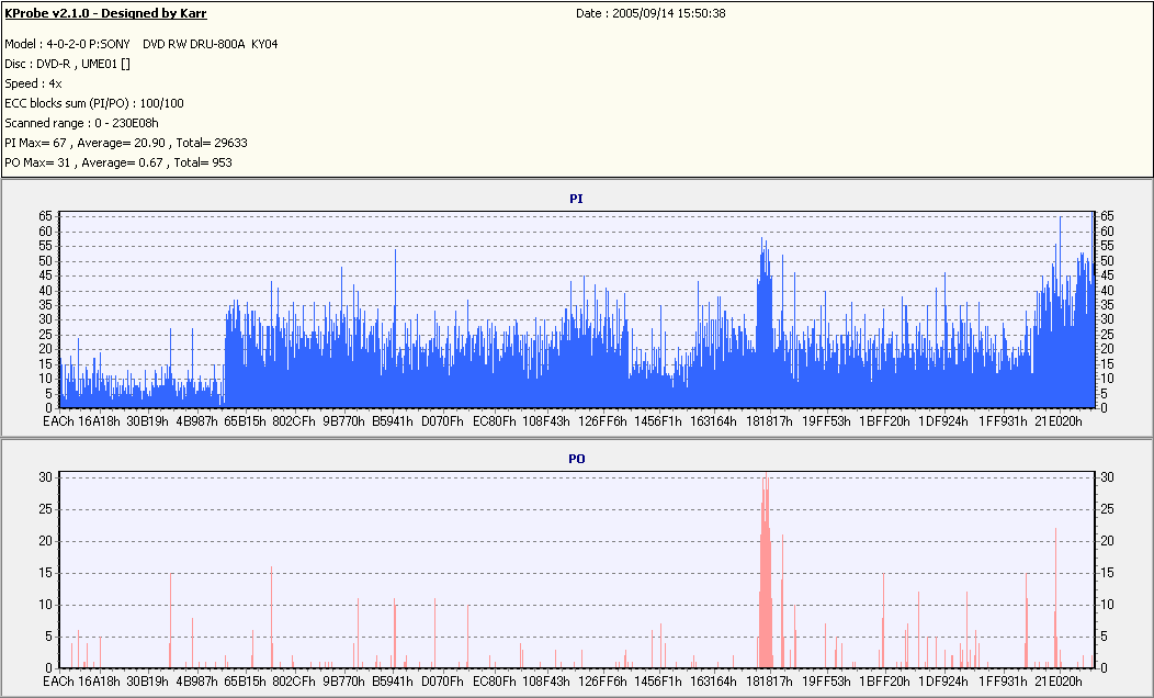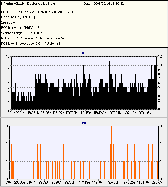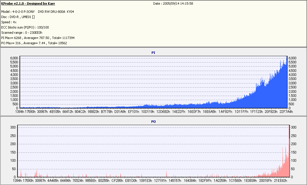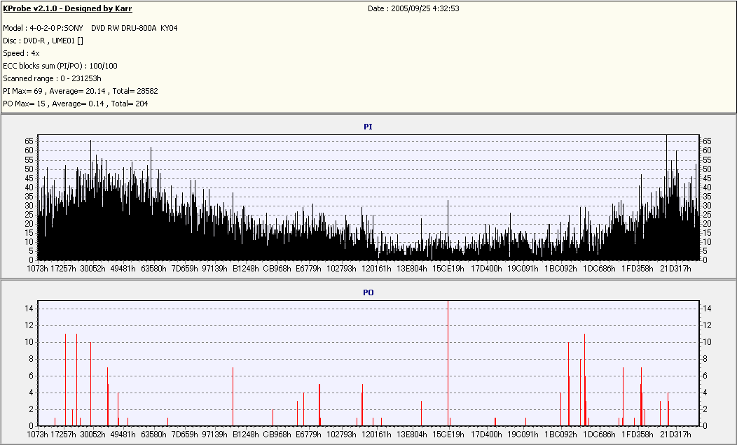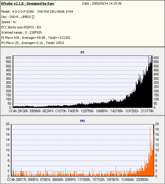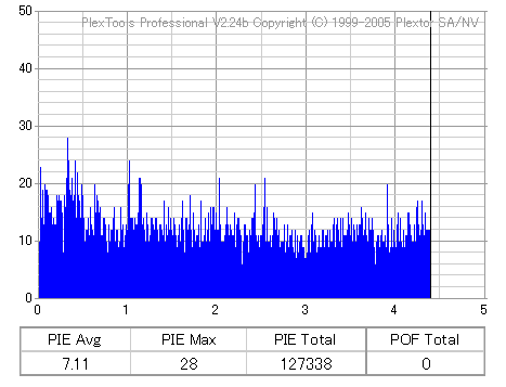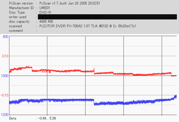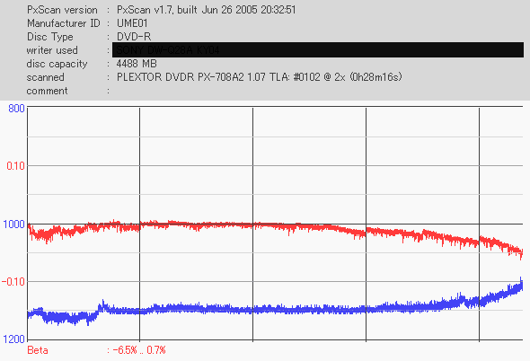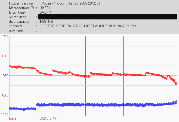 何か変なのでもう一度。すると今度はかなりきれいに焼けました。 多分前のディスクはキズでも付いてたんでしょう。 しかしこういうのがパッケージ内に入ってるってことが事実としてあるわけで、 即ちそれも品質でありこちらは総合評価外とします。 |