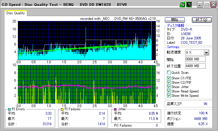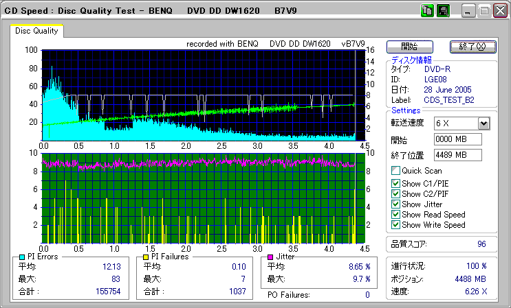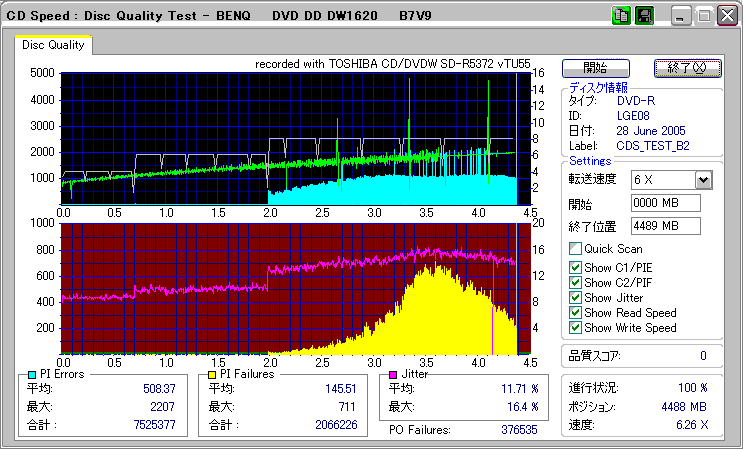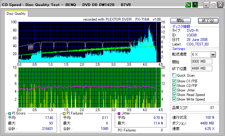 CDSpeed + BenQ DW1620Rの品質テスト(6x CAV PIE/PIF/Jitter/POF)