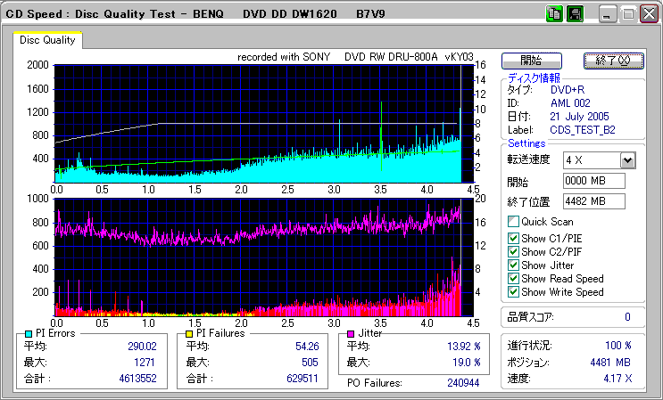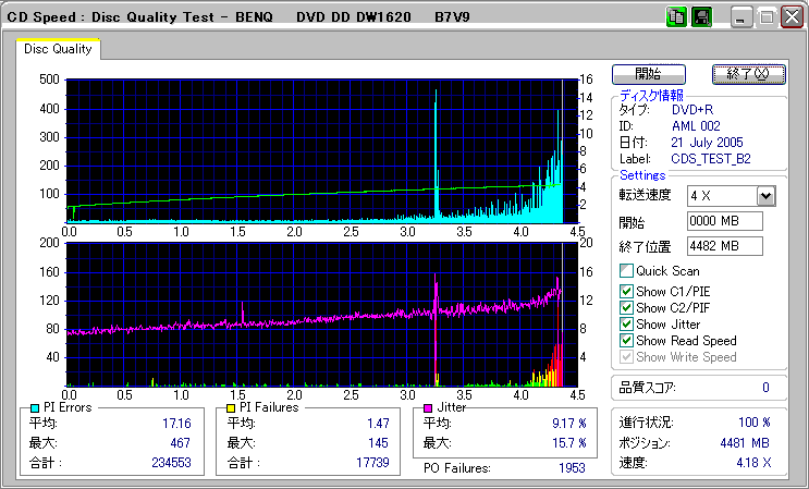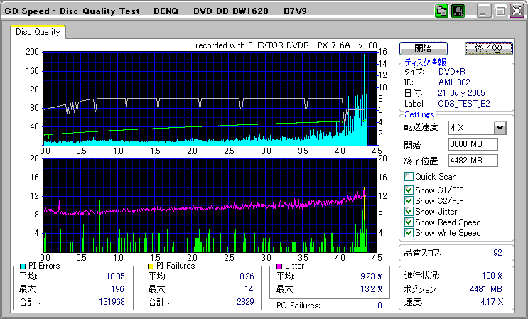 CDSpeed + BenQ DW1620Rの品質テスト(4x CAV PIE/PIF/Jitter/POF) |