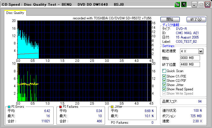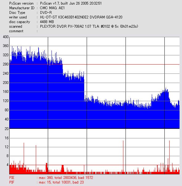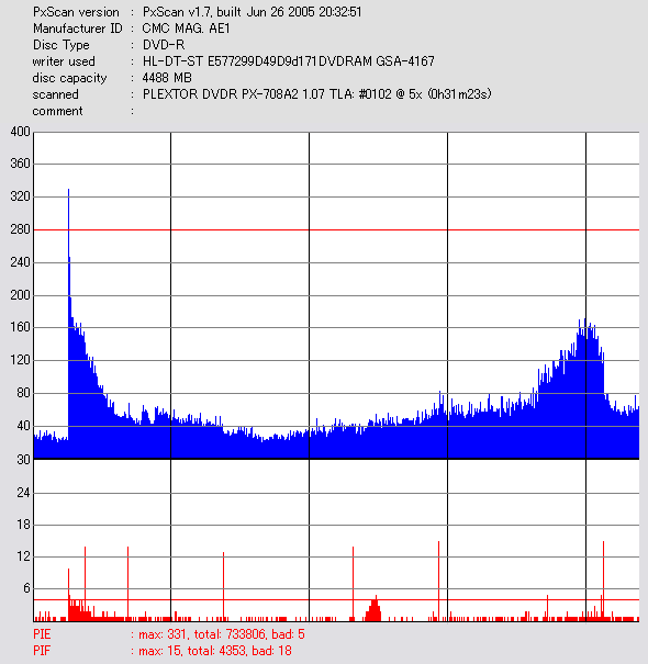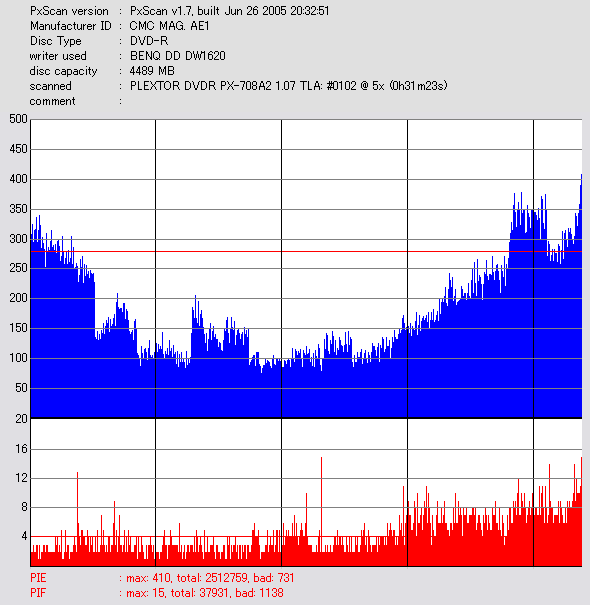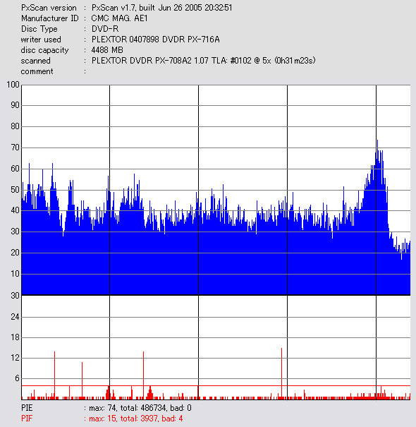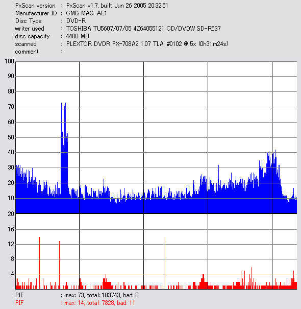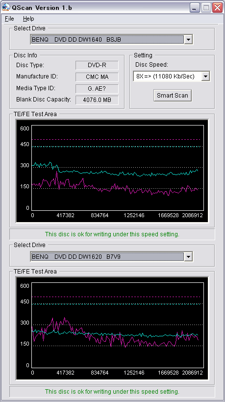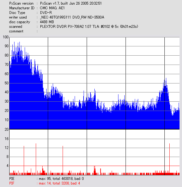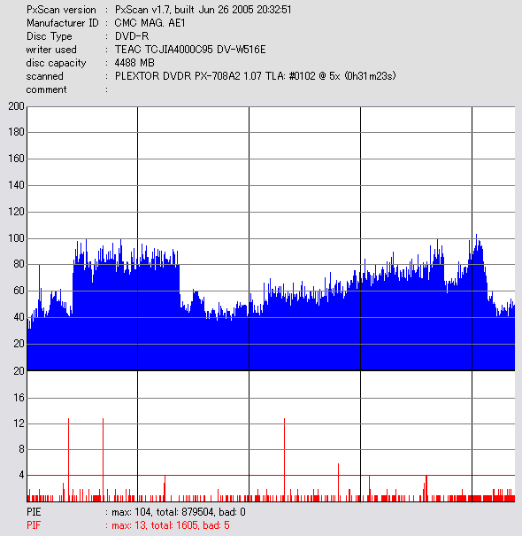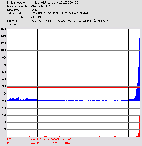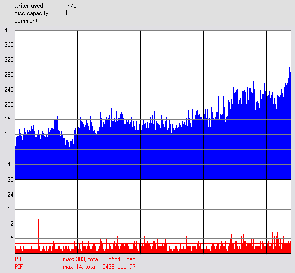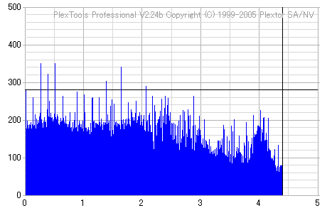 どうも品質的に微妙そうで、ドライブによっては規格値をオーバーするかしないかといったところなので、なるべくならND-3500AやPX-716A等のドライブで焼きにいった方が良さそう。どうにもこの価格で買うのはちょっと勿体無い気がする。せめて4倍で焼いた方が良い。 |