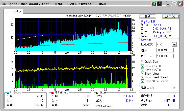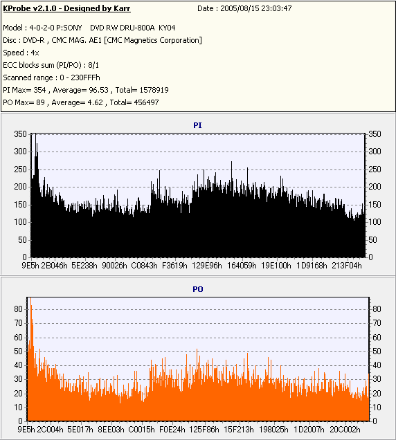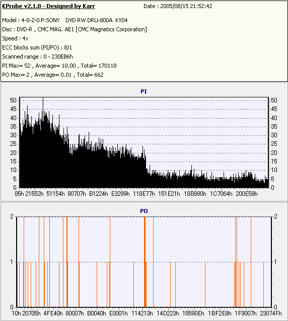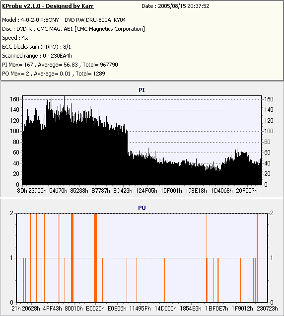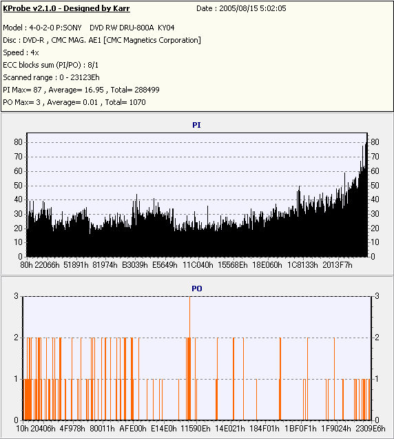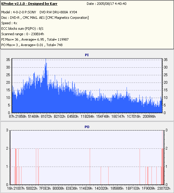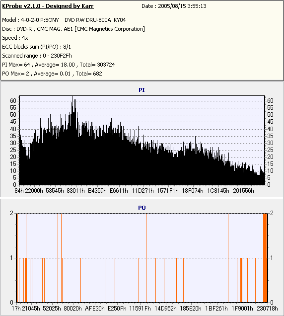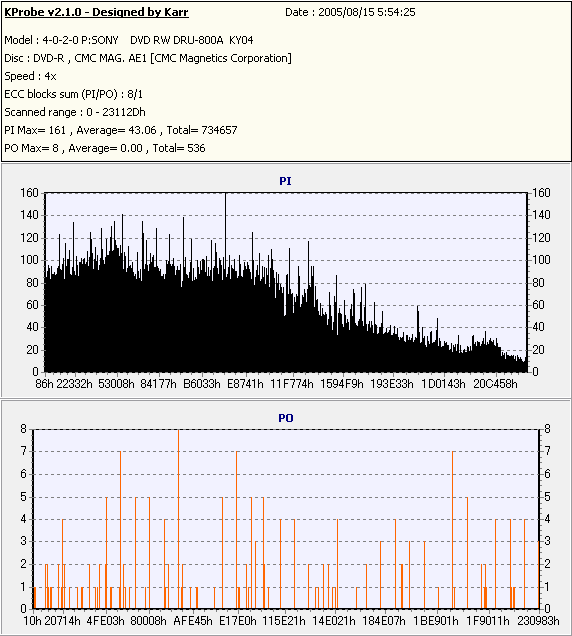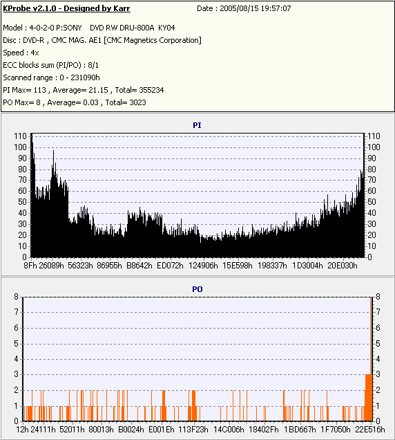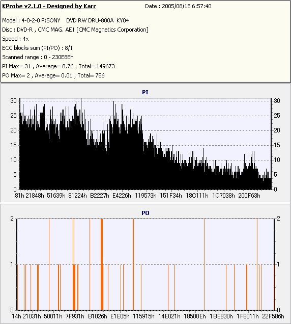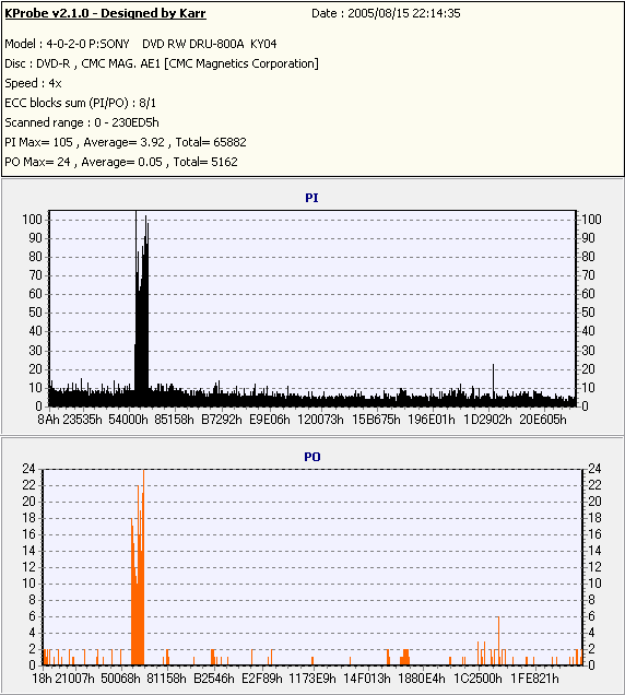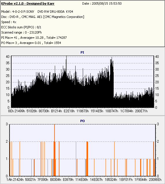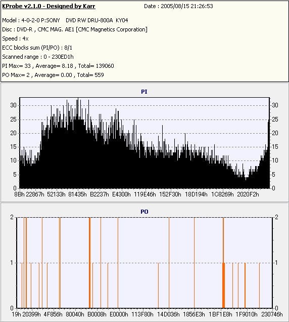SONY DRU-800A_... Kprobe BLER PIE/PIF (8/1ECC Sum) 4xCLV Scan |