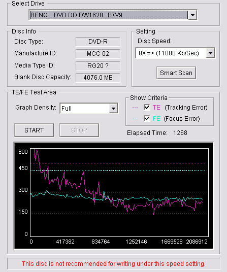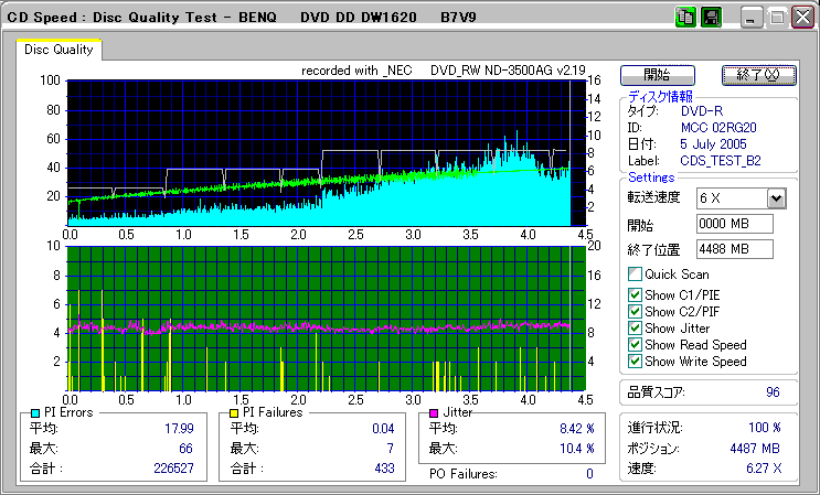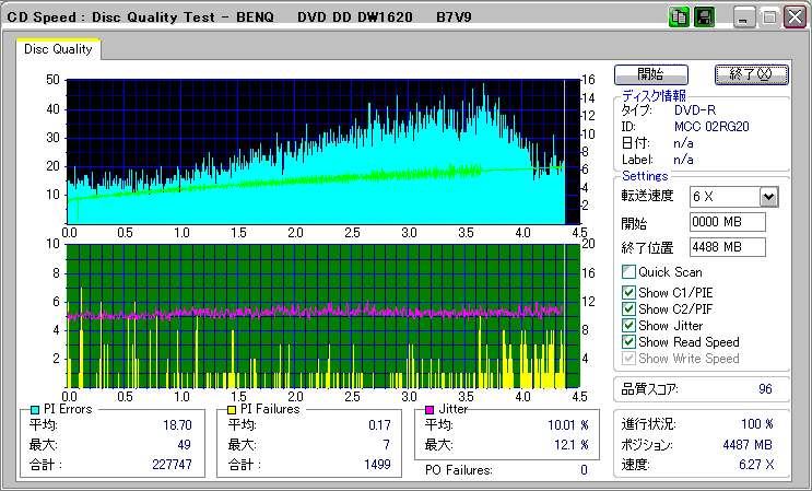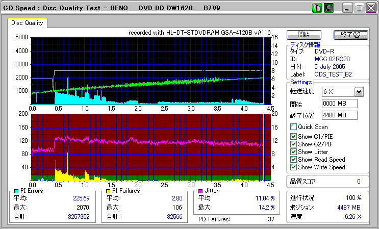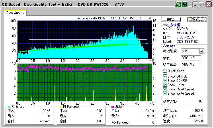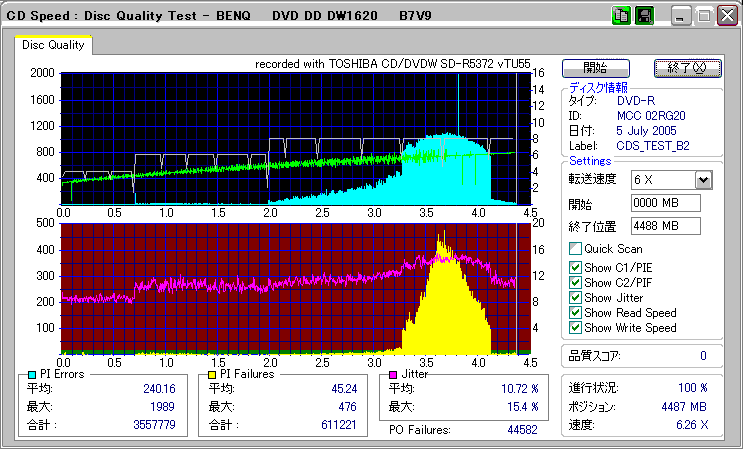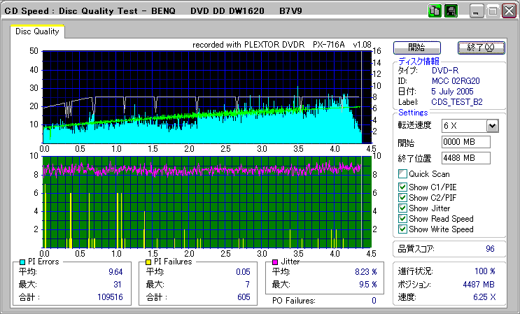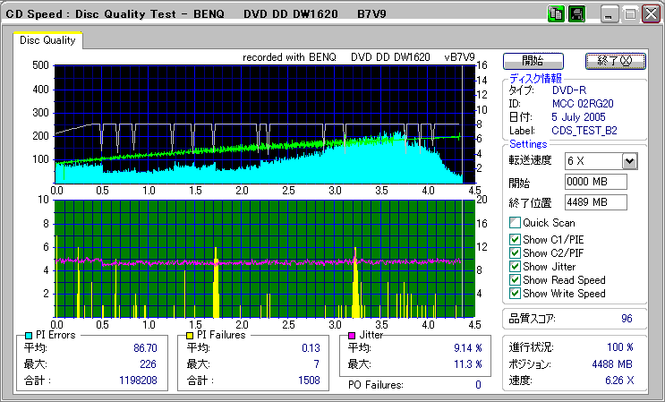 CDSpeed + BenQ DW1620Rの品質テスト(6x CAV PIE/PIF/Jitter/POF)