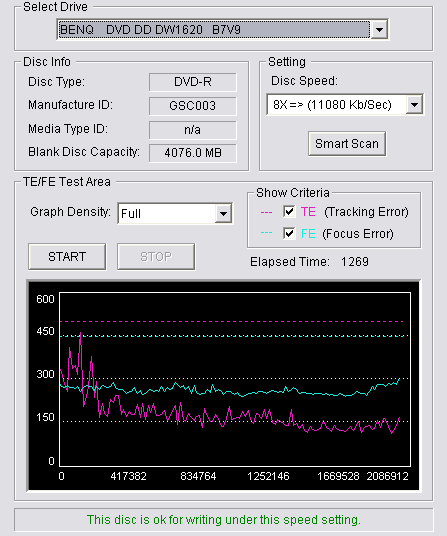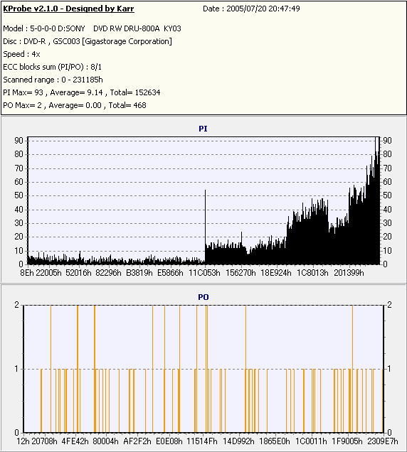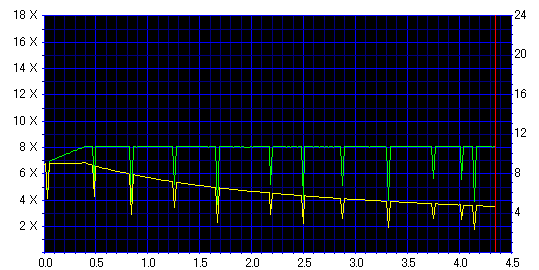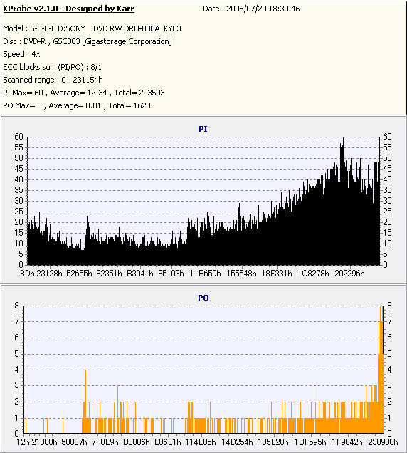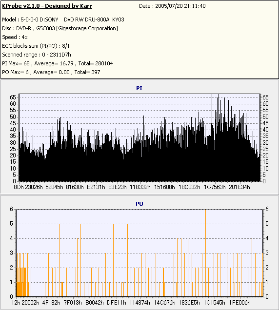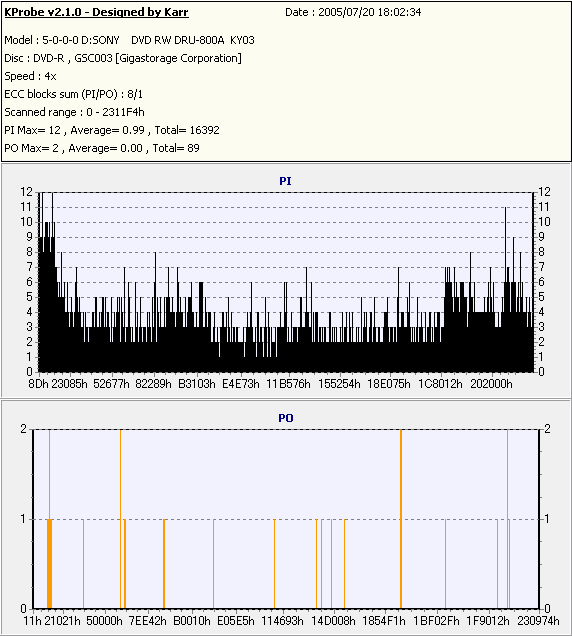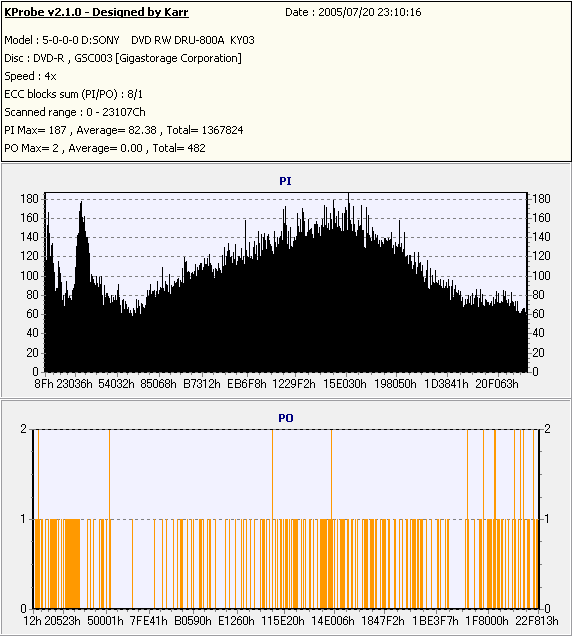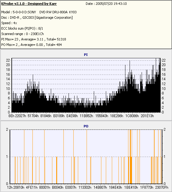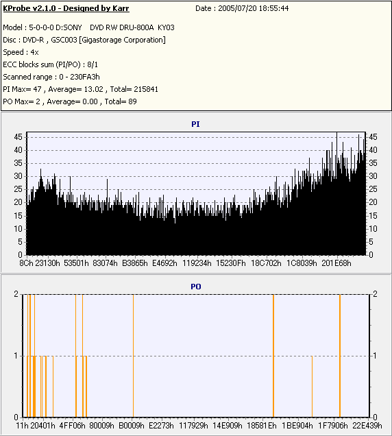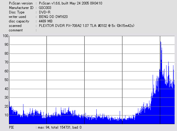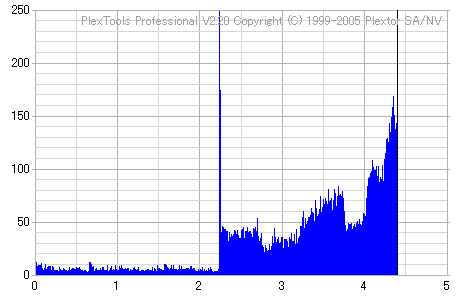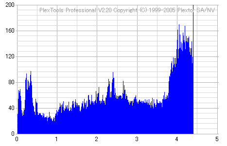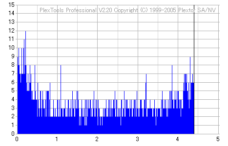 全体的に外周に若干難ありで、ドライブによってはエラー値が膨れ上がってしまう傾向にある。しかし、相性の合うドライブで焼けば外周まで非常に安定した品質を示し、安メディアにしては結構良い結果となった。