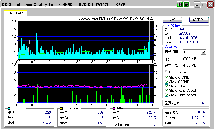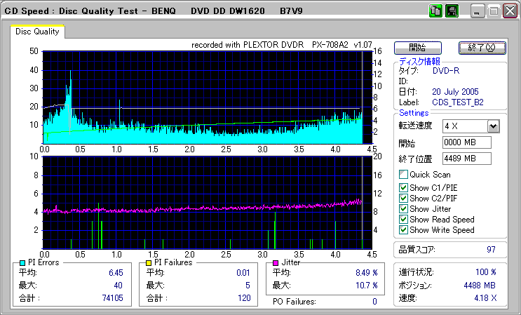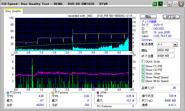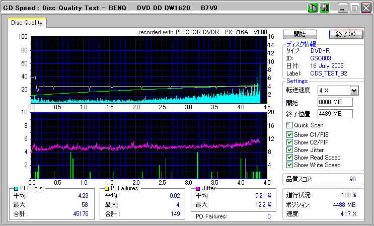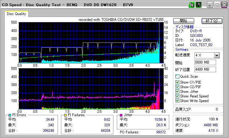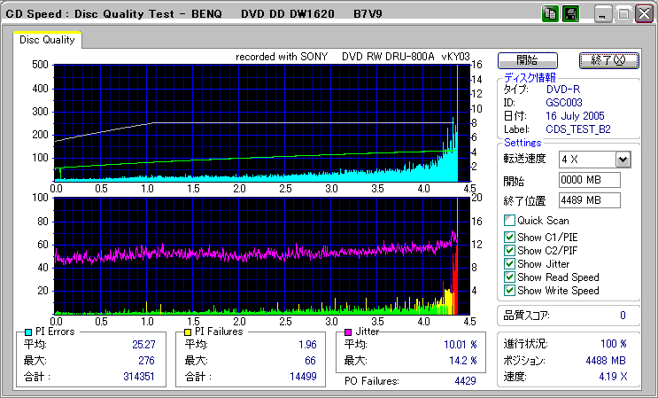 CDSpeed + BenQ DW1620Rの品質テスト(4x CAV PIE/PIF/Jitter/POF) |