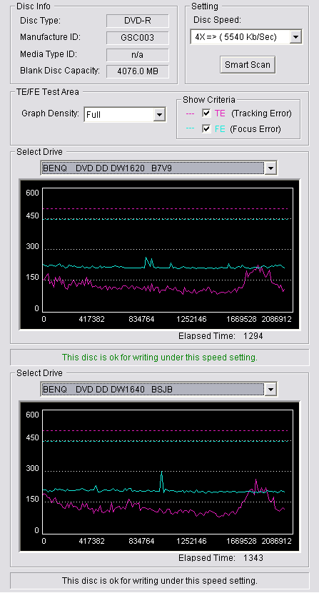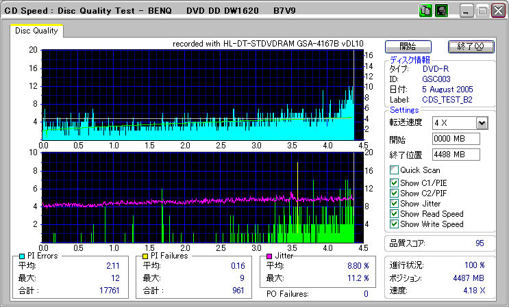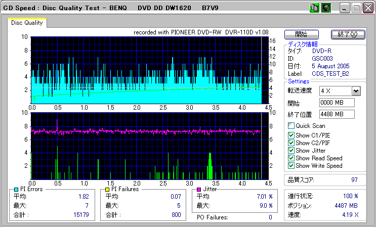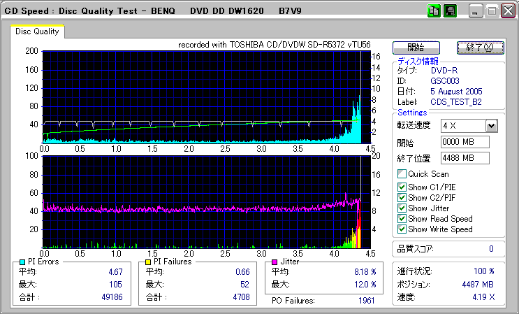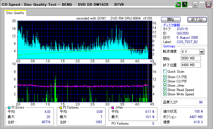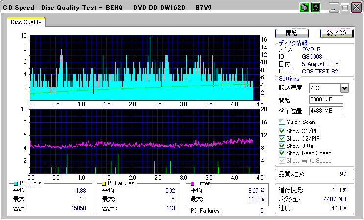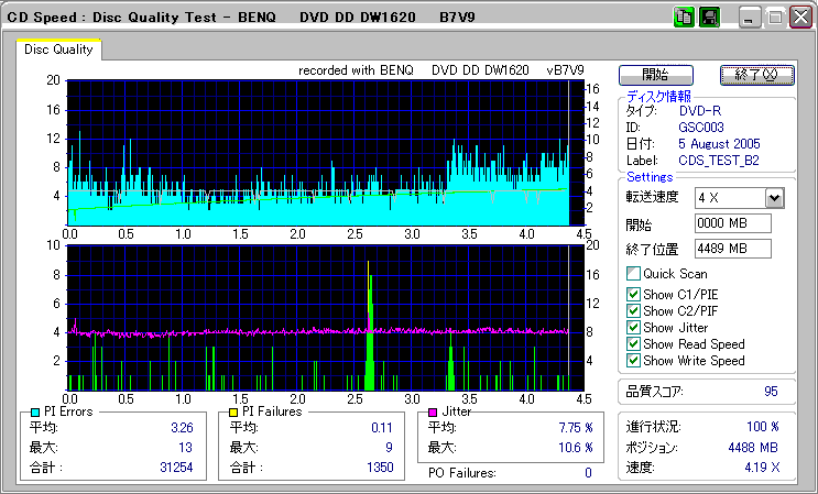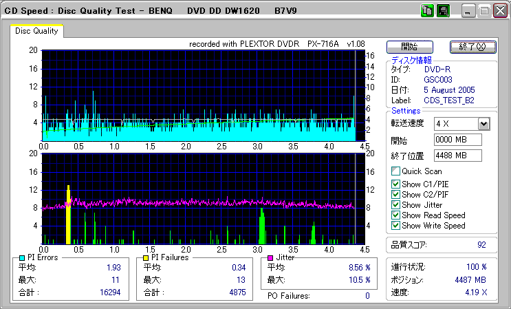 CDSpeed + BenQ DW1620Rの品質テスト(4x CAV PIE/PIF/Jitter/POF) |