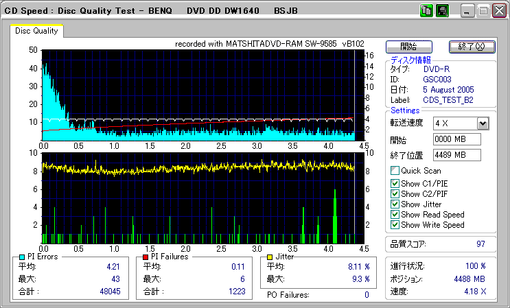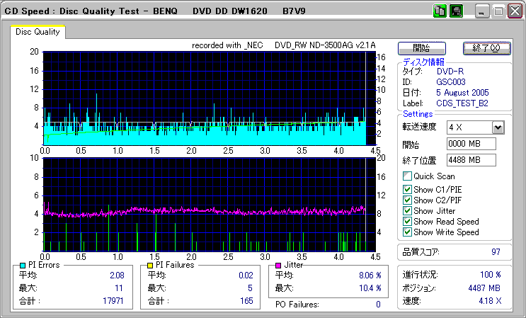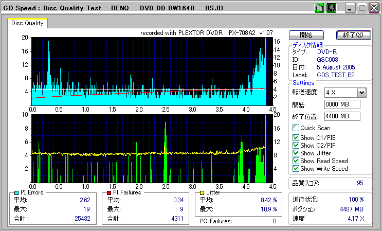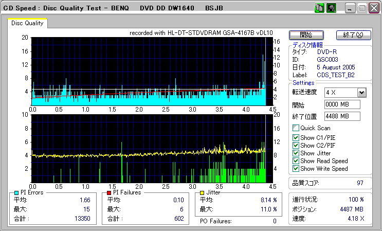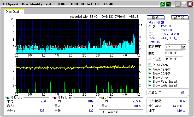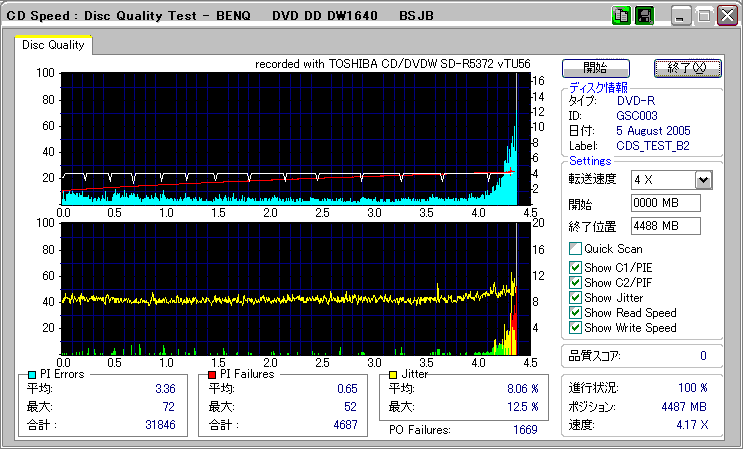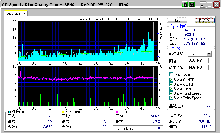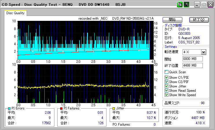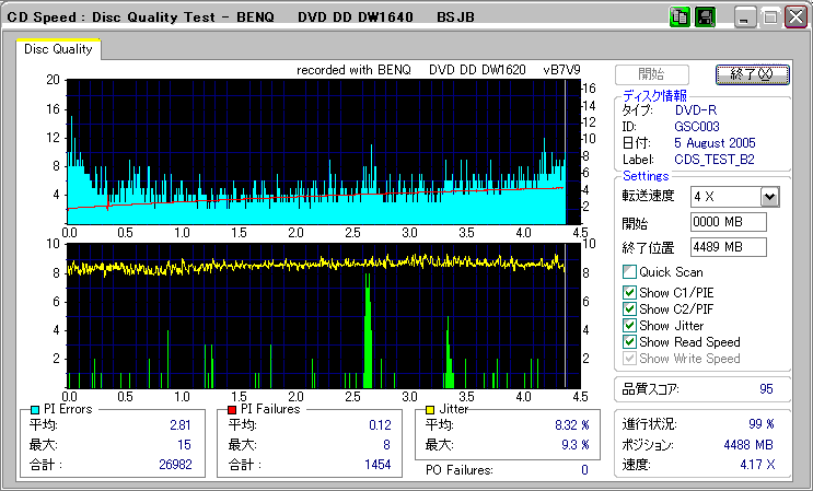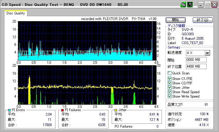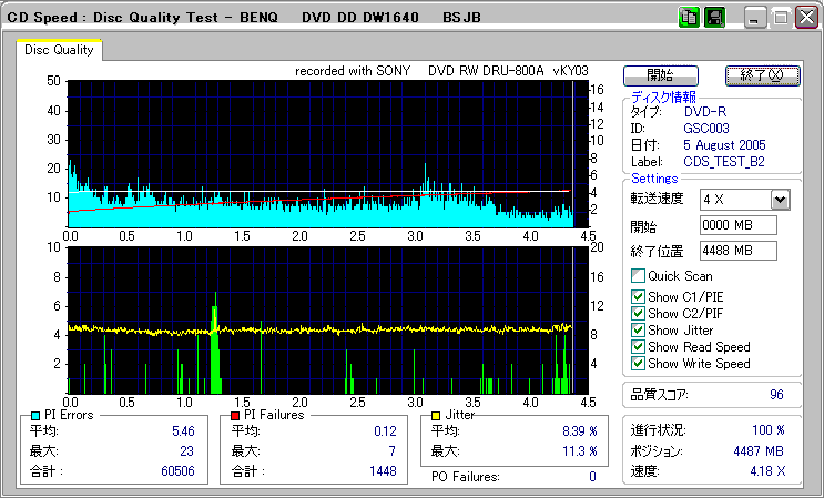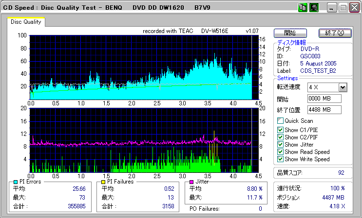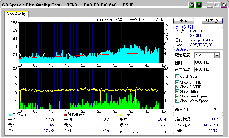 CDSpeed + BenQ DW1640の品質テスト(4x CAV PIE/PIF/Jitter/POF) |