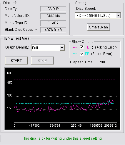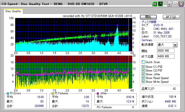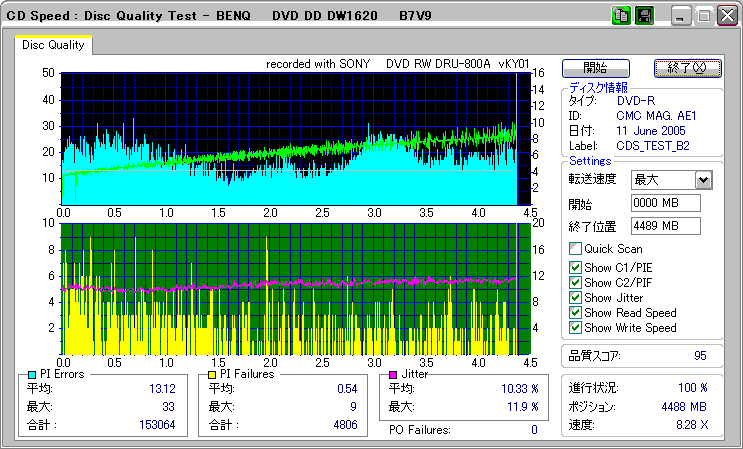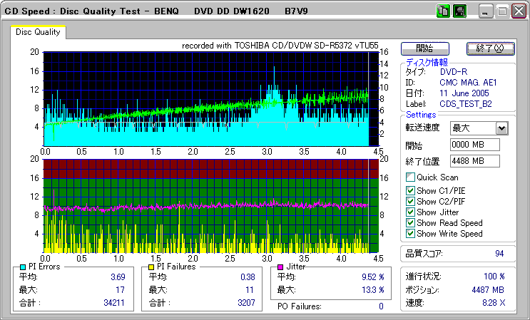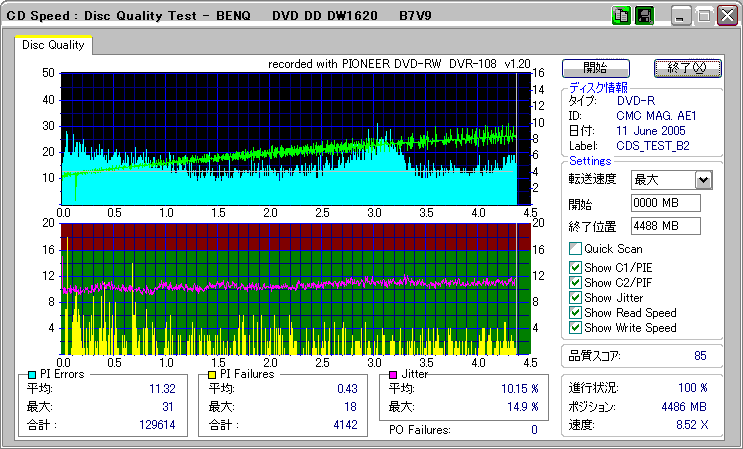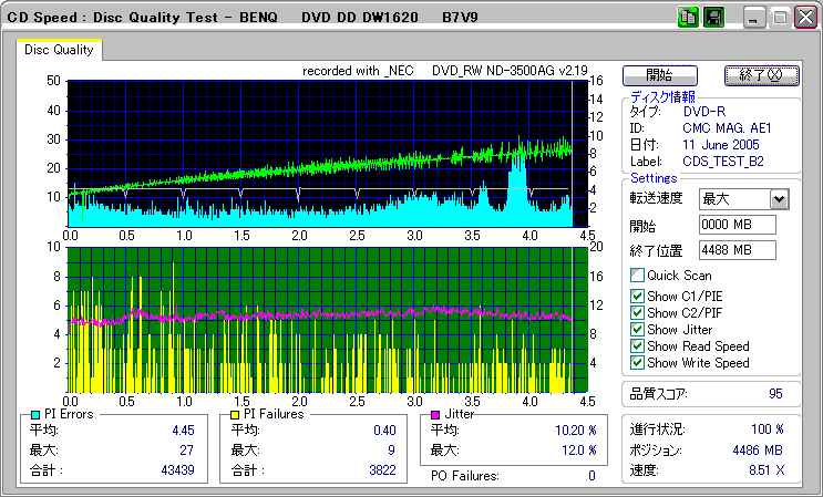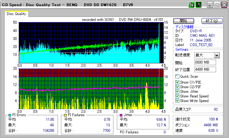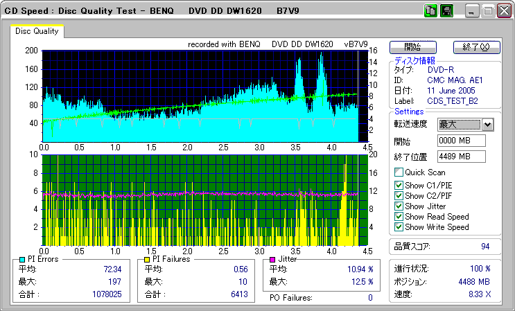 CDSpeed + BenQ DW1620Rの品質テスト(PIE/PIF/Jitter/POF)