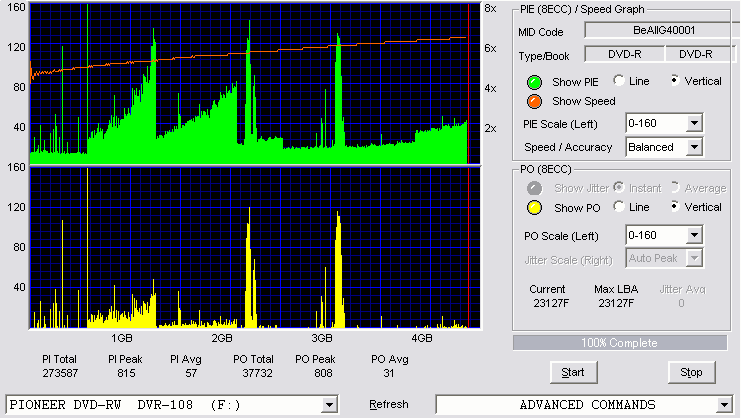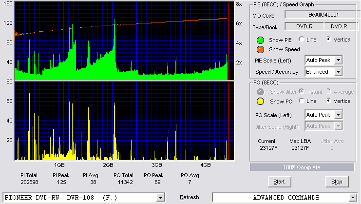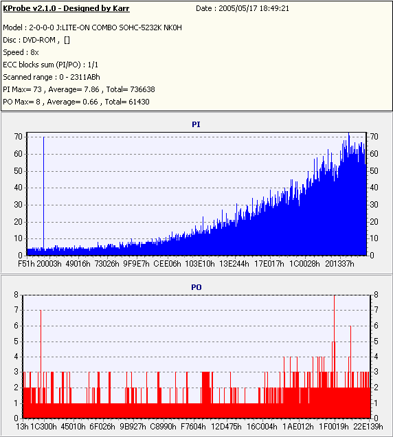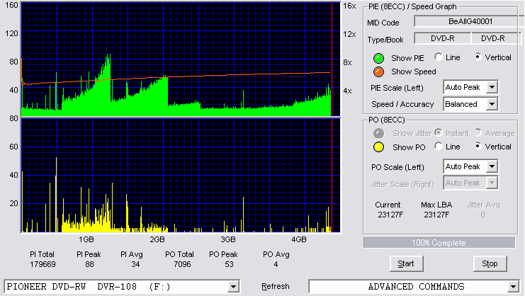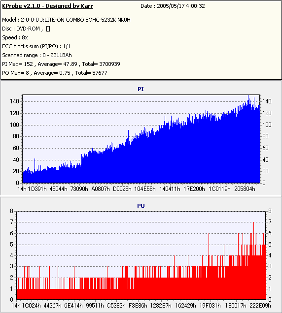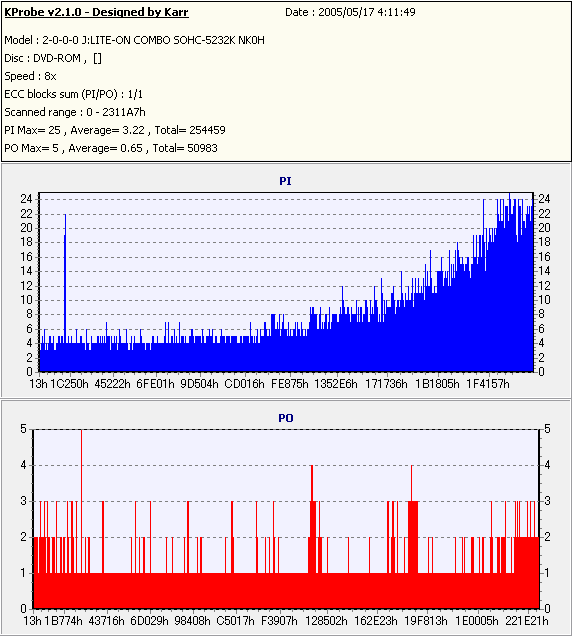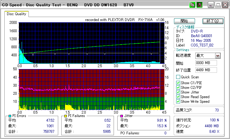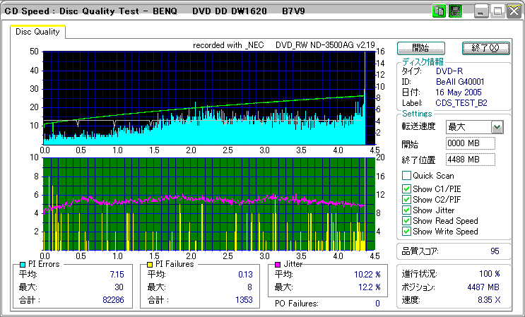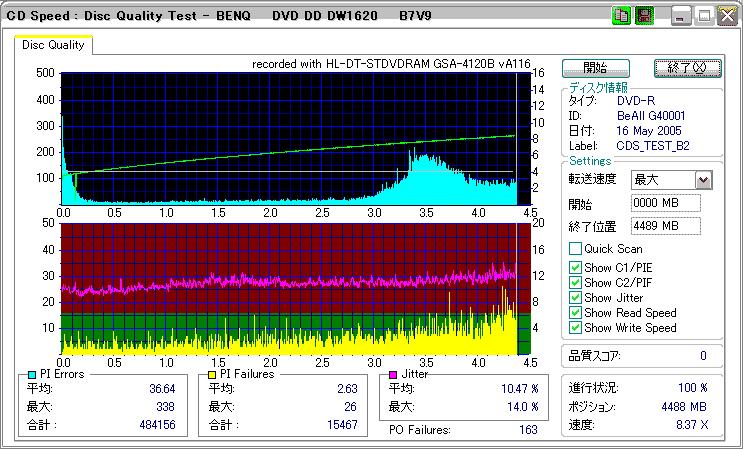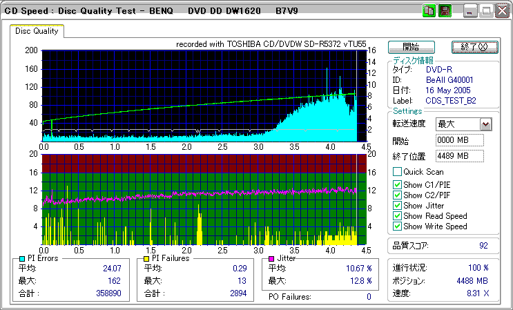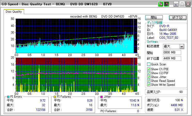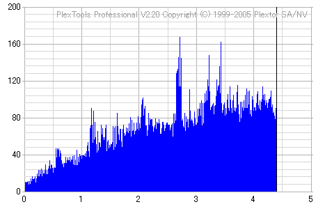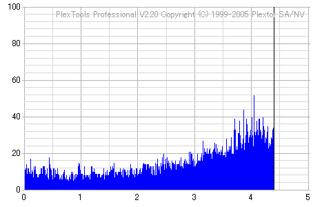 中身は韓国産という事でInfodisc-Koreaあたりを予想していたが、予想に反して\100均の類では恐らく初登場のBeAll。同社の4倍速メディアの中では秋葉で出回っているハズレ品よりもかなり良好な感じだが、ドライブとの相性もかなりあるようで、ND-3500Aなんかだと非常にきれいに焼けている反面DW1620Rだとどうにもよろしくない。