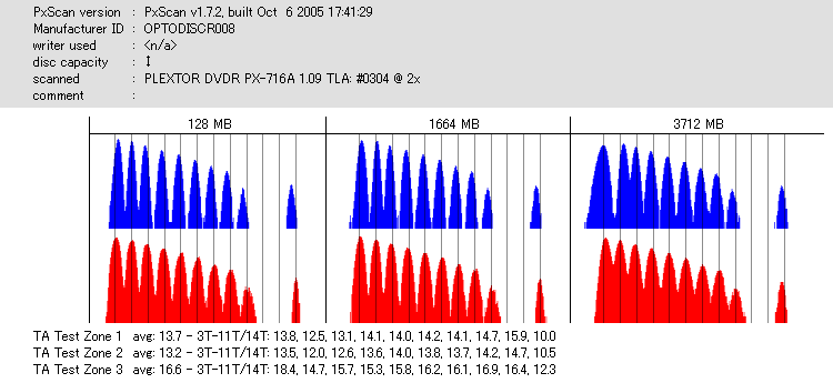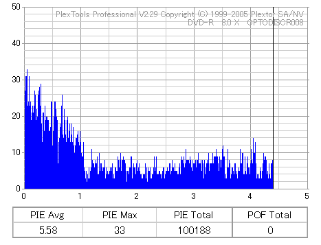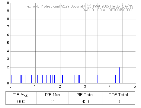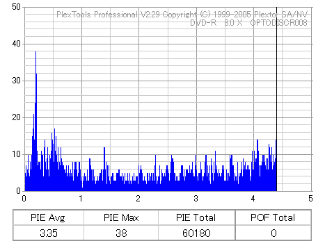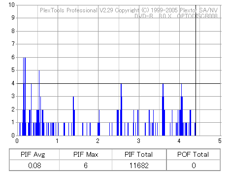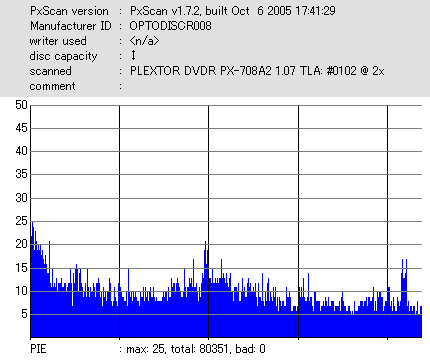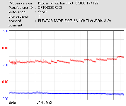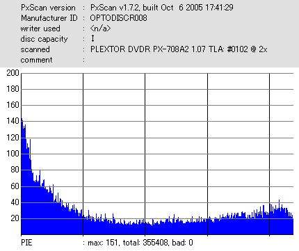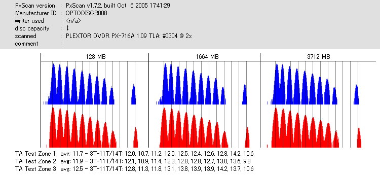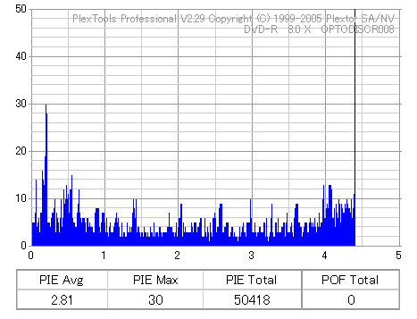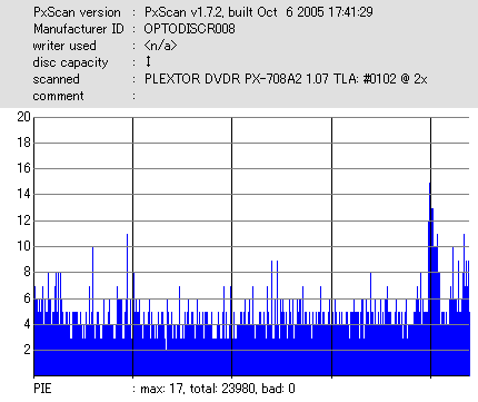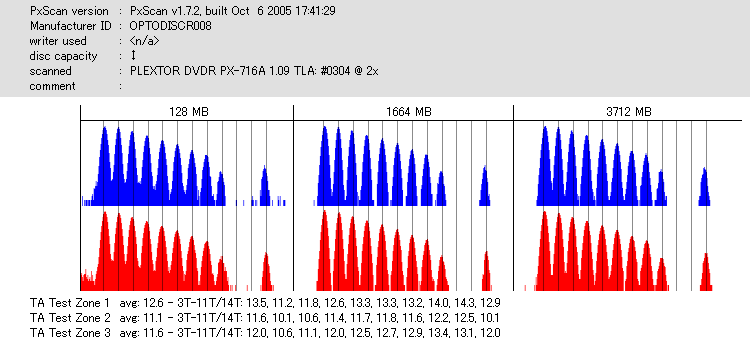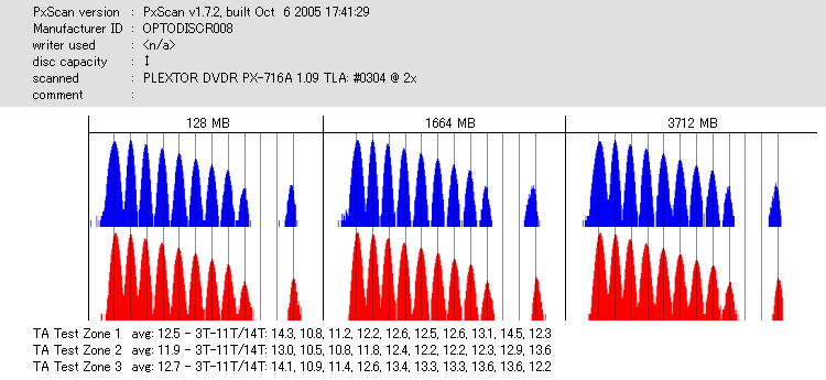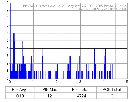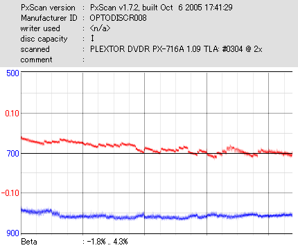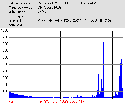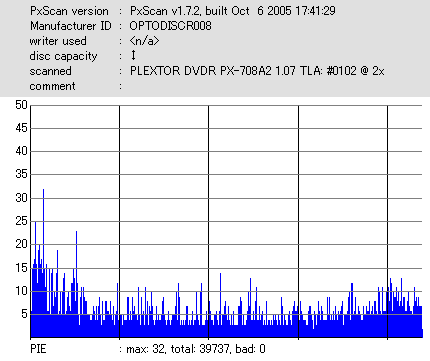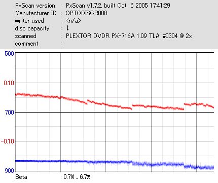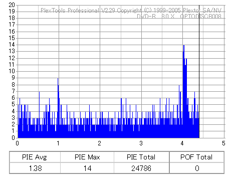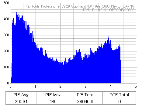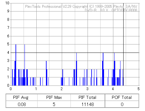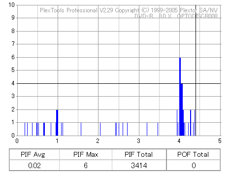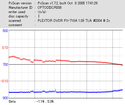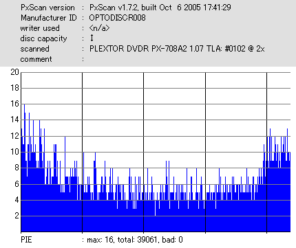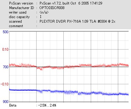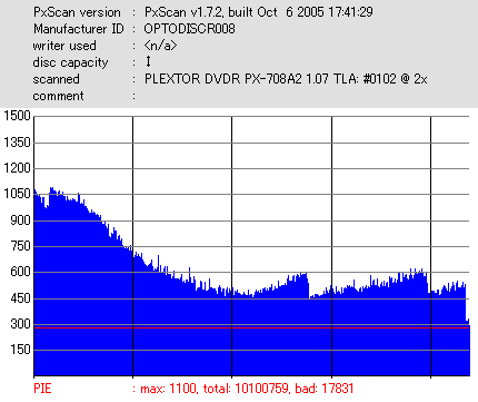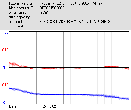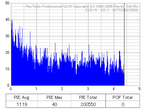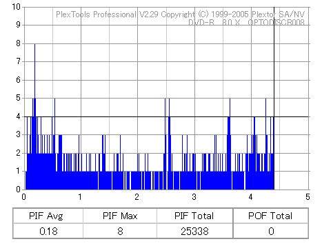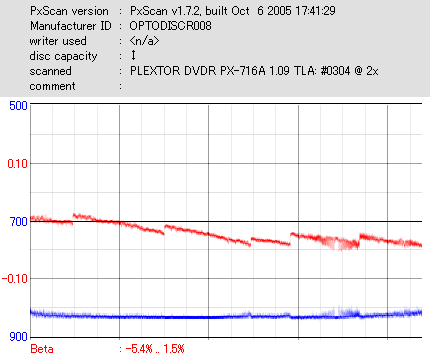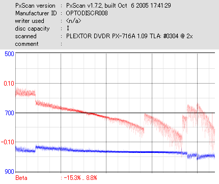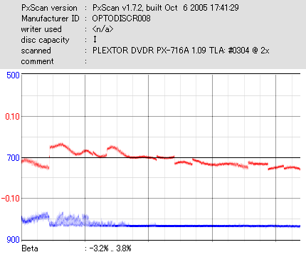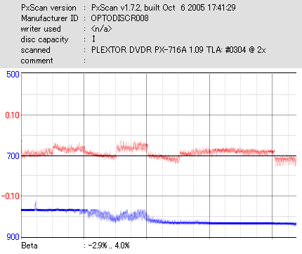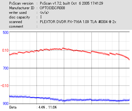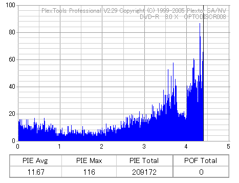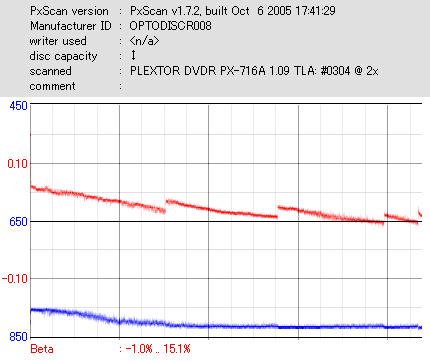 8x焼きだとどうも芳しくない結果だったので4倍で焼いてみたのですが、正直大して変わらない感じです。 PLEXTORドライブの計測結果は良好なんですが、DW1640で計測すると必ず外周が膨らんでしまいます。 諦めて容量を抑えて焼くのが良いでしょう。 |