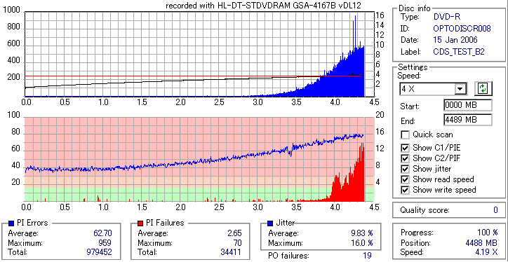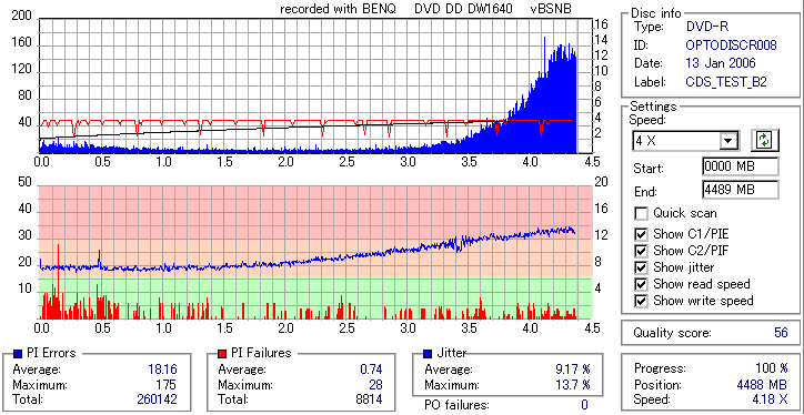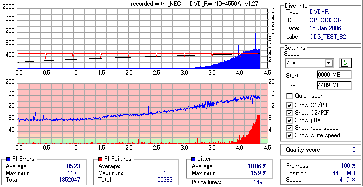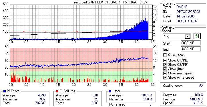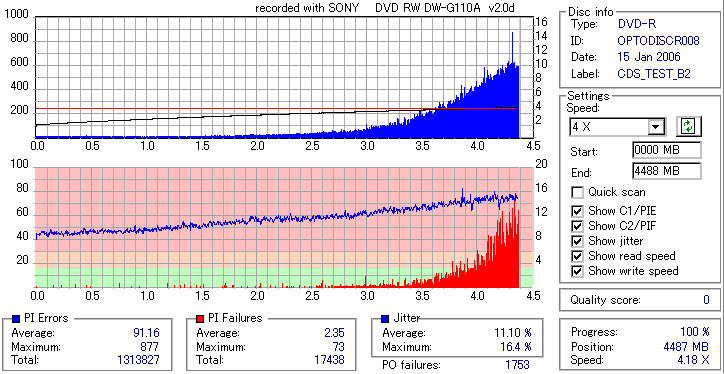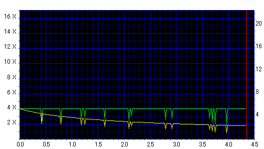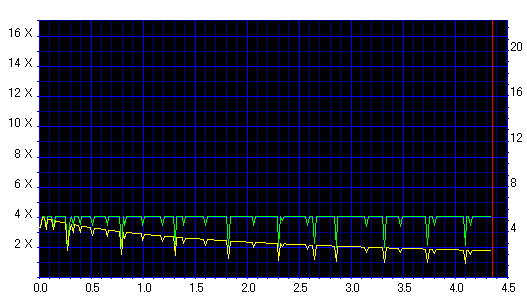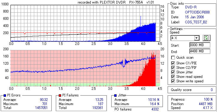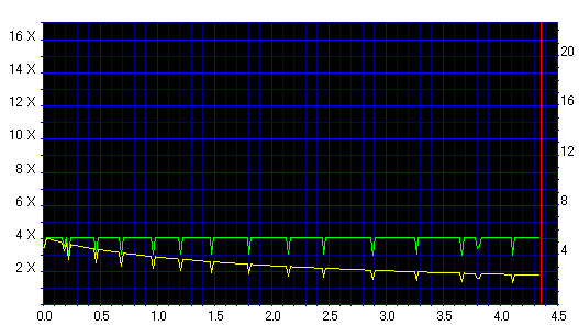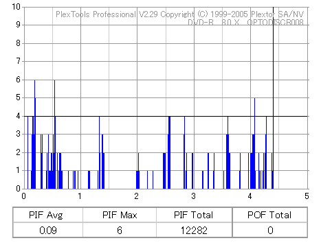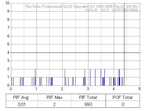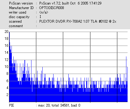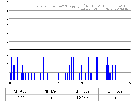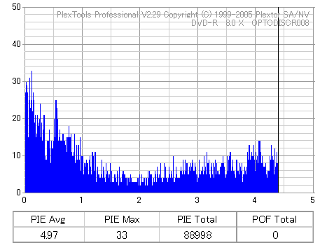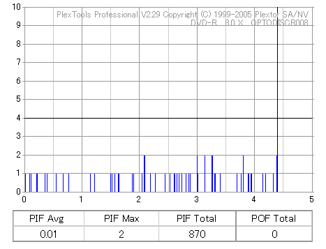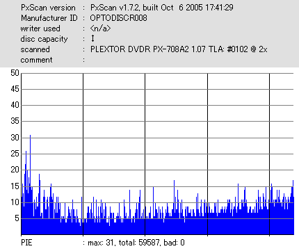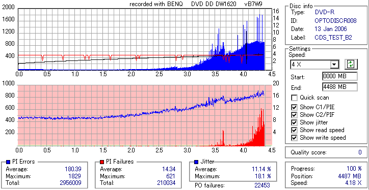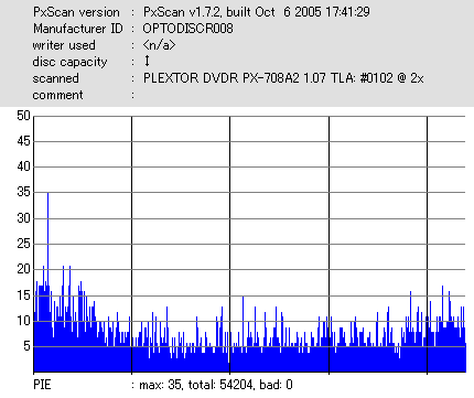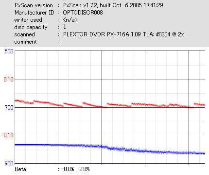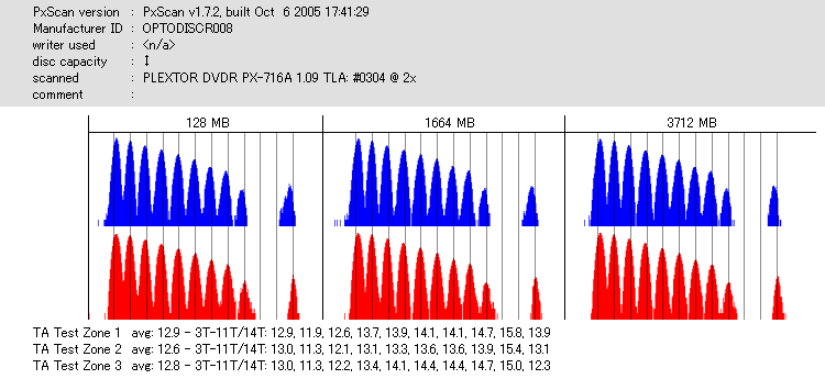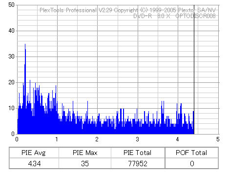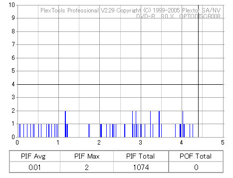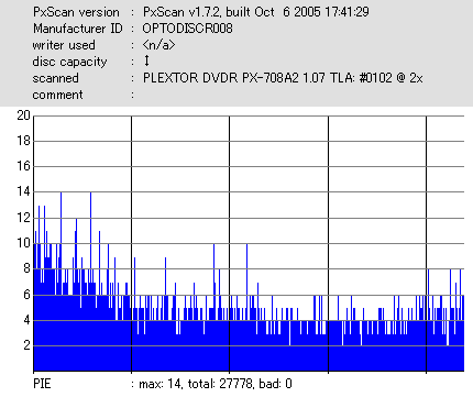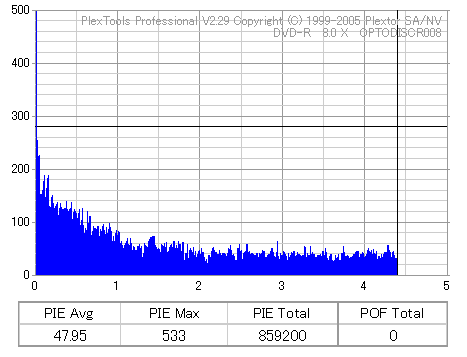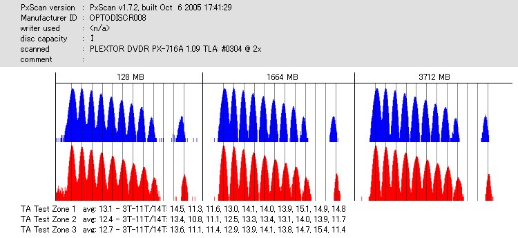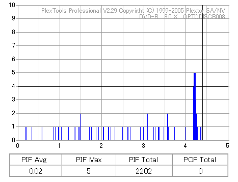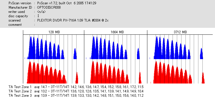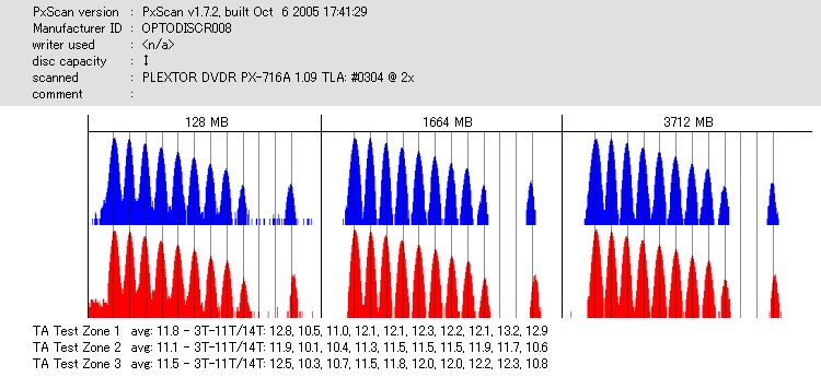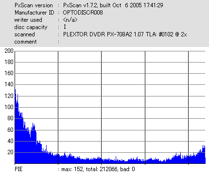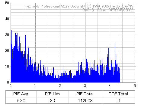 8x焼きだとどうも芳しくない結果だったので4倍で焼いてみたのですが、正直大して変わらない感じです。 PLEXTORドライブの計測結果は良好なんですが、DW1640で計測すると必ず外周が膨らんでしまいます。 諦めて容量を抑えて焼くのが良いでしょう。 |
