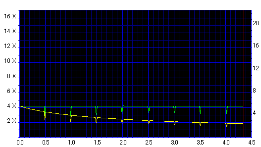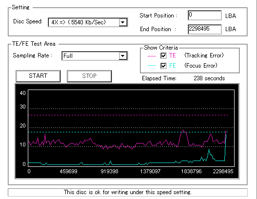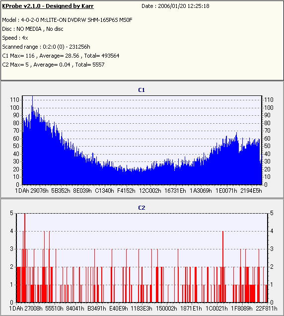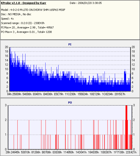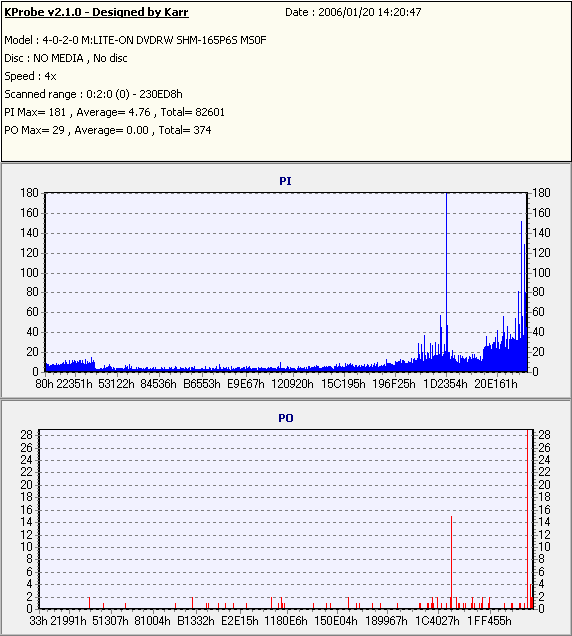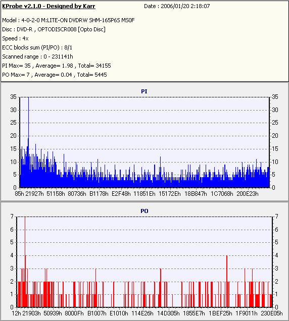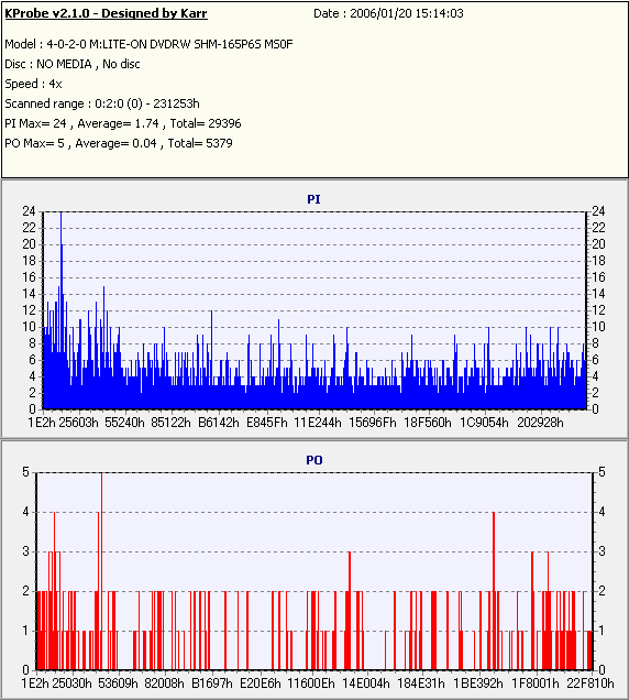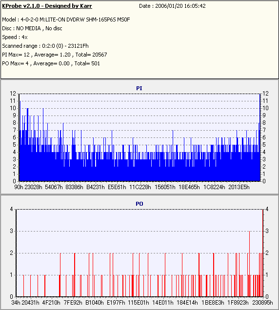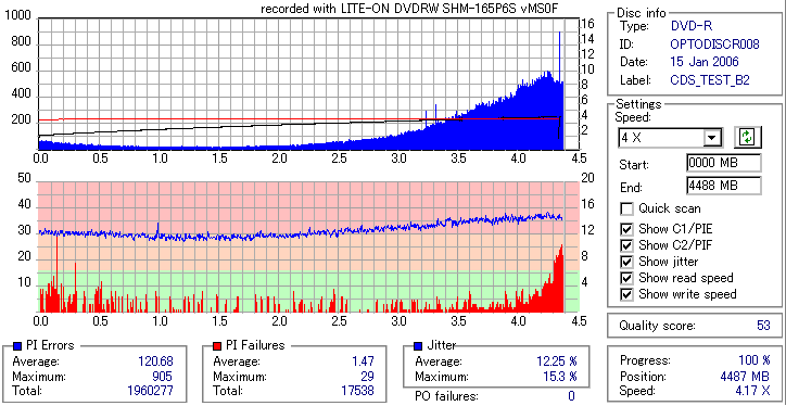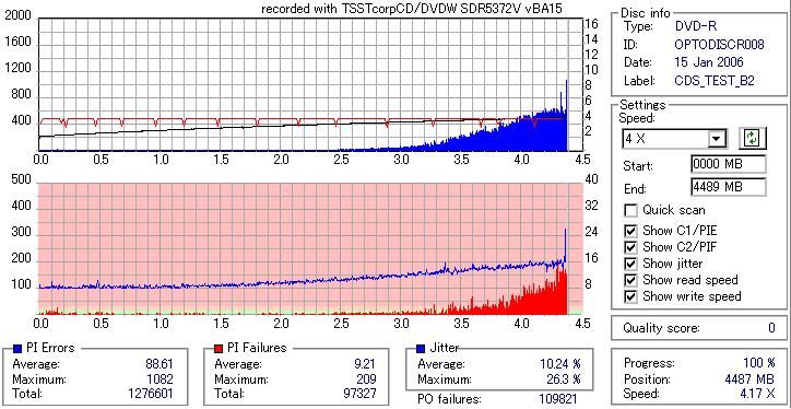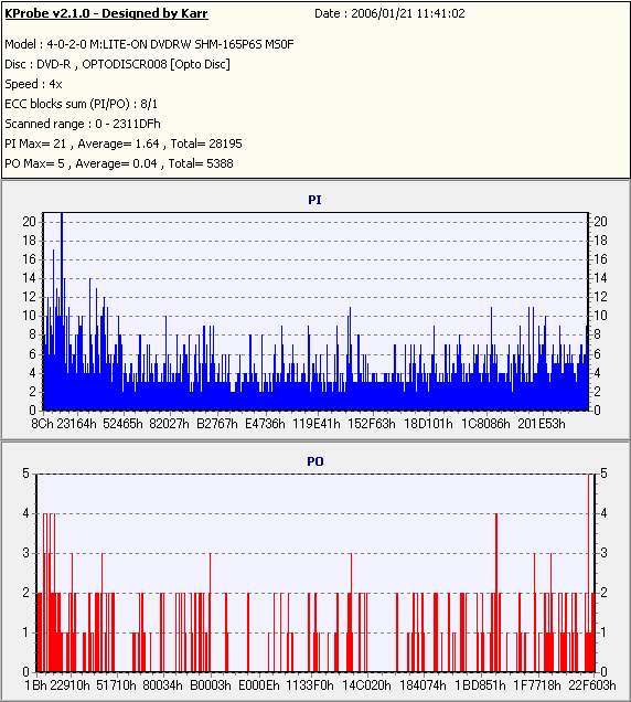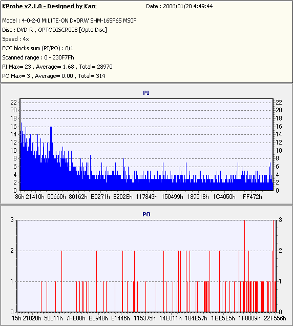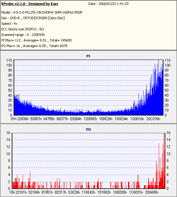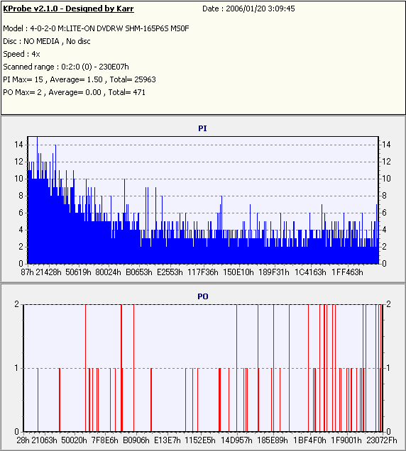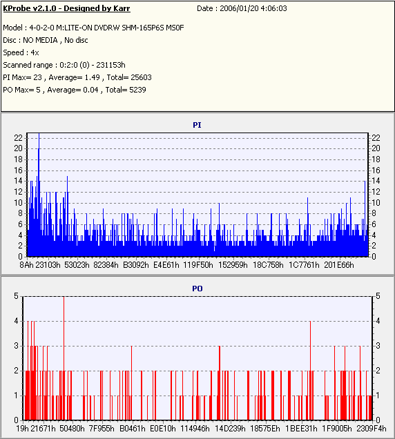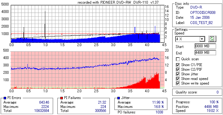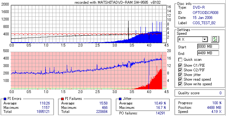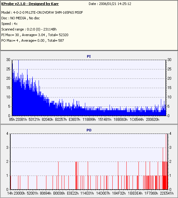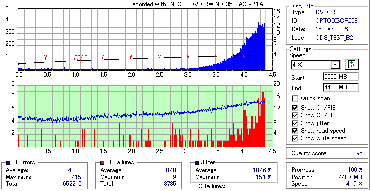 8x焼きだとどうも芳しくない結果だったので4倍で焼いてみたのですが、正直大して変わらない感じです。 PLEXTORドライブの計測結果は良好なんですが、DW1640で計測すると必ず外周が膨らんでしまいます。 諦めて容量を抑えて焼くのが良いでしょう。 |