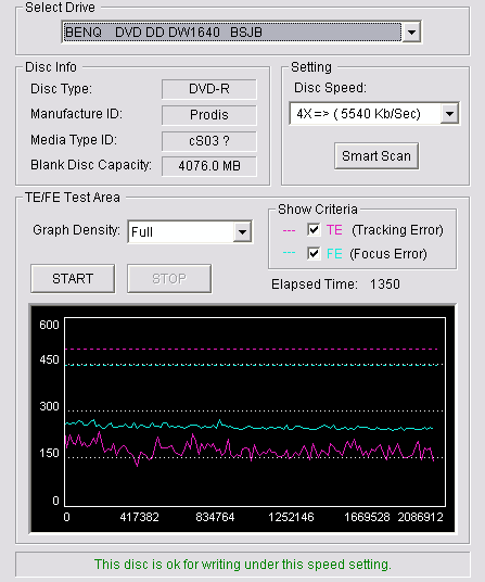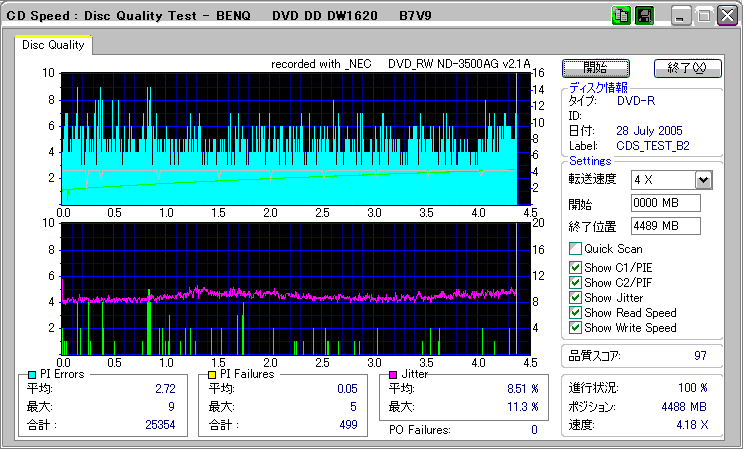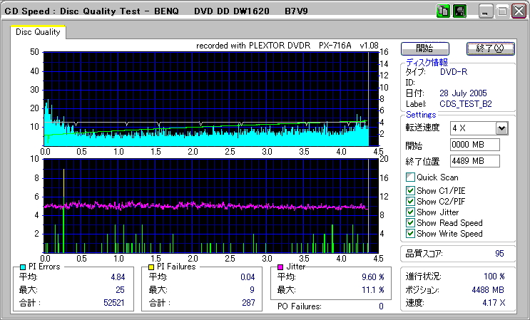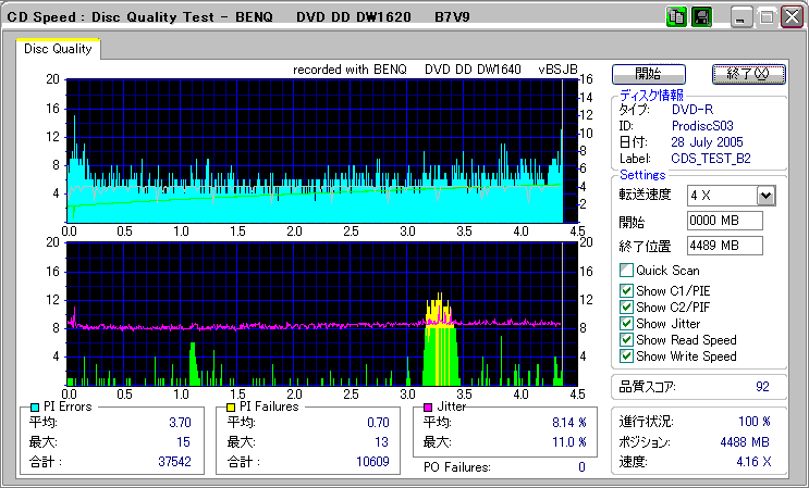 CDSpeed + BenQ DW1620Rの品質テスト(4x CAV PIE/PIF/Jitter/POF) |