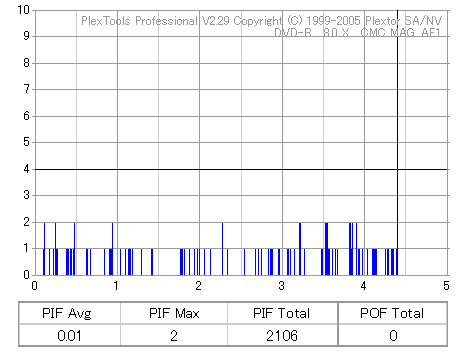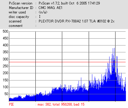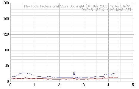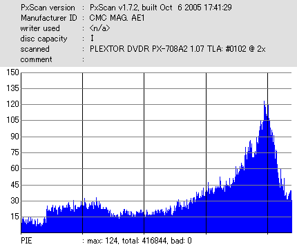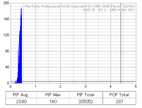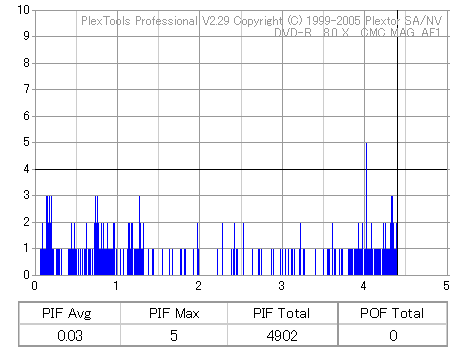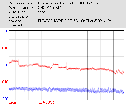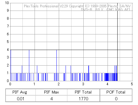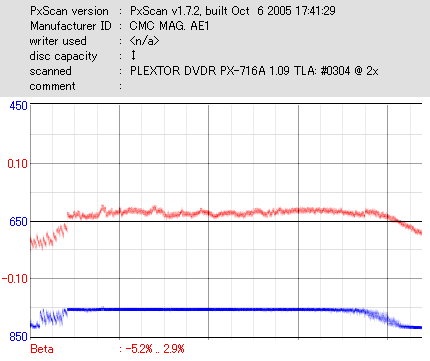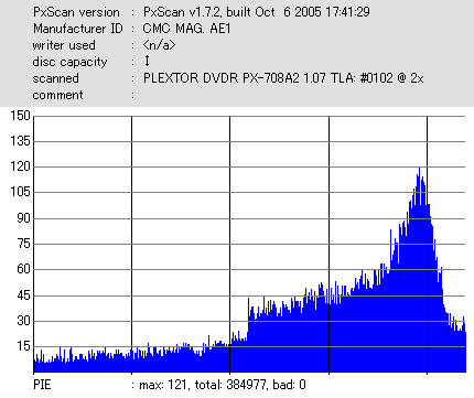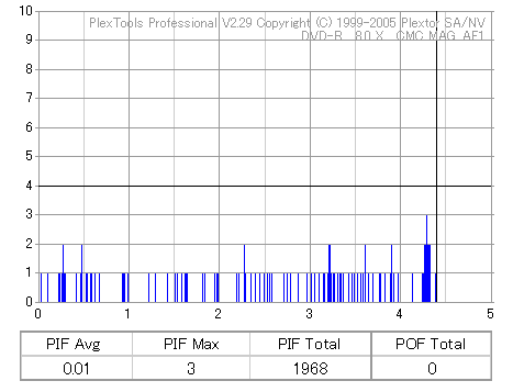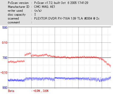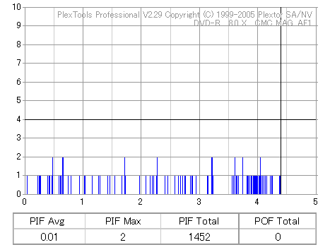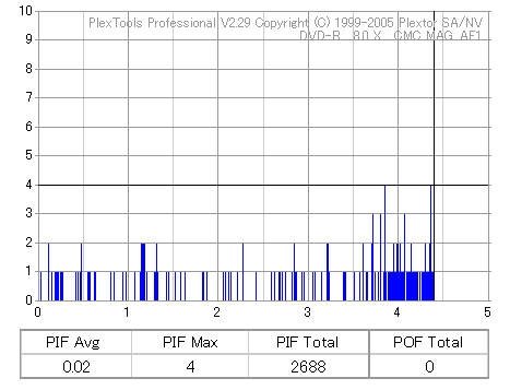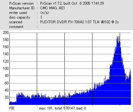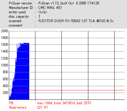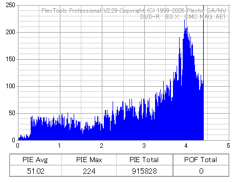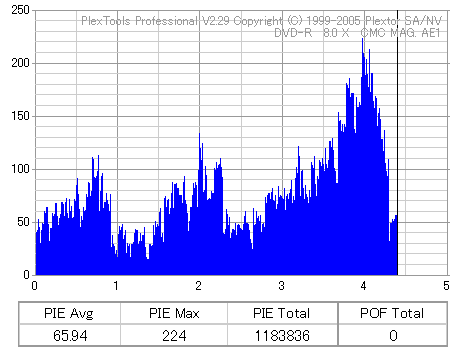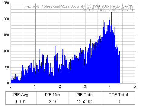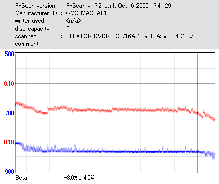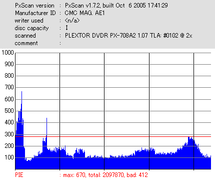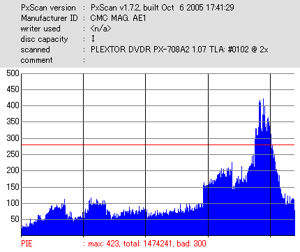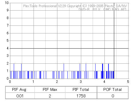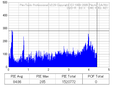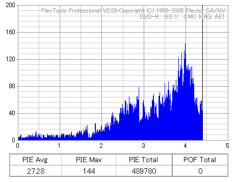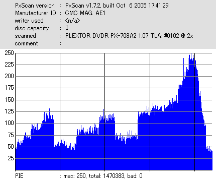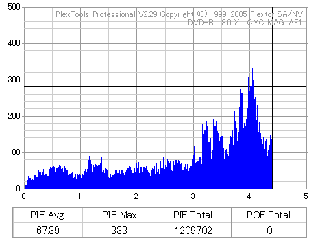 久々のCMC。どうやら今回のはハズレだったようで、外周にエラーが突出する感じです。 規格値ギリギリか少しオーバーする程と、度何とも嫌らしい値が多いので、記録品位の問題で返品するのは難しそう。 まあ、使えなくはないでしょう。ハズレ引いてしまったら配布用とかに早めに使いきってしまうのが吉です。 |