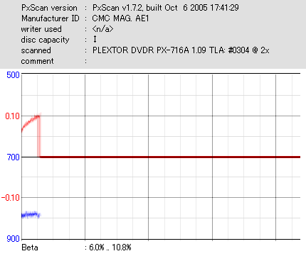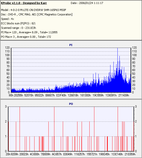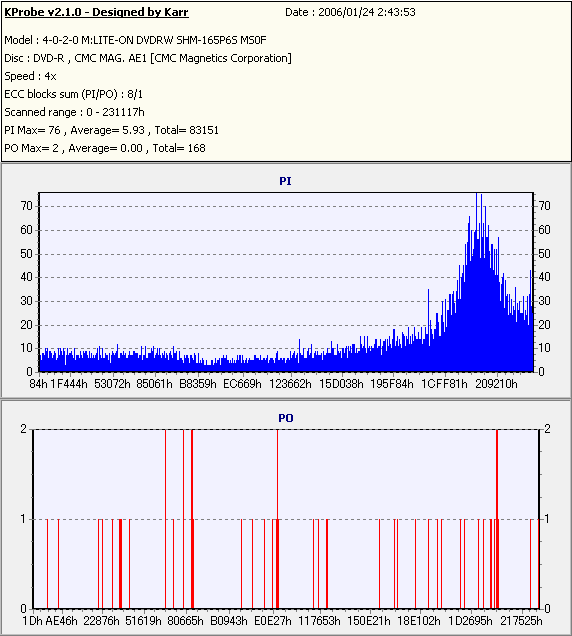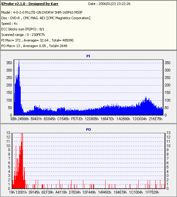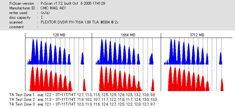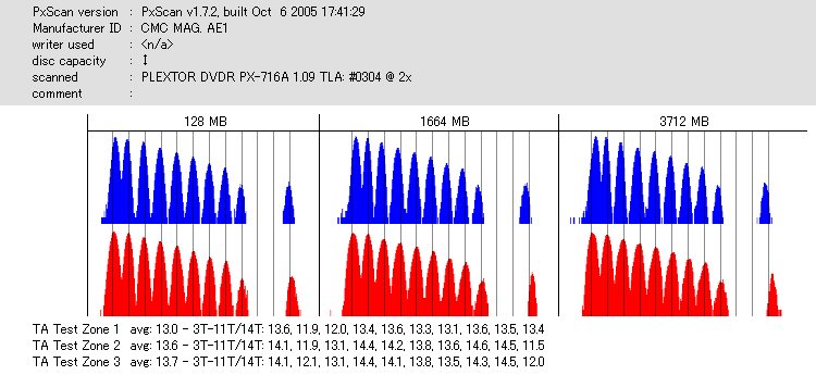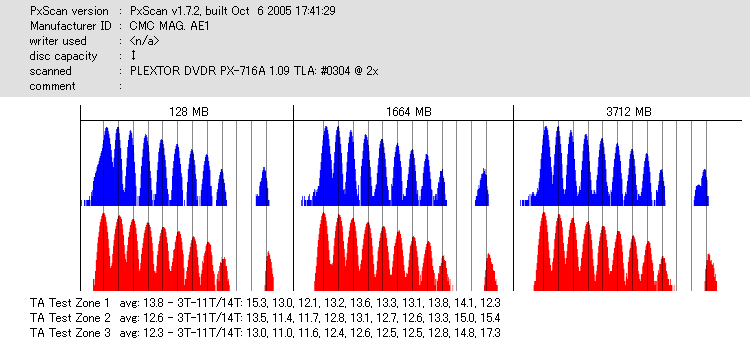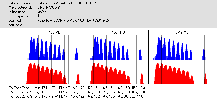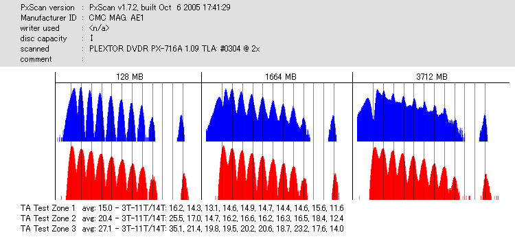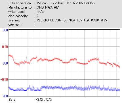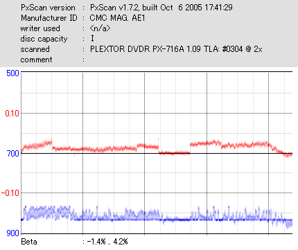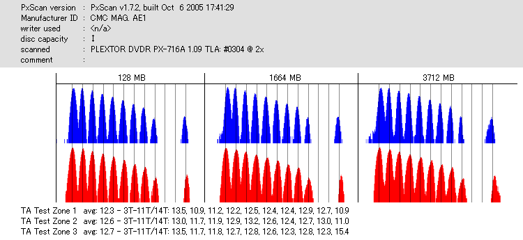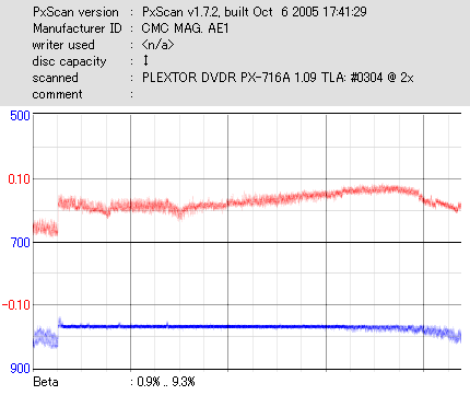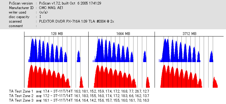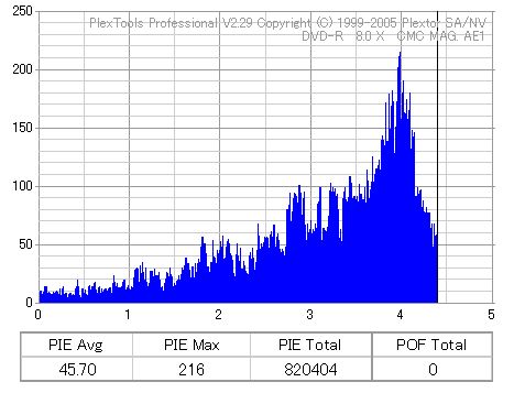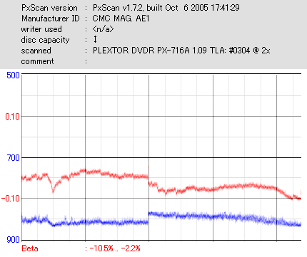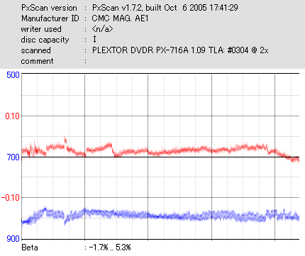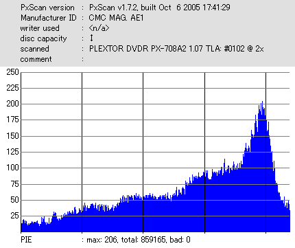久々のCMC。どうやら今回のはハズレだったようで、外周にエラーが突出する感じです。 規格値ギリギリか少しオーバーする程と、度何とも嫌らしい値が多いので、記録品位の問題で返品するのは難しそう。 まあ、使えなくはないでしょう。ハズレ引いてしまったら配布用とかに早めに使いきってしまうのが吉です。 |