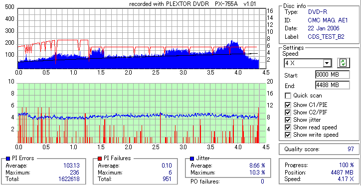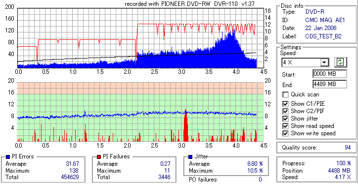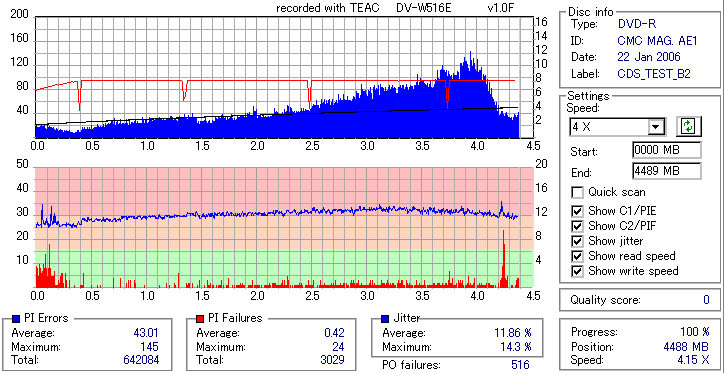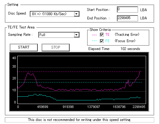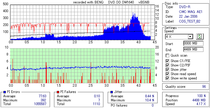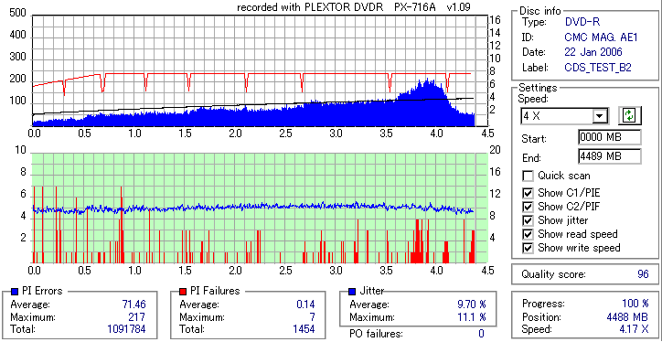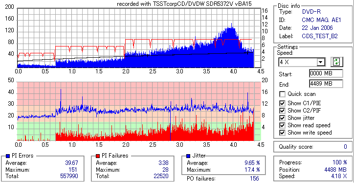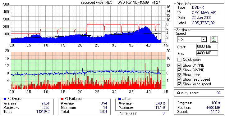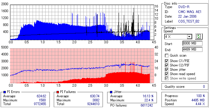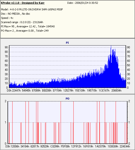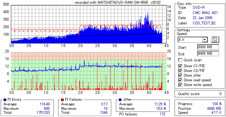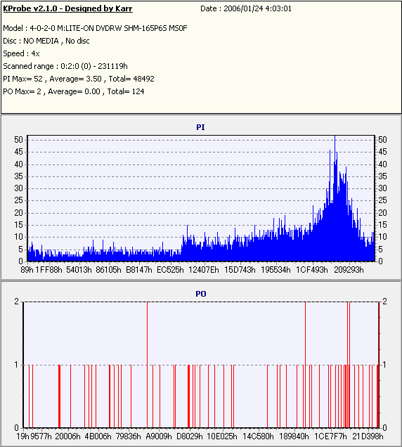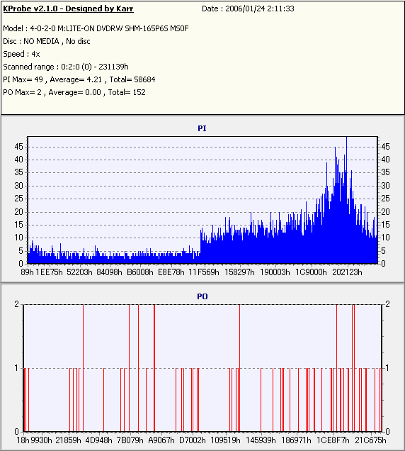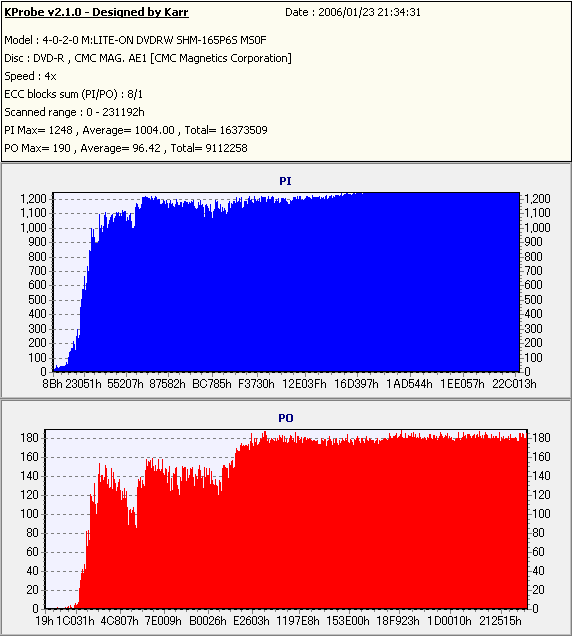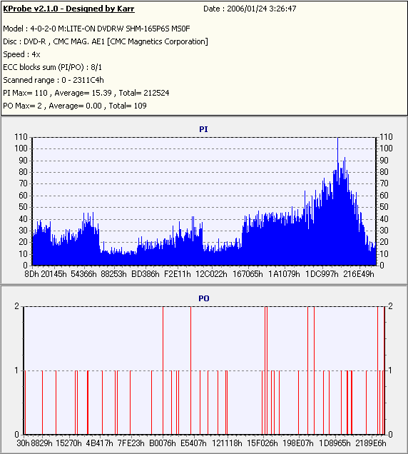 久々のCMC。どうやら今回のはハズレだったようで、外周にエラーが突出する感じです。 規格値ギリギリか少しオーバーする程と、度何とも嫌らしい値が多いので、記録品位の問題で返品するのは難しそう。 まあ、使えなくはないでしょう。ハズレ引いてしまったら配布用とかに早めに使いきってしまうのが吉です。 |