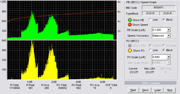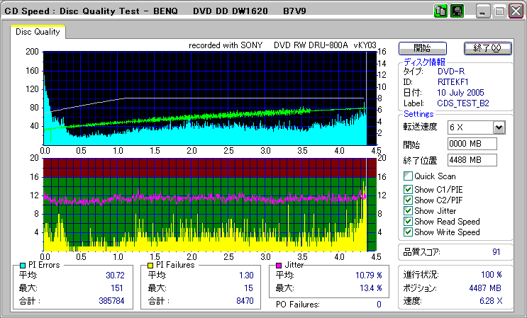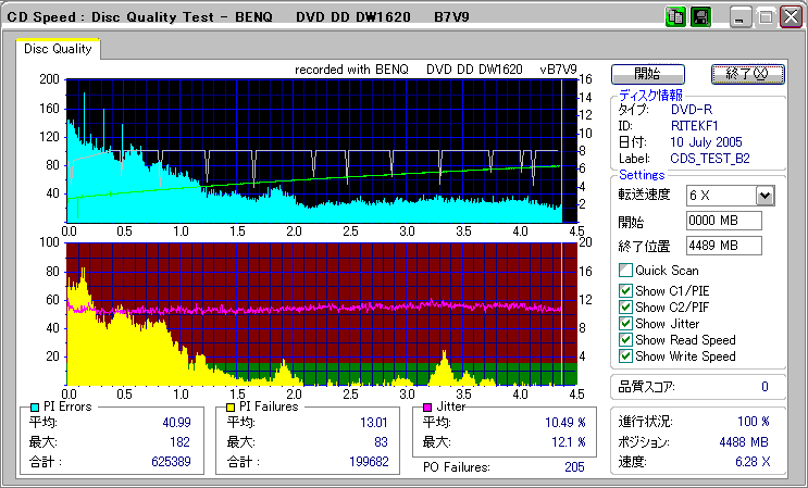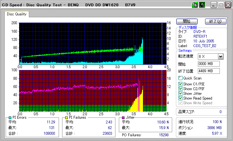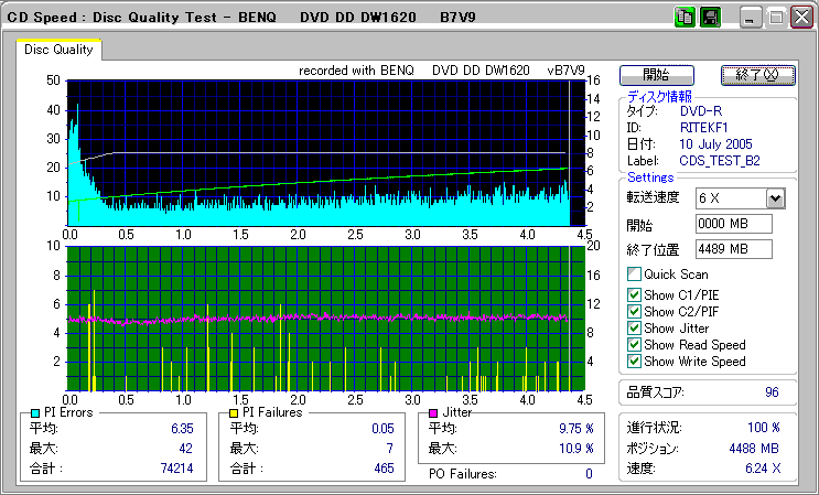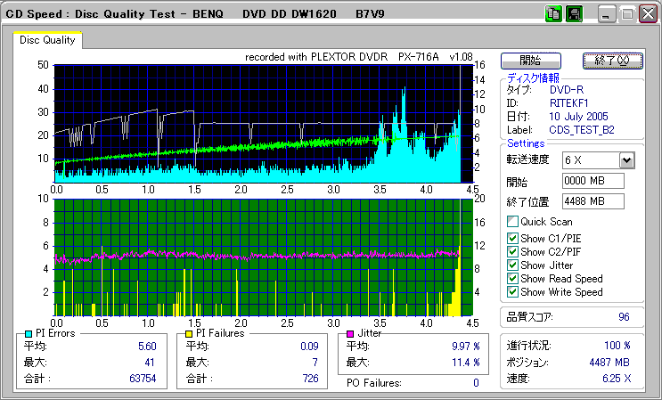 CDSpeed + BenQ DW1620Rの品質テスト(6x CAV PIE/PIF/Jitter/POF) |