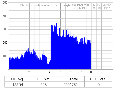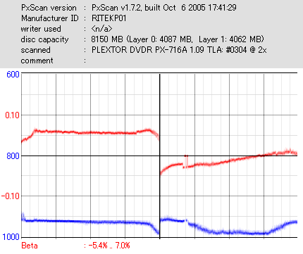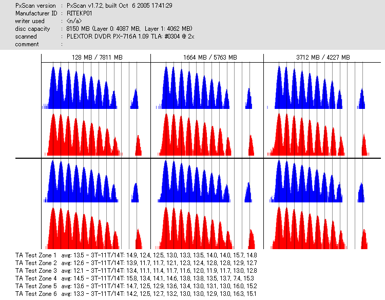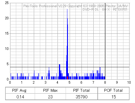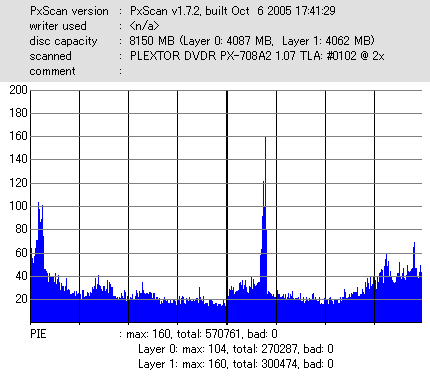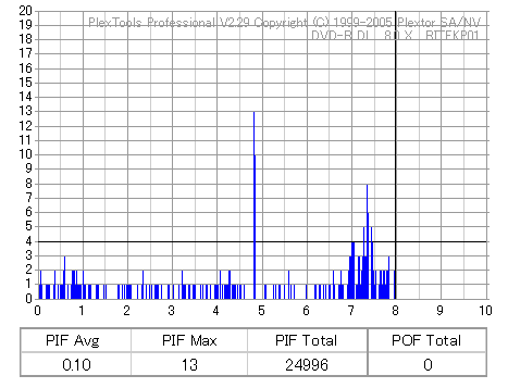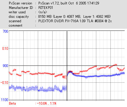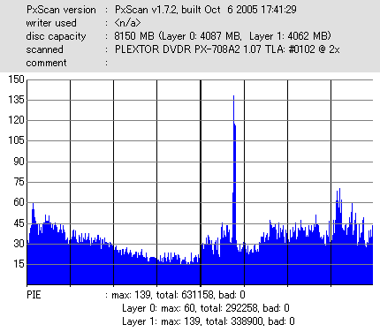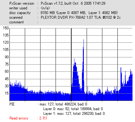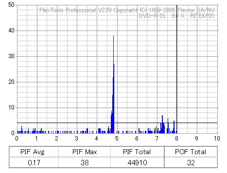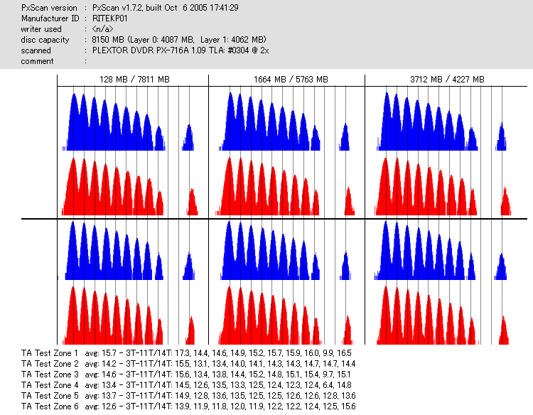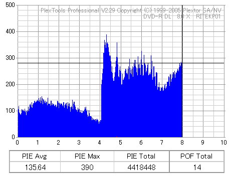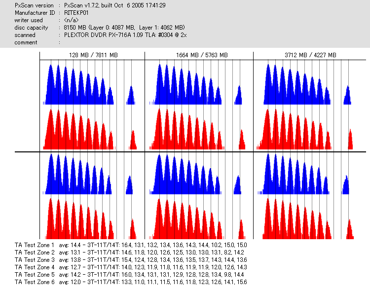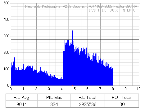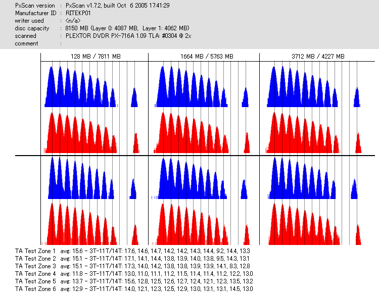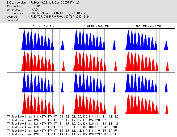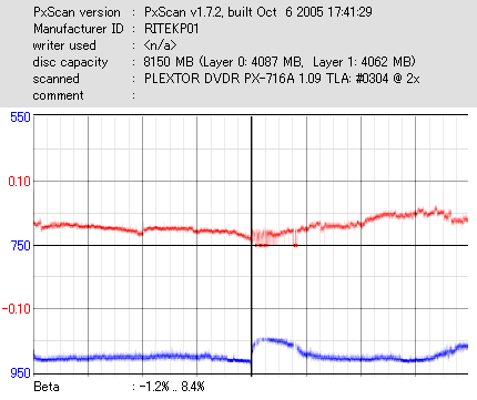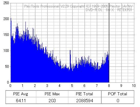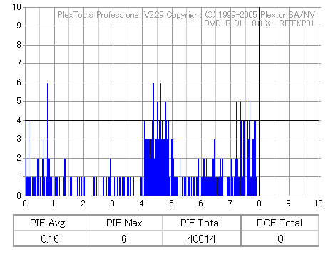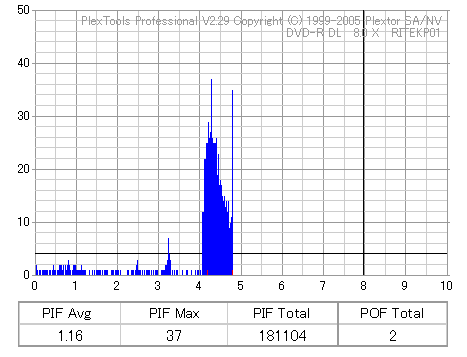 0000 - 01 02 91 FD D1 0A 60 00 02 00 00 00 33 2B 00 00 - ......`.....3+.. 0010 - 03 52 49 54 45 4B 50 00 04 30 31 00 00 00 00 00 - .RITEKP..01..... 0020 - 05 00 00 00 00 00 00 00 F4 DC 05 00 FF FF FF FF - ................ 0030 - 60 DD 05 00 F0 88 FA 77 60 38 F5 77 FF FF FF FF - `......w`8.w.... 0040 - E3 39 F9 77 FE 18 D8 77 3B 19 D8 77 60 F7 01 13 - .9.w...w;..w`... 0050 - 02 00 00 80 1C 00 00 00 0B 00 00 00 58 00 00 00 - ............X... 0060 - 1C 00 00 00 98 DD 05 00 40 00 00 00 00 00 01 00 - ........@....... 各社ドライブの対応状況は次の通り。 pioneer DVR-110 ...... 2x PLEXTOR PX-755A ...... 4x PLEXTOR PX-716A ...... 2x-4x BenQ DW1620R ...... マウントできない BenQ DW1640 ...... 4x LITEON SHM-165P6S ...... 2x-4x TSST SD-R5372V ...... 2x NEC ND-4550A ...... 速度が表示されない LG GSA-4167B ...... 2x SONY DW-G110A ...... 2x-4x TEAC DV-W516E ...... 2x-4x 思った通り、対応ドライブはかなり少ないです。(個人的に、ND-4550Aが駄目だったのがややショック) 焼くならBenQ、プレク、LITEONといったところでしょうか。 TEACも一見対応してるように見えますが、多分不明なメディアに対しても元からこの速度対応なんでしょう。 ファーム1.0F内にRITEKP01の表記はなかったと思います。 +R DLと違い市場に出回って間もないためか、ディスク内周に気泡は見られず、かなり丁寧な作りです。 あと、内周の刻印なんですが……記録面側の層はJ3で始まる刻印なんですが、レーベル面側はJ6です。 肝心の品質の方は……SHM-165P6Sの結果が使えなくもなさそうなものになってますが、基本的にまだ対応が甘く、 PX-716Aでさえまともに焼きに行ってくれないのが現状のようです。これなら日本に入ってきてもしばし様子見が良いでしょう。 ・・・・・・しかし米国、安いなぁ。購入時の為替レート(\116.08/USD)で換算すると1枚\230切ってますよ。 |