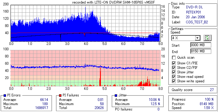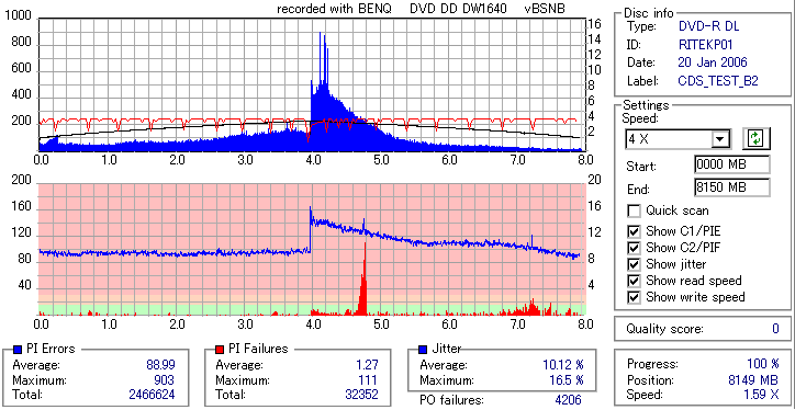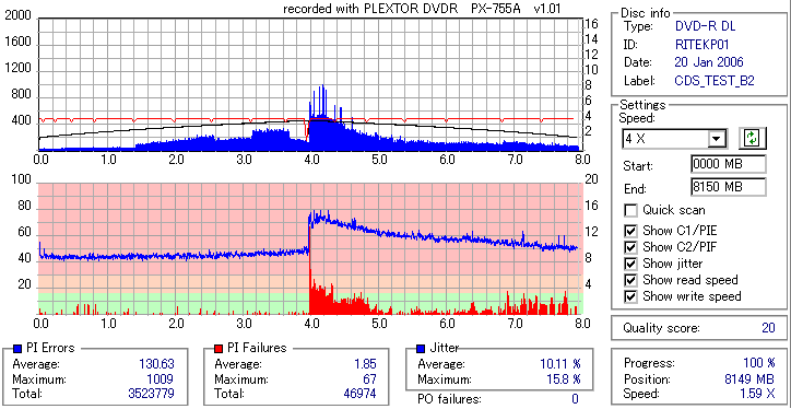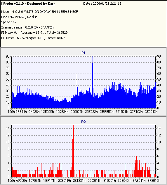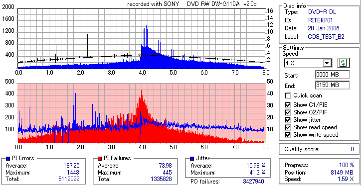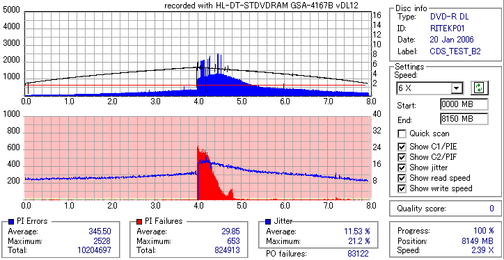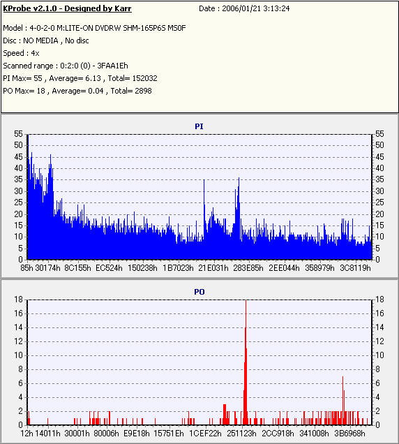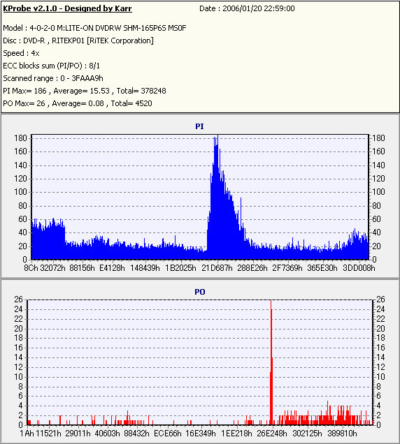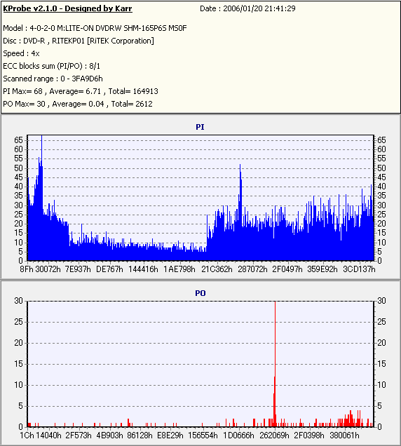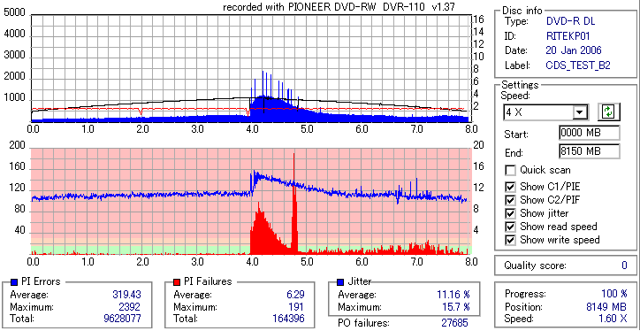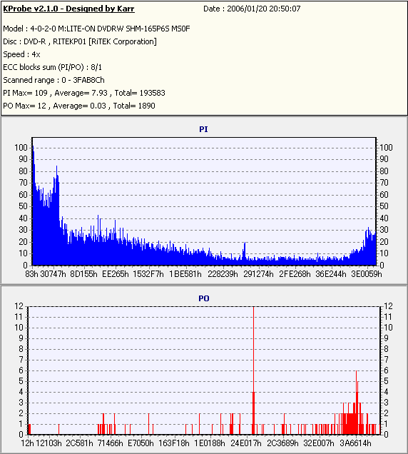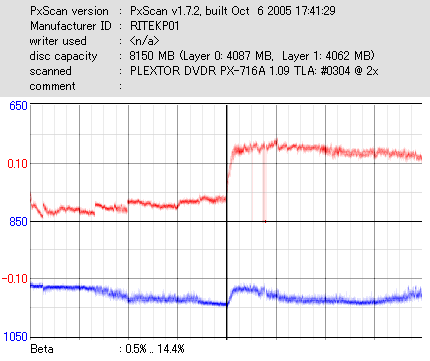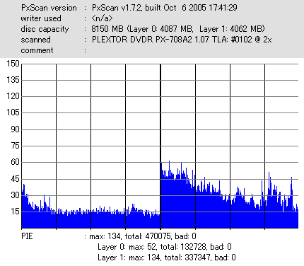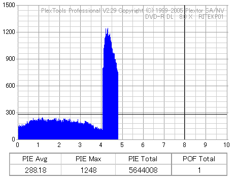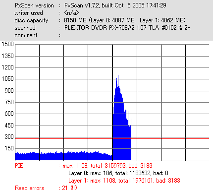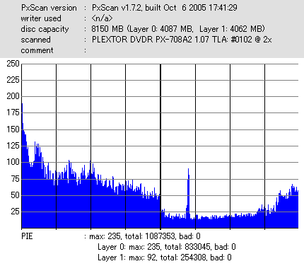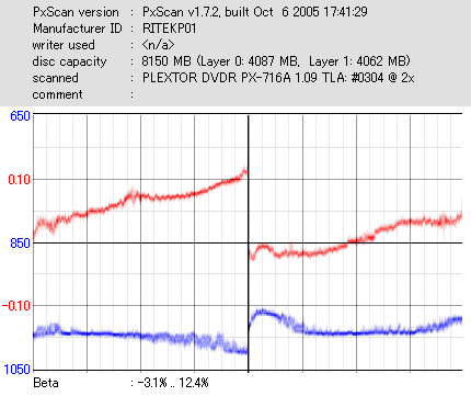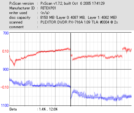 0000 - 01 02 91 FD D1 0A 60 00 02 00 00 00 33 2B 00 00 - ......`.....3+.. 0010 - 03 52 49 54 45 4B 50 00 04 30 31 00 00 00 00 00 - .RITEKP..01..... 0020 - 05 00 00 00 00 00 00 00 F4 DC 05 00 FF FF FF FF - ................ 0030 - 60 DD 05 00 F0 88 FA 77 60 38 F5 77 FF FF FF FF - `......w`8.w.... 0040 - E3 39 F9 77 FE 18 D8 77 3B 19 D8 77 60 F7 01 13 - .9.w...w;..w`... 0050 - 02 00 00 80 1C 00 00 00 0B 00 00 00 58 00 00 00 - ............X... 0060 - 1C 00 00 00 98 DD 05 00 40 00 00 00 00 00 01 00 - ........@....... 各社ドライブの対応状況は次の通り。 pioneer DVR-110 ...... 2x PLEXTOR PX-755A ...... 4x PLEXTOR PX-716A ...... 2x-4x BenQ DW1620R ...... マウントできない BenQ DW1640 ...... 4x LITEON SHM-165P6S ...... 2x-4x TSST SD-R5372V ...... 2x NEC ND-4550A ...... 速度が表示されない LG GSA-4167B ...... 2x SONY DW-G110A ...... 2x-4x TEAC DV-W516E ...... 2x-4x 思った通り、対応ドライブはかなり少ないです。(個人的に、ND-4550Aが駄目だったのがややショック) 焼くならBenQ、プレク、LITEONといったところでしょうか。 TEACも一見対応してるように見えますが、多分不明なメディアに対しても元からこの速度対応なんでしょう。 ファーム1.0F内にRITEKP01の表記はなかったと思います。 +R DLと違い市場に出回って間もないためか、ディスク内周に気泡は見られず、かなり丁寧な作りです。 あと、内周の刻印なんですが……記録面側の層はJ3で始まる刻印なんですが、レーベル面側はJ6です。 肝心の品質の方は……SHM-165P6Sの結果が使えなくもなさそうなものになってますが、基本的にまだ対応が甘く、 PX-716Aでさえまともに焼きに行ってくれないのが現状のようです。これなら日本に入ってきてもしばし様子見が良いでしょう。 ・・・・・・しかし米国、安いなぁ。購入時の為替レート(\116.08/USD)で換算すると1枚\230切ってますよ。 |